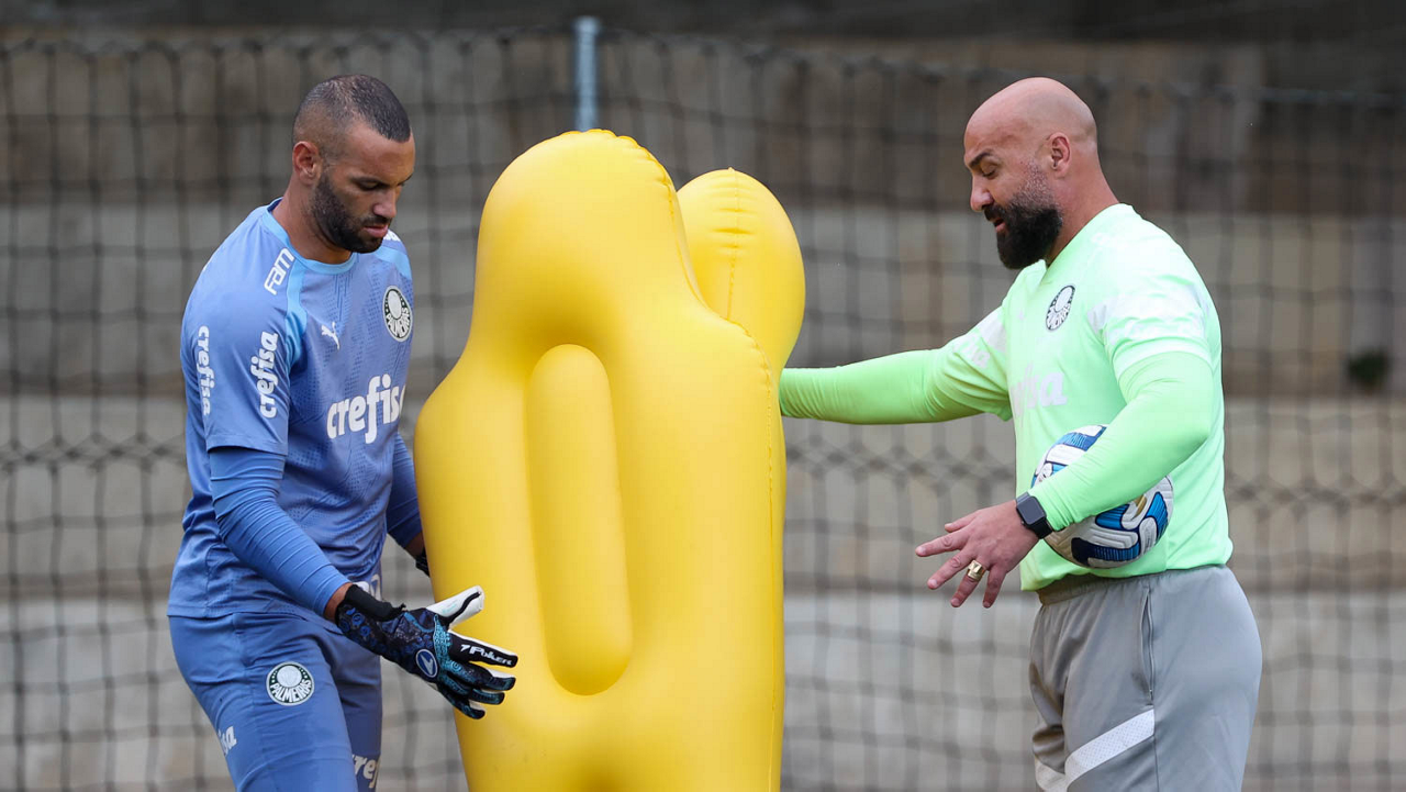 O preparador de goleiro Rogerio Godoy e o goleiro Weverton (E), da SE Palmeiras, durante treinamento, na CT do Sócrates Valência. (Foto: Cesar Greco/Palmeiras/by Canon)