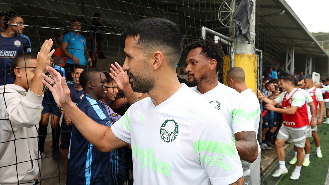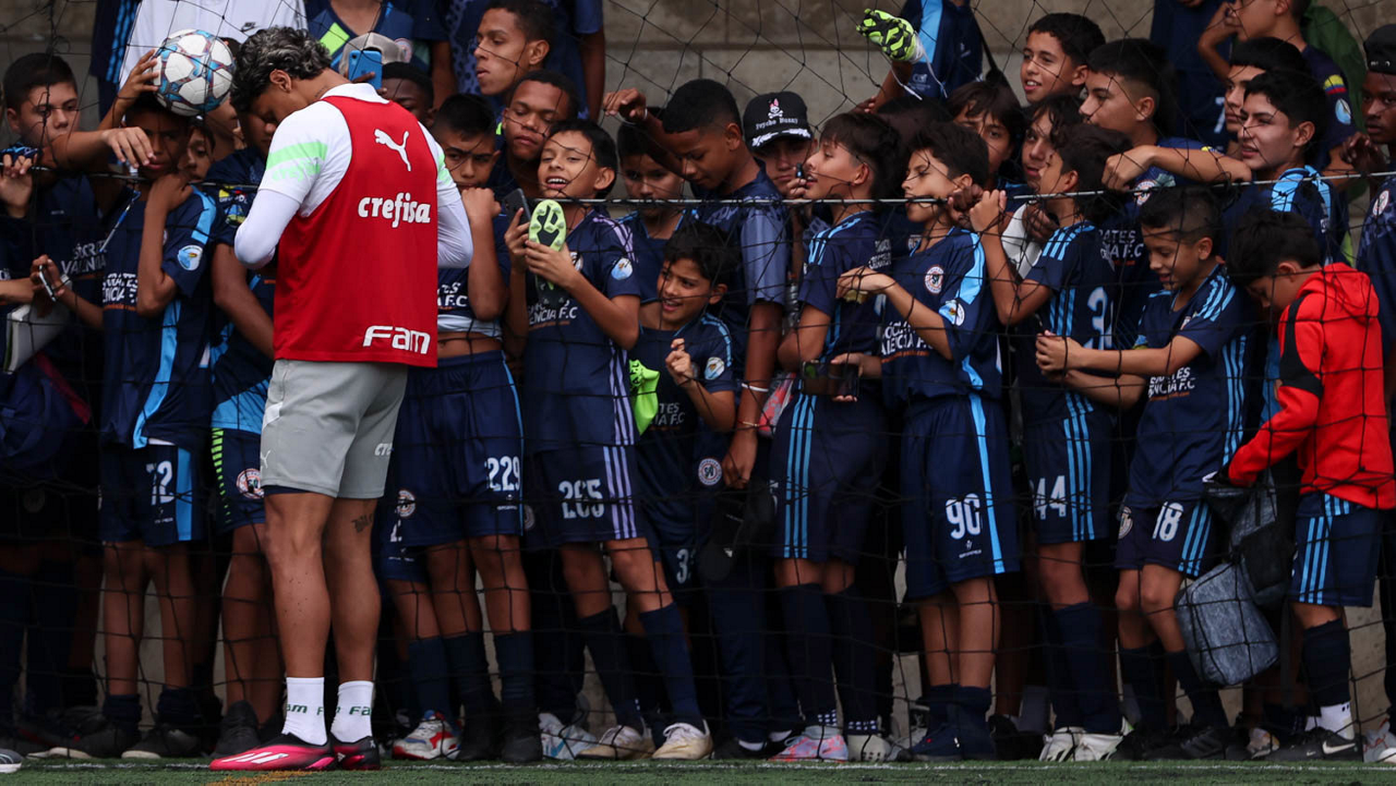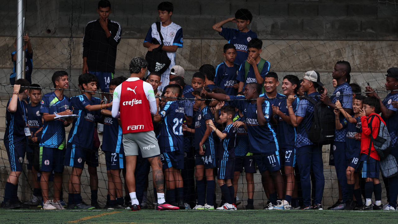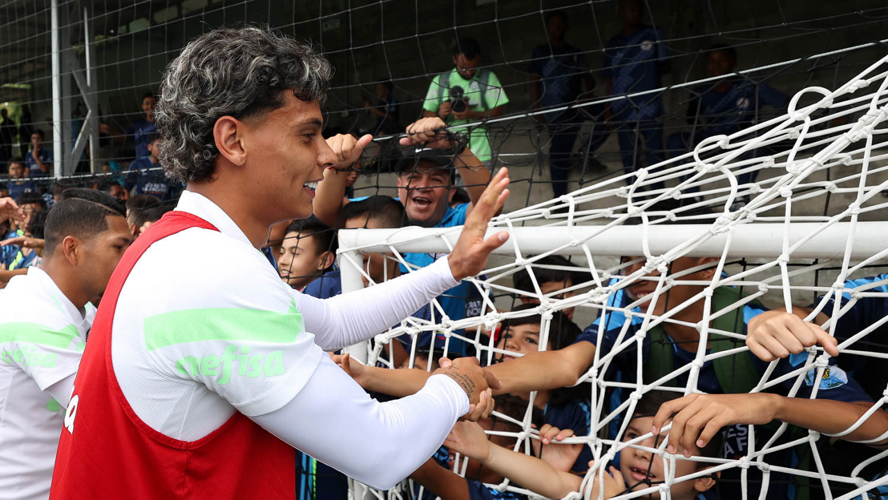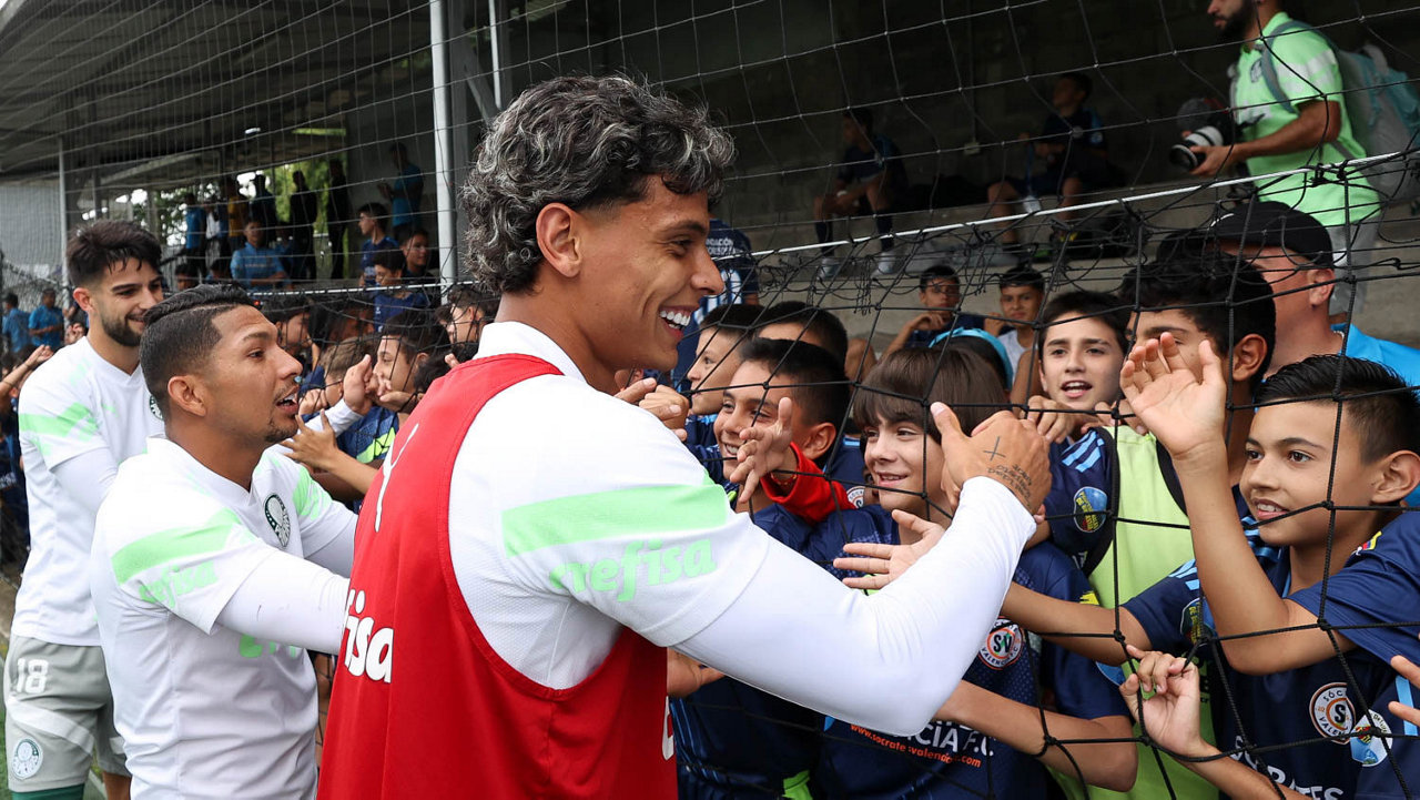 O jogador Richard Ríos, da SE Palmeiras, cumprimenta os jogadores das categorias de base do Sócrates Valência, após treinamento. (Foto: Cesar Greco/Palmeiras/by Canon)