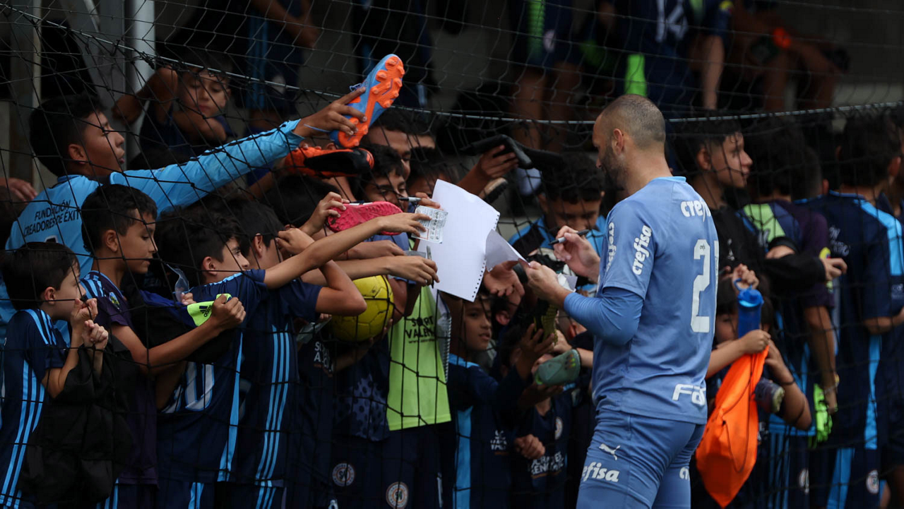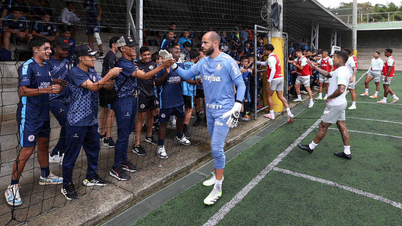 O goleiro Weverton, da SE Palmeiras, cumprimenta os jogadores das categorias de base do Sócrates Valência, após treinamento. (Foto: Cesar Greco/Palmeiras/by Canon)