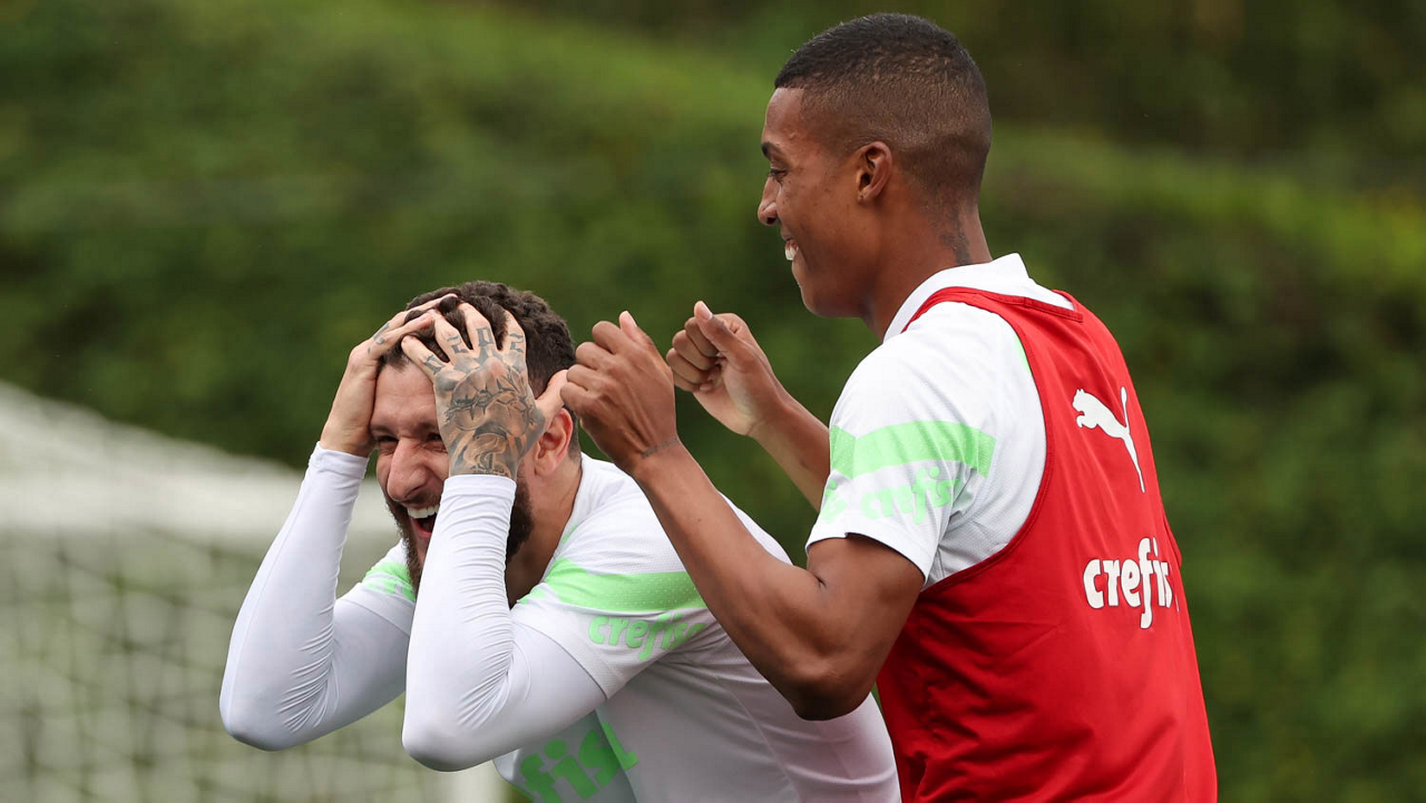 Os jogadores Murilo e Breno Lopes (D), da SE Palmeiras, durante treinamento, na CT do Sócrates Valência. (Foto: Cesar Greco/Palmeiras/by Canon)