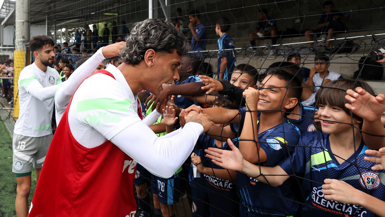 O jogador Kevin, da SE Palmeiras, cumprimenta os jogadores das categorias de base do Sócrates Valência, após treinamento. (Foto: Cesar Greco/Palmeiras/by Canon)