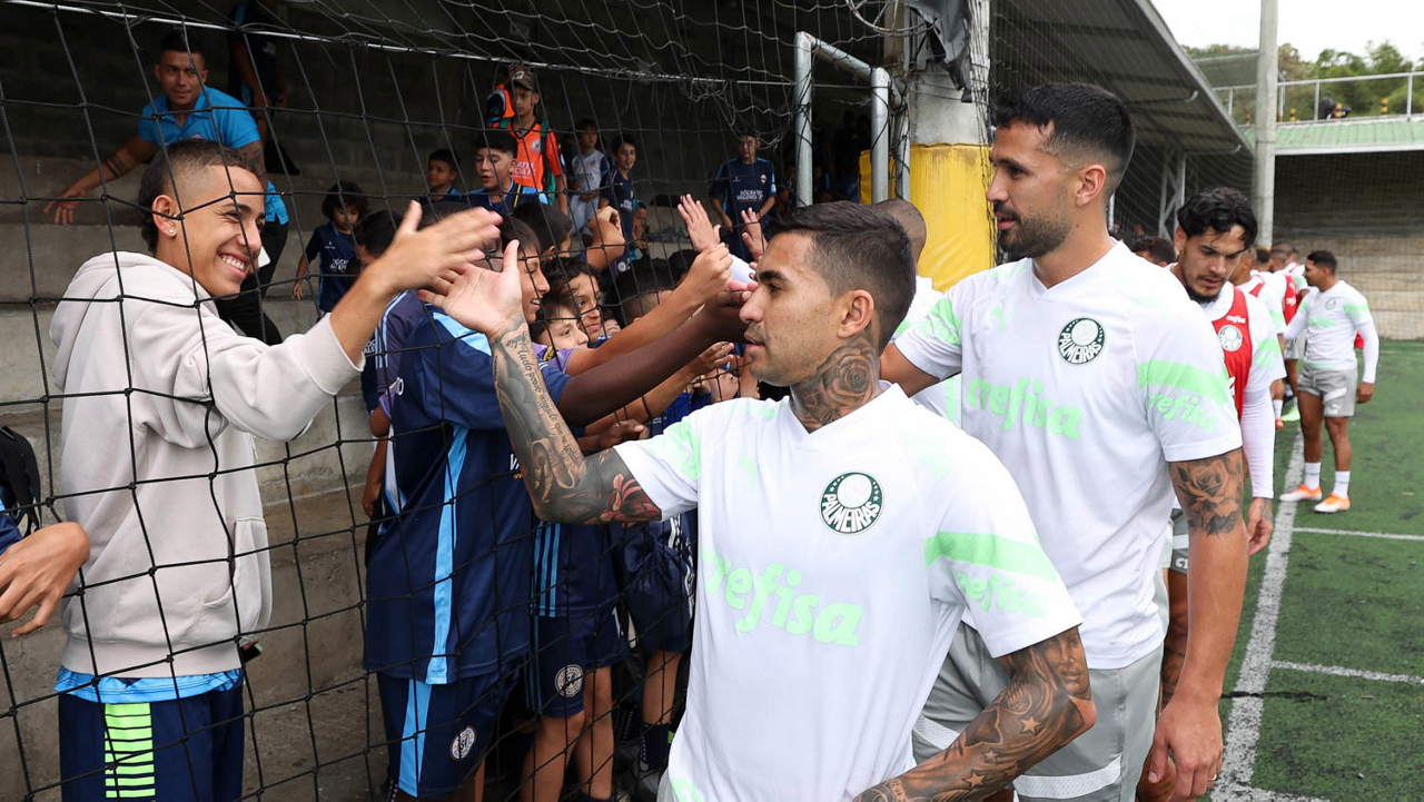 Os jogadores Dudu e Luan (D), da SE Palmeiras, cumprimentam os jogadores das categorias de base do Sócrates Valência, após treinamento. (Foto: Cesar Greco/Palmeiras/by Canon)