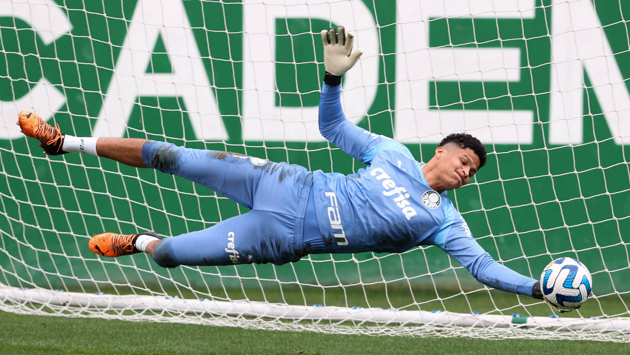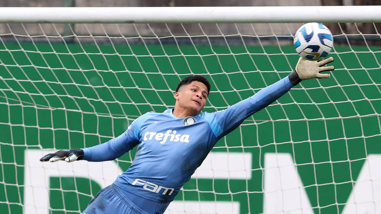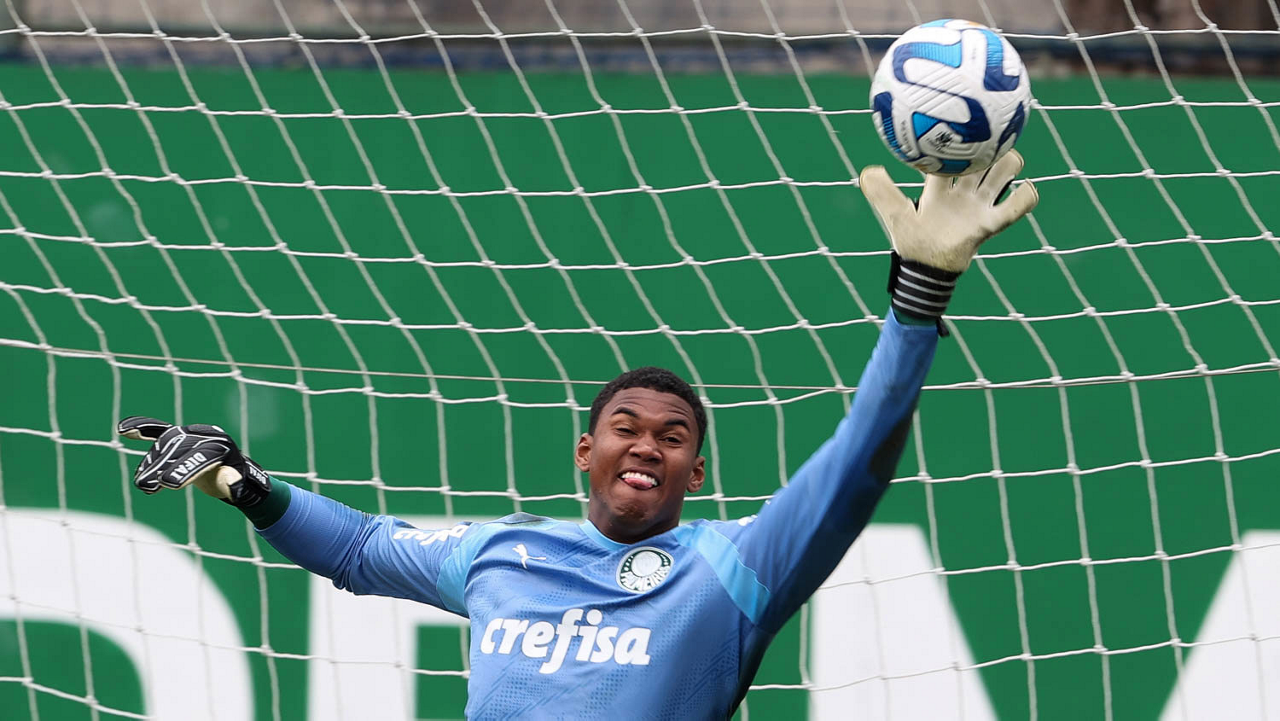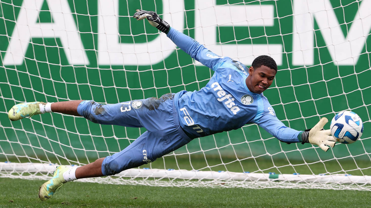 O goleiro Kaique, da SE Palmeiras, durante treinamento, na Academia de Futebol. (Foto: Cesar Greco/Palmeiras/by Canon)