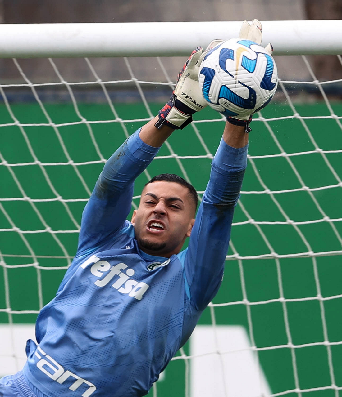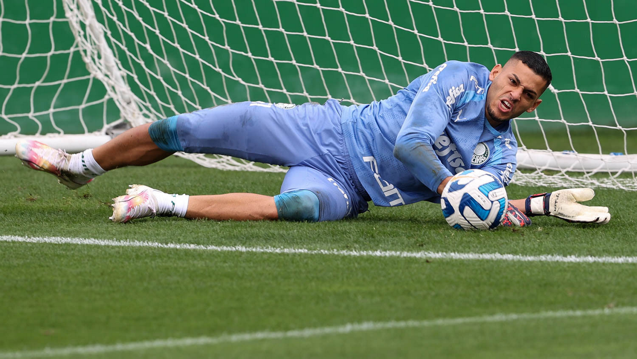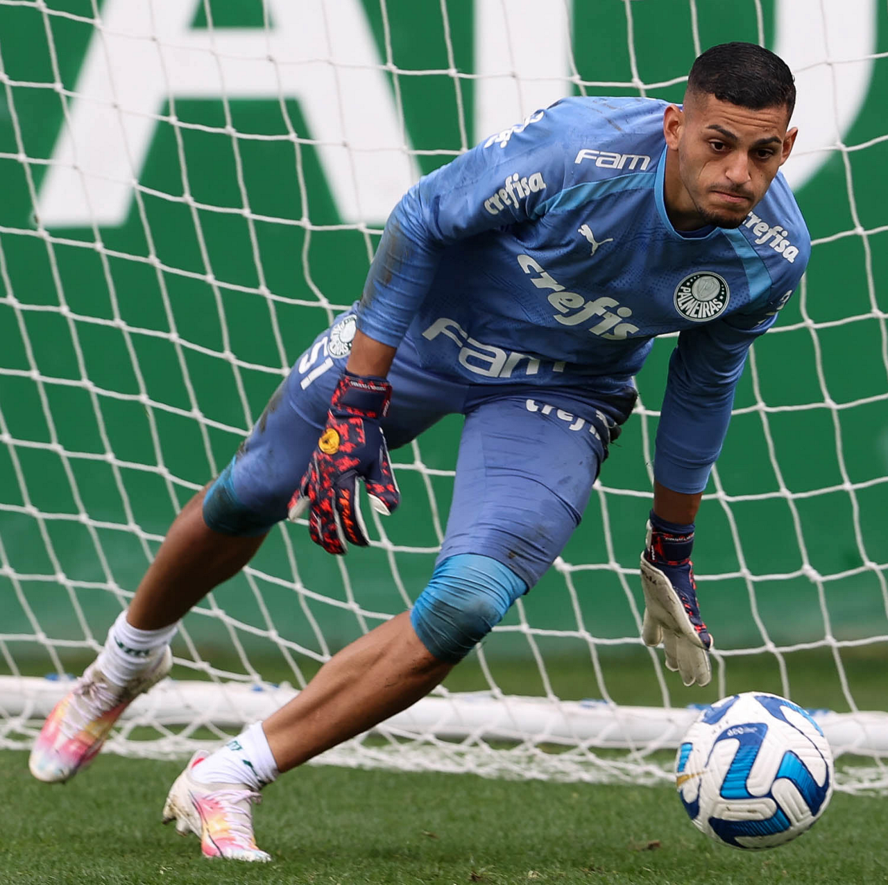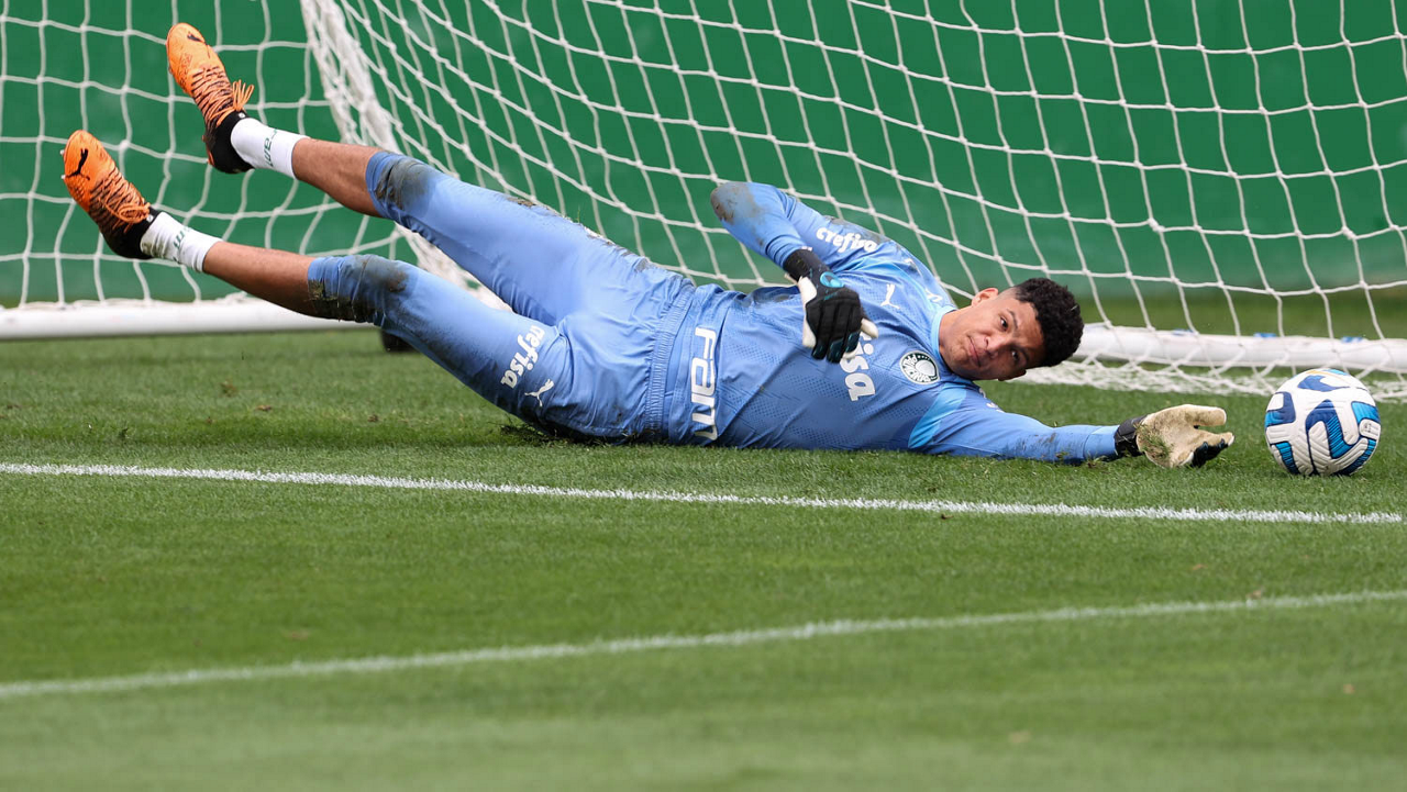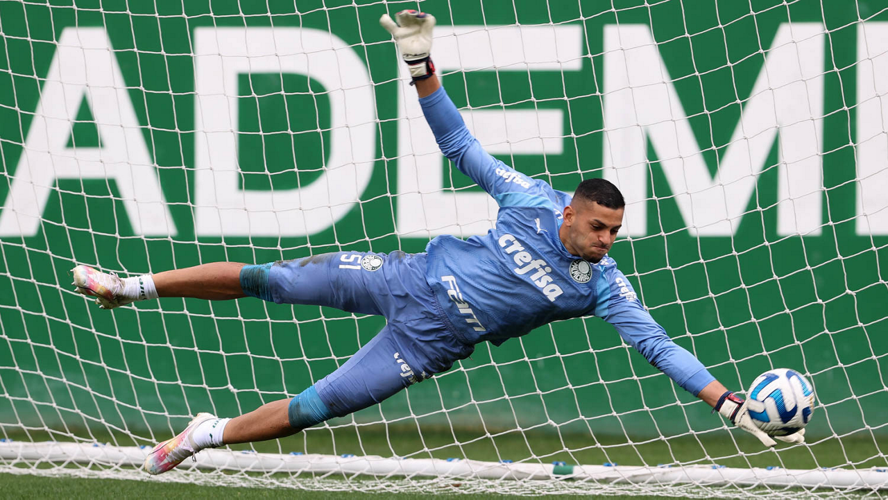 O goleiro Mateus, da SE Palmeiras, durante treinamento, na Academia de Futebol. (Foto: Cesar Greco/Palmeiras/by Canon)