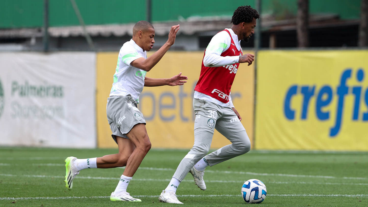 Os jogadores Luan e Jailson (D), da SE Palmeiras, durante treinamento, na Academia de Futebol. (Foto: Cesar Greco/Palmeiras/by Canon)