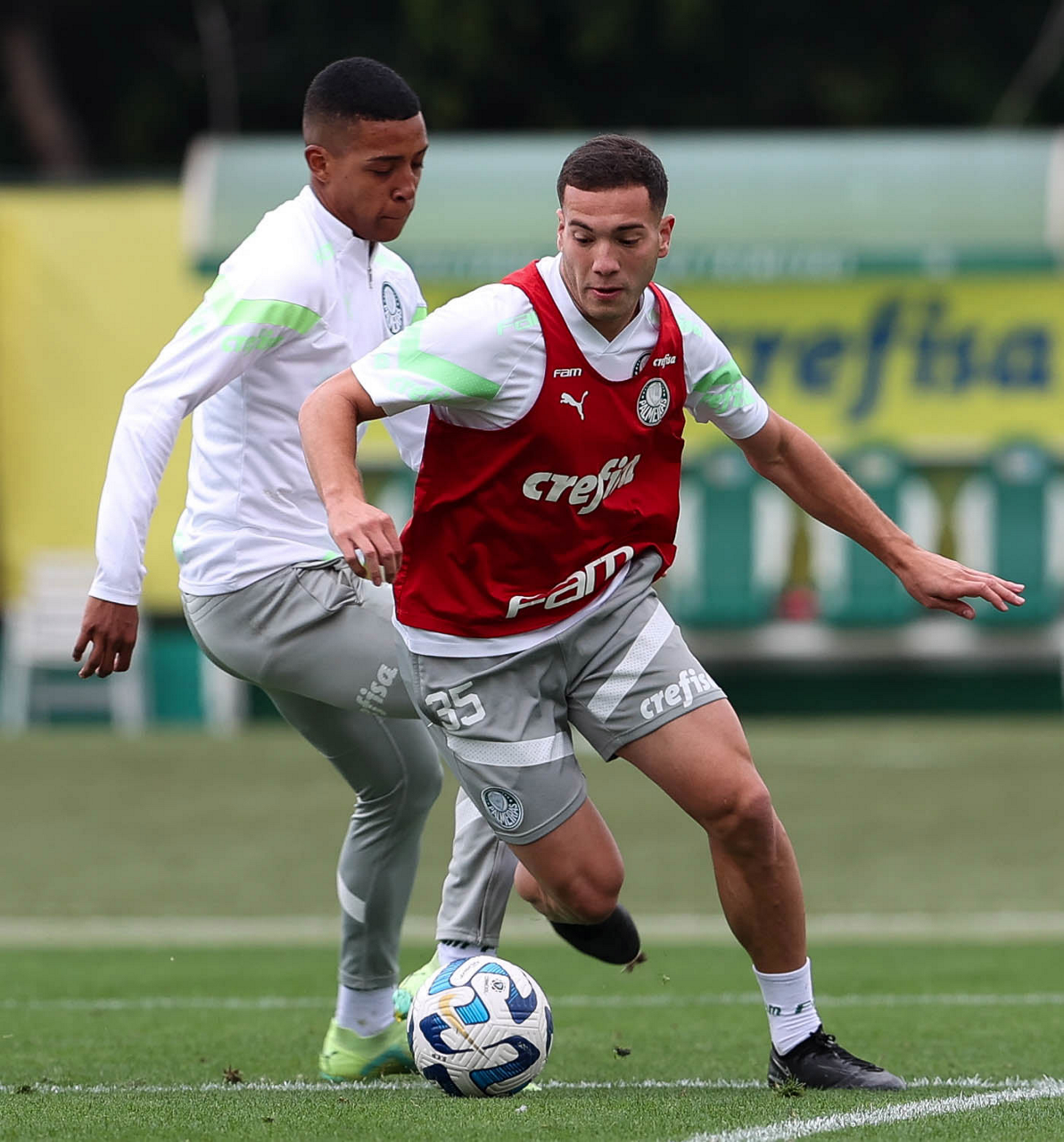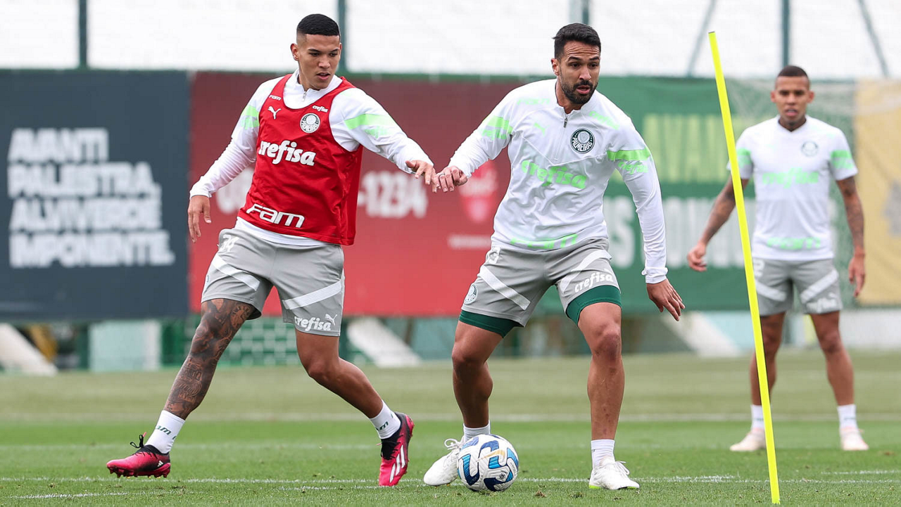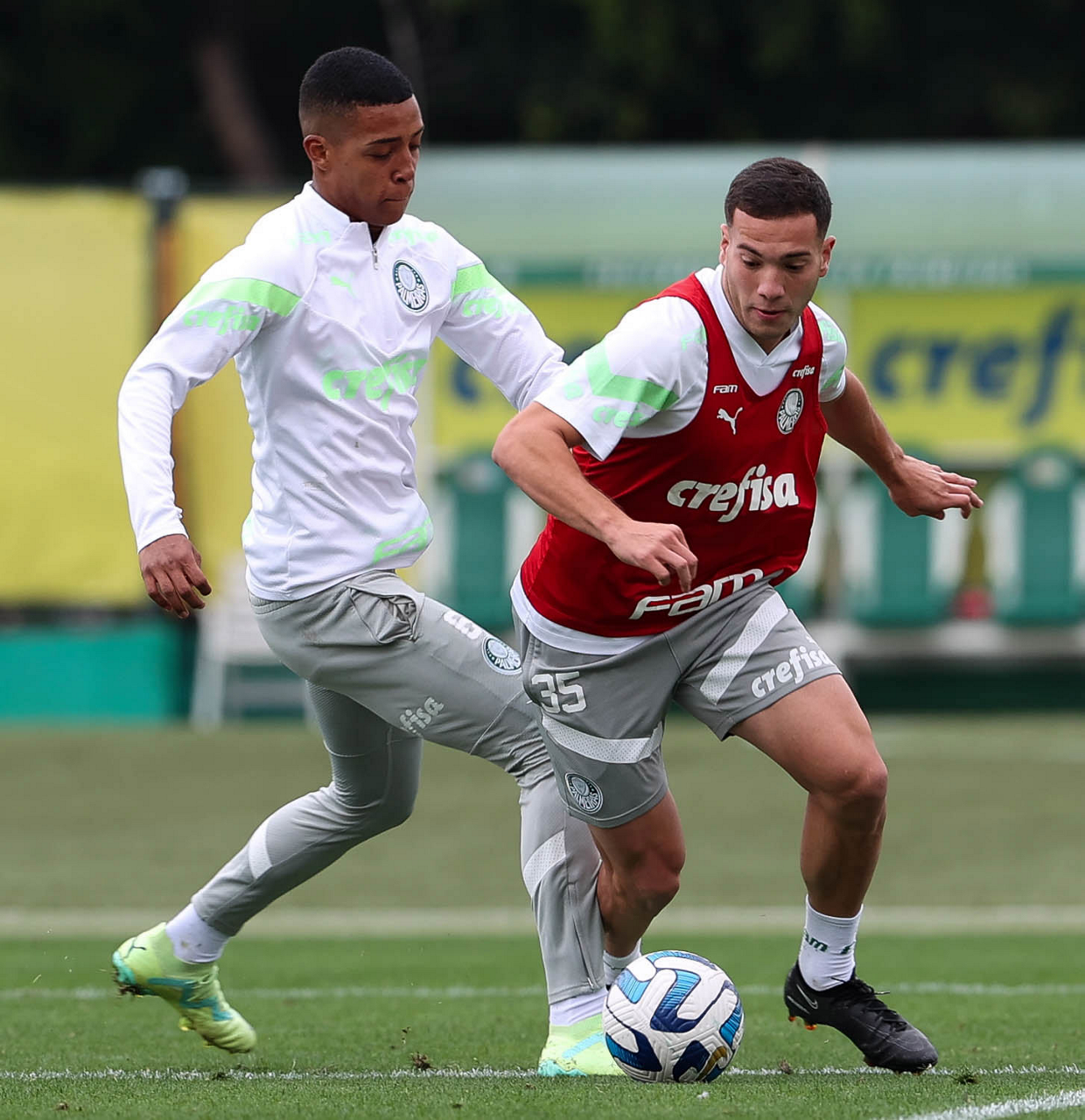 Os jogadores Vanderlan e Fabinho (D), da SE Palmeiras, durante treinamento, na Academia de Futebol. (Foto: Cesar Greco/Palmeiras/by Canon)
