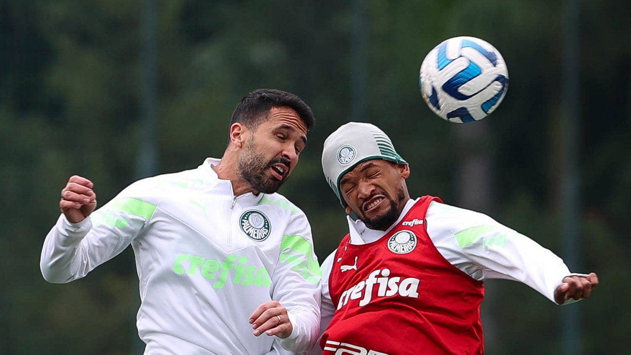 Os jogadores Jhonatan e Jailson (D), da SE Palmeiras, durante treinamento, na Academia de Futebol. (Foto: Cesar Greco/Palmeiras/by Canon)