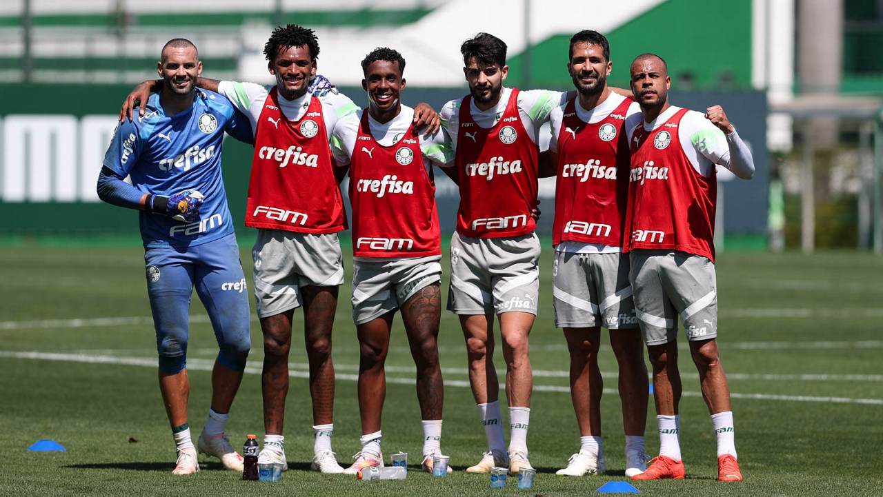 O goleiro Weverton e os jogadores Jailson, Kevin, Flaco López, Luan e Mayke (E/D), da SE Palmeiras, durante treinamento, na Academia de Futebol. (Foto: Cesar Greco/Palmeiras/by Canon)