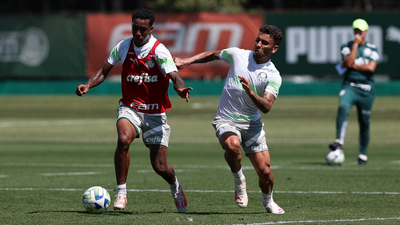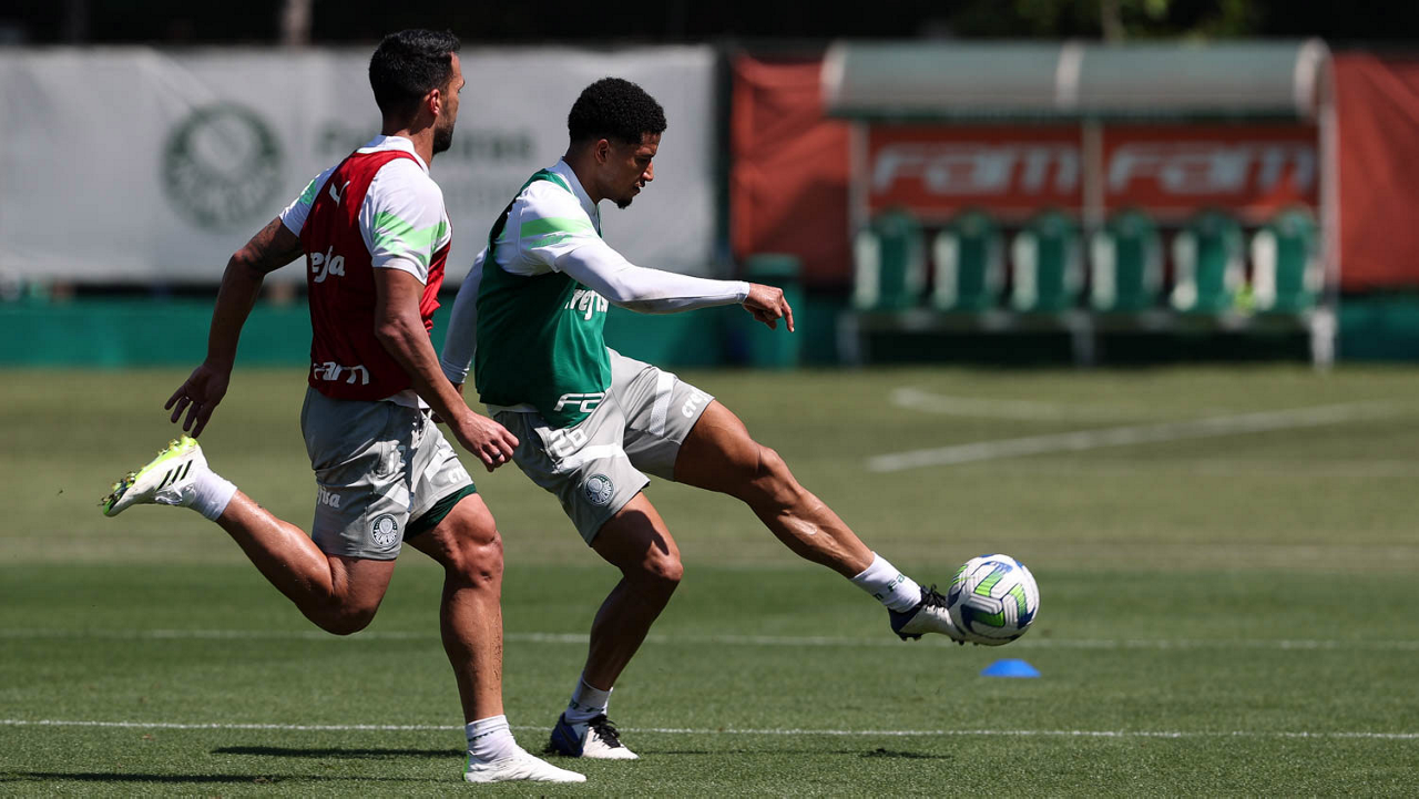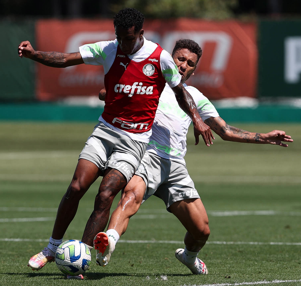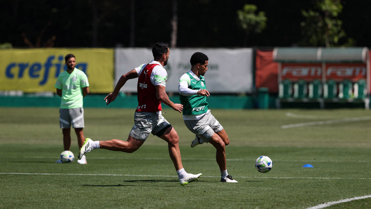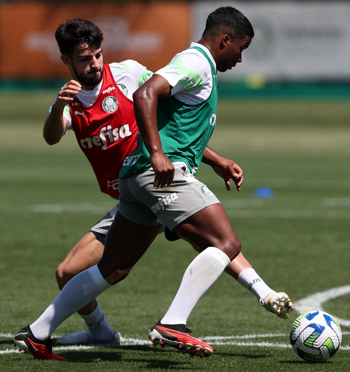 Os jogadores Flaco López e Endrick (D), da SE Palmeiras, durante treinamento, na Academia de Futebol. (Foto: Cesar Greco/Palmeiras/by Canon)