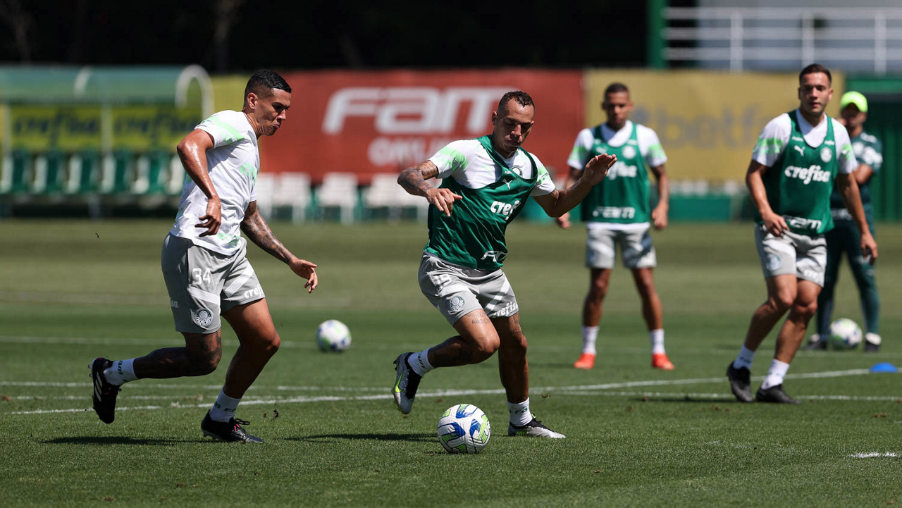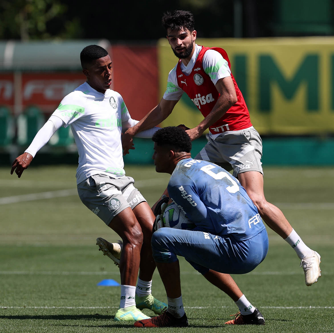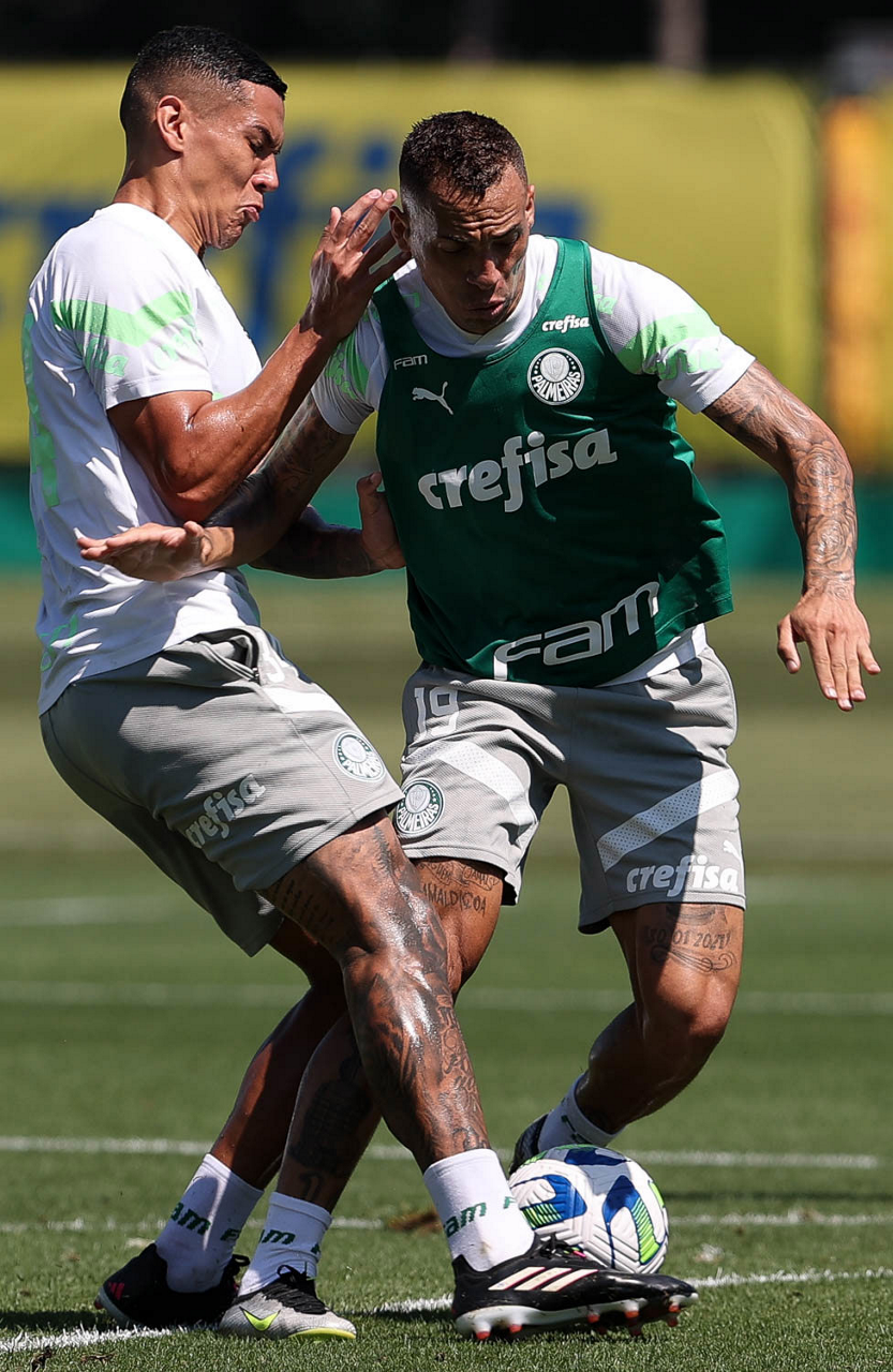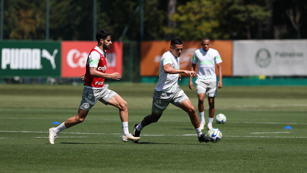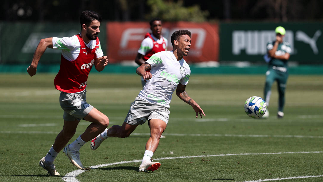 Os jogadores Flaco López e Endrick (D), da SE Palmeiras, durante treinamento, na Academia de Futebol. (Foto: Cesar Greco/Palmeiras/by Canon)