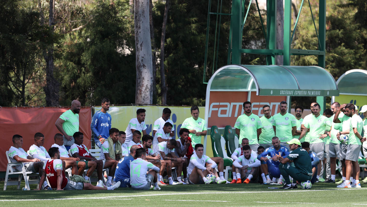 O técnico Abel Ferreira, da SE Palmeiras, conversa com o elenco durante treinamento, na Academia de Futebol. (Foto: Cesar Greco/Palmeiras/by Canon)