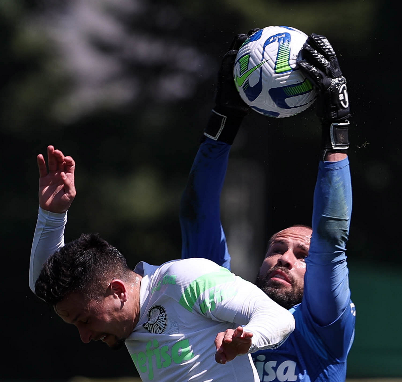 O jogador Artur e o goleiro Marcelo Lomba (D), da SE Palmeiras, durante treinamento, na Academia de Futebol. (Foto: Cesar Greco/Palmeiras/by Canon)