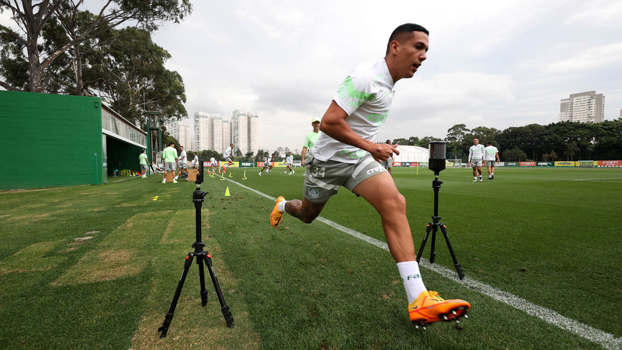 Os jogadores Luan, Marcos Rocha, Jailson, Murilo e Marcelo Lomba (E/D em pé) e Breno Lopes, Raphael Veiga, Zé Rafael, Gabriel Menino, Rony, Mayke e Mateus (E/D agachaos), da SE Palmeiras, durante treinamento, na Academia de Futebol. (Foto: Cesar Greco/Palmeiras/by Canon)