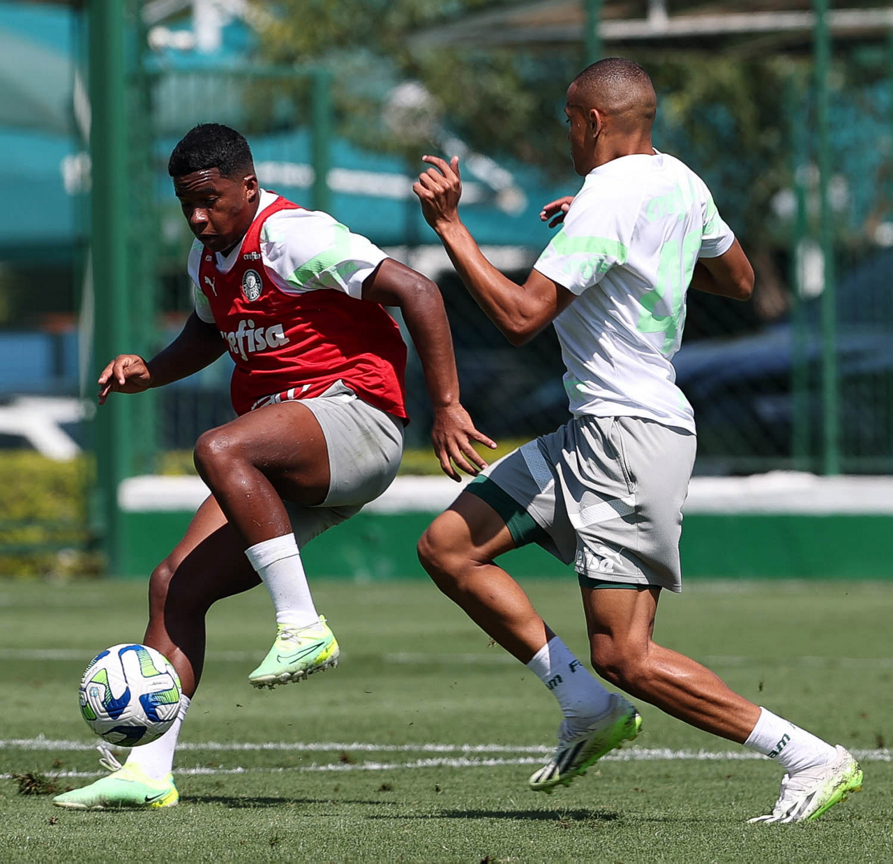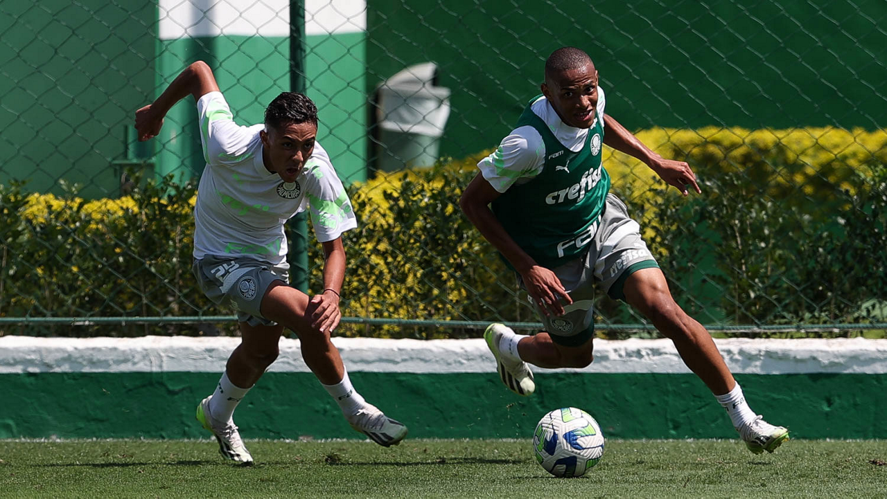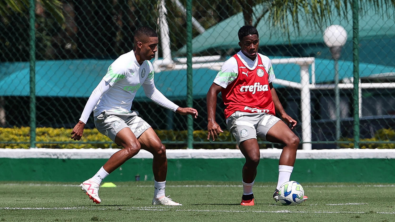 Os jogadores Endrick e Jhonatan (D), da SE Palmeiras, durante treinamento, na Academia de Futebol. (Foto: Cesar Greco/Palmeiras/by Canon)