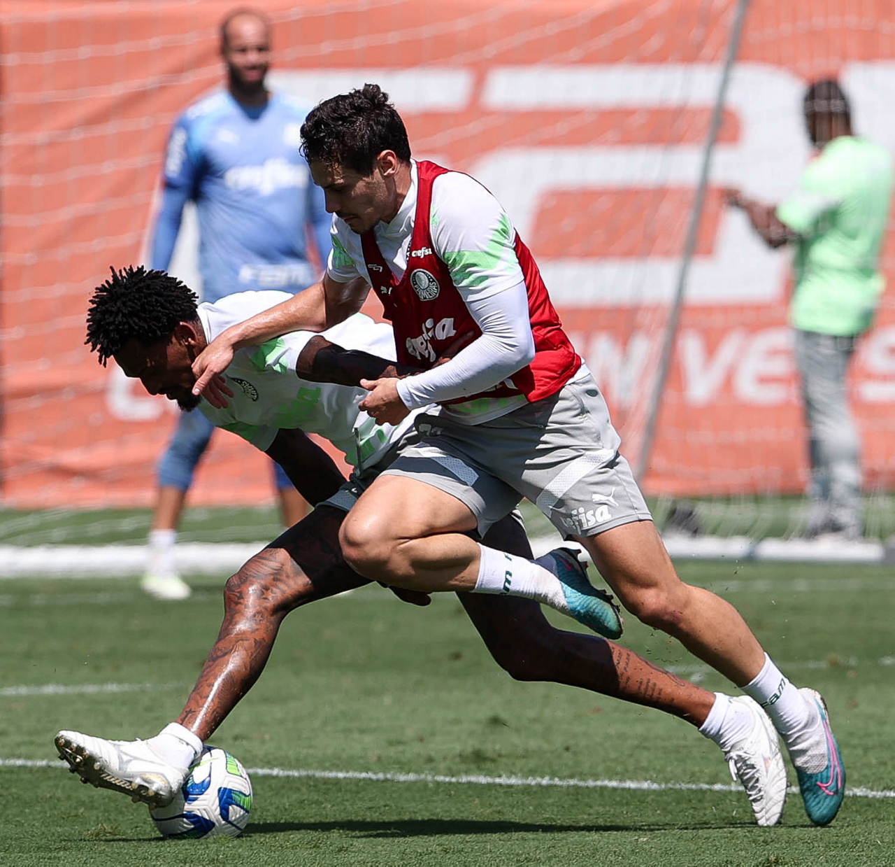 Os jogadores Richard Ríos e Figueiredo (D), da SE Palmeiras, durante treinamento, na Academia de Futebol. (Foto: Cesar Greco/Palmeiras/by Canon)