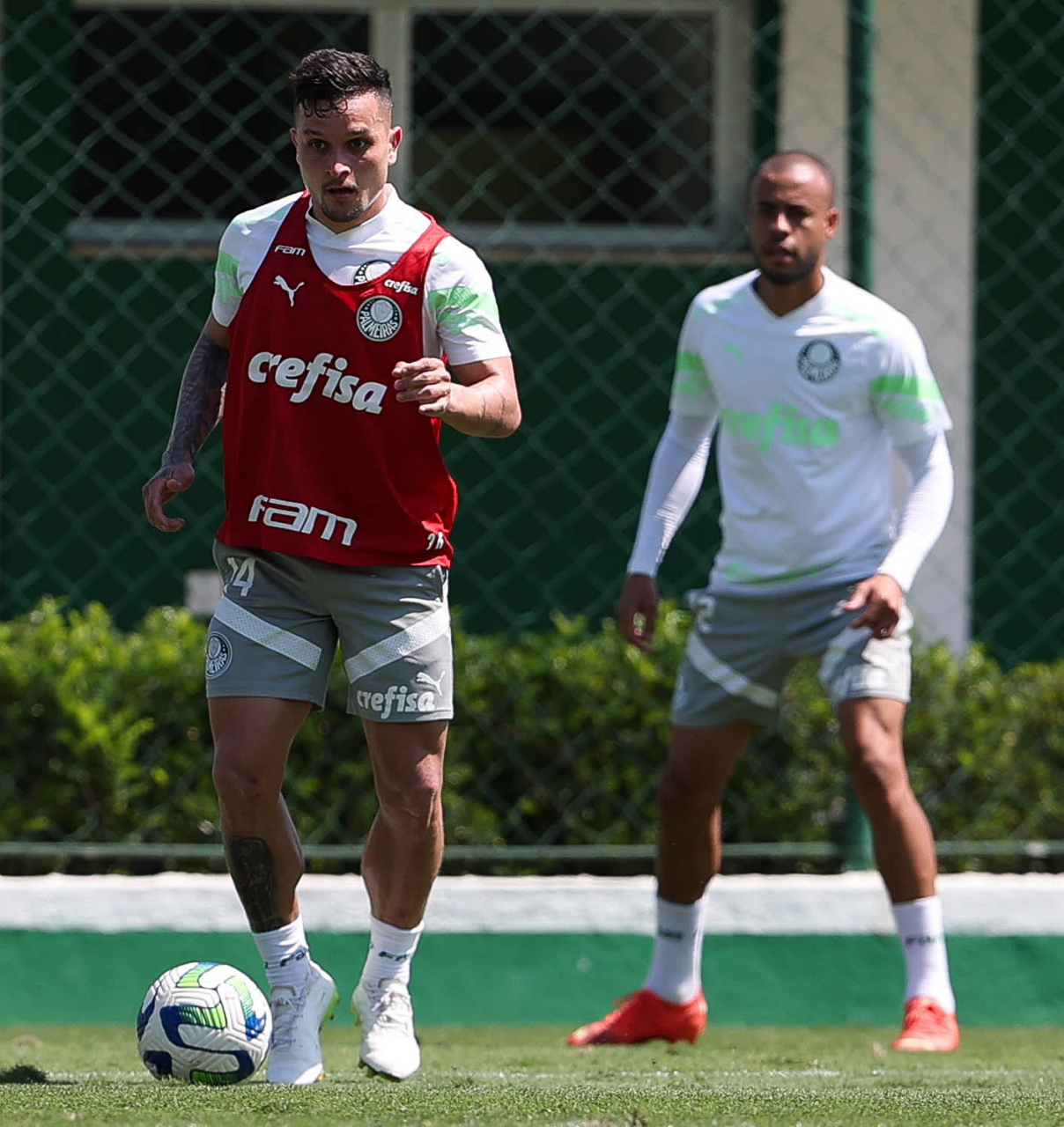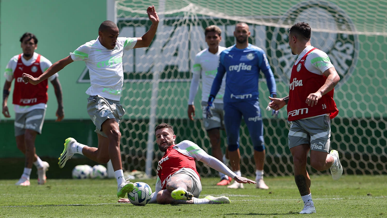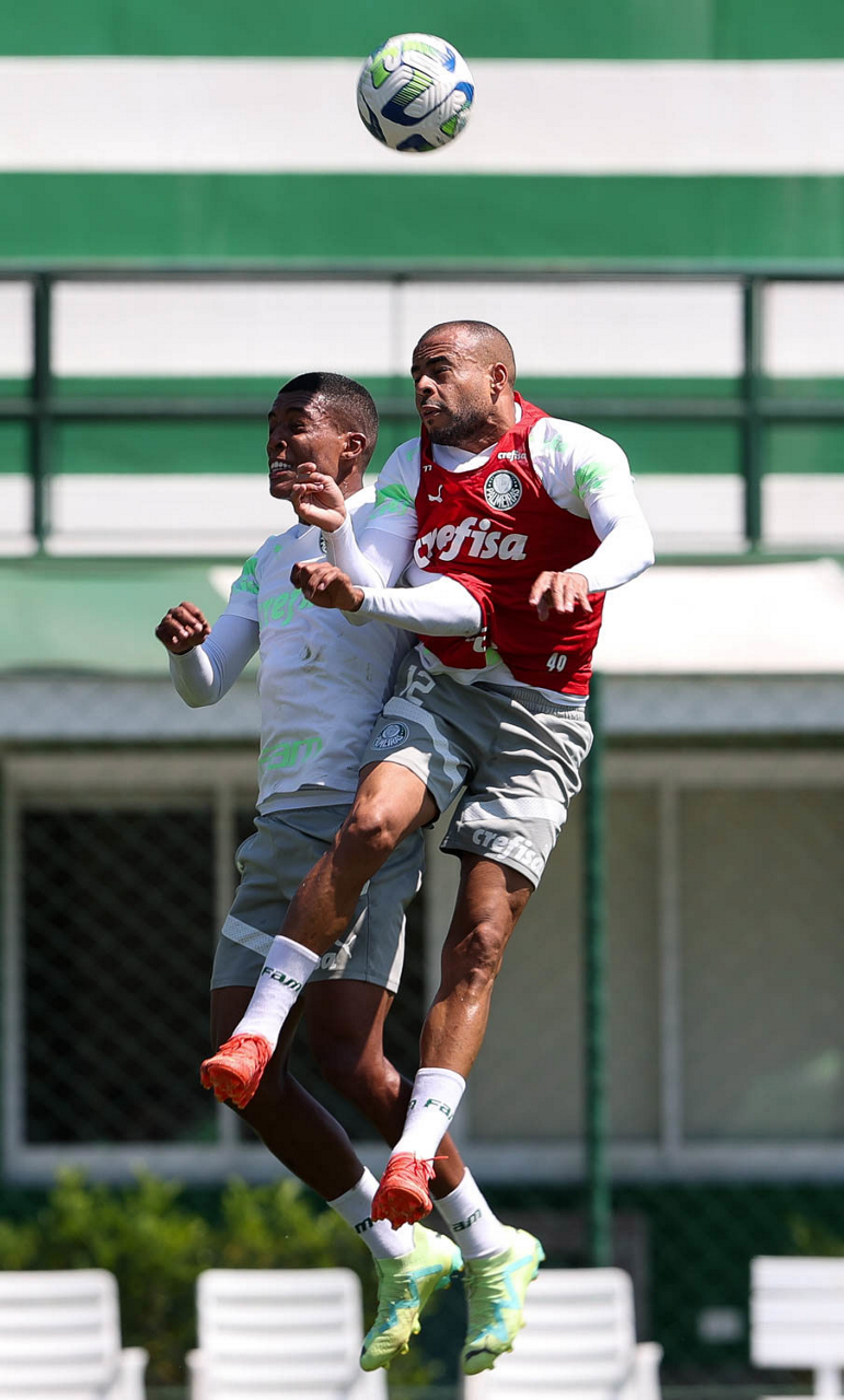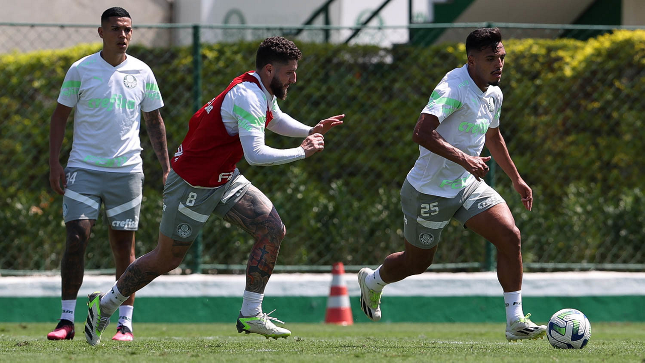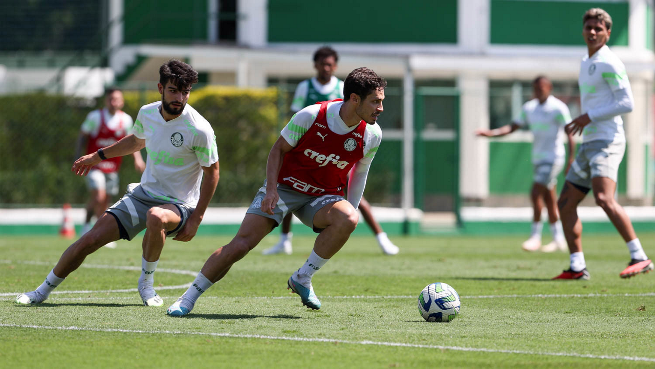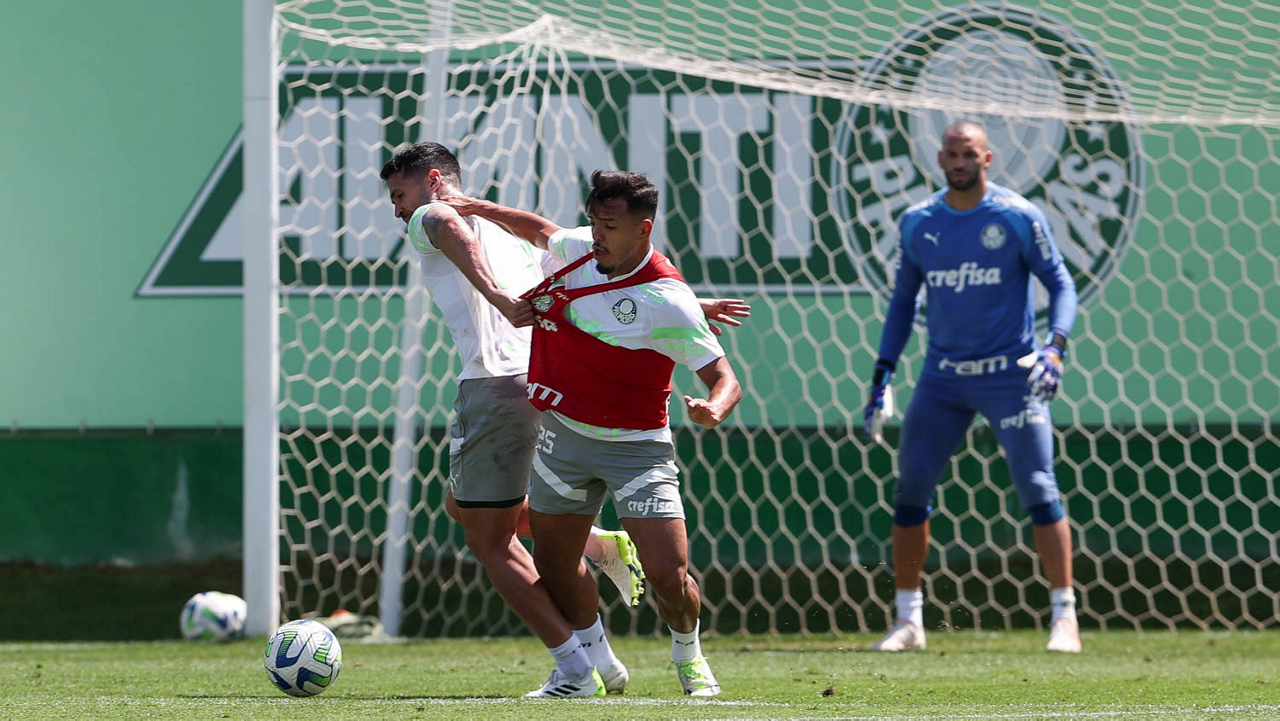 Os jogadores Zé Rafael d Gabriel Menino (D), da SE Palmeiras, durante treinamento, na Academia de Futebol. (Foto: Cesar Greco/Palmeiras/by Canon)