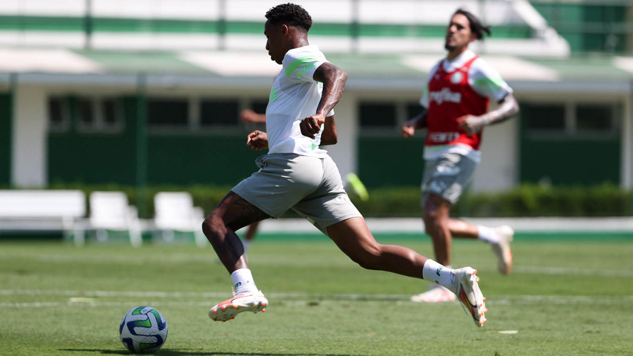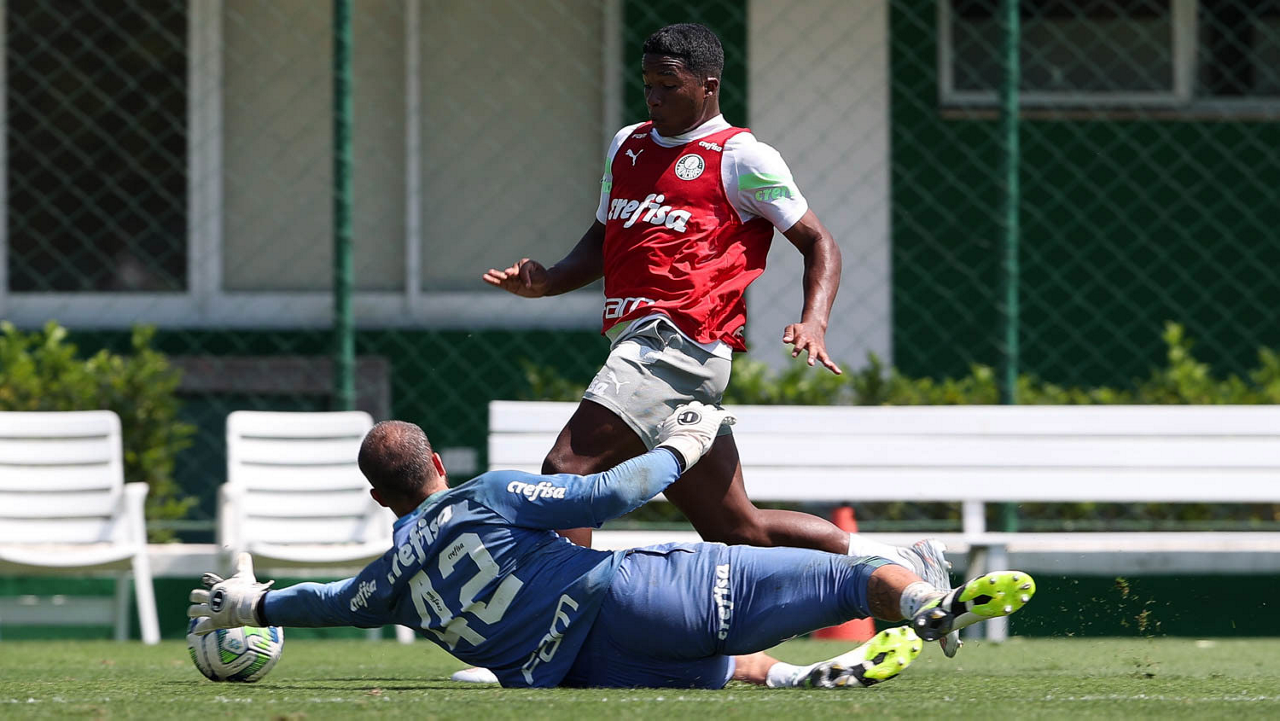 O jogador Endrick, da SE Palmeiras, durante treinamento, na Academia de Futebol. (Foto: Cesar Greco/Palmeiras/by Canon)