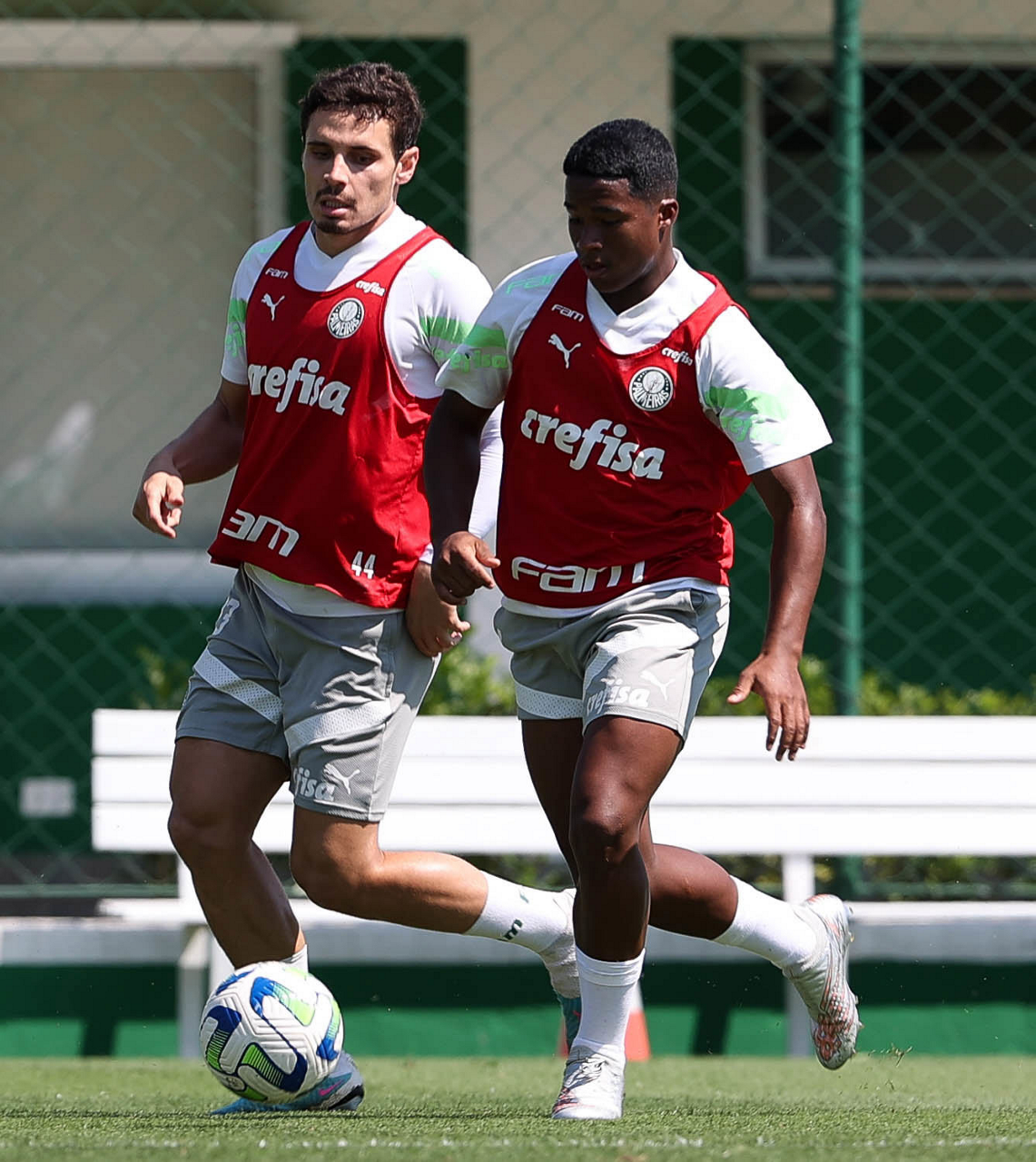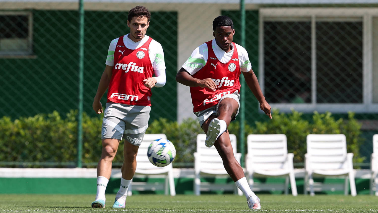Os jogadores Raphael Veiga e Endrick (D), da SE Palmeiras, durante treinamento, na Academia de Futebol. (Foto: Cesar Greco/Palmeiras/by Canon)