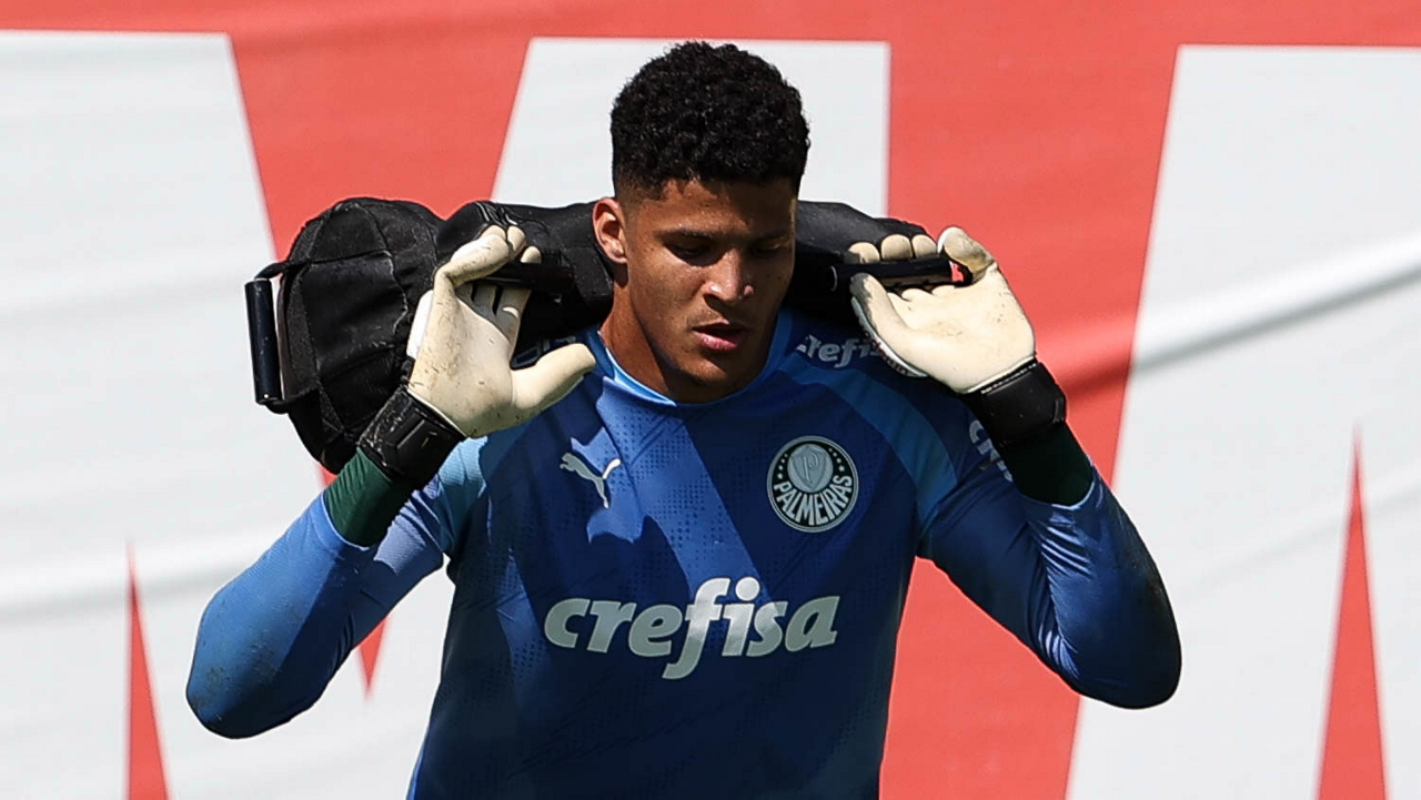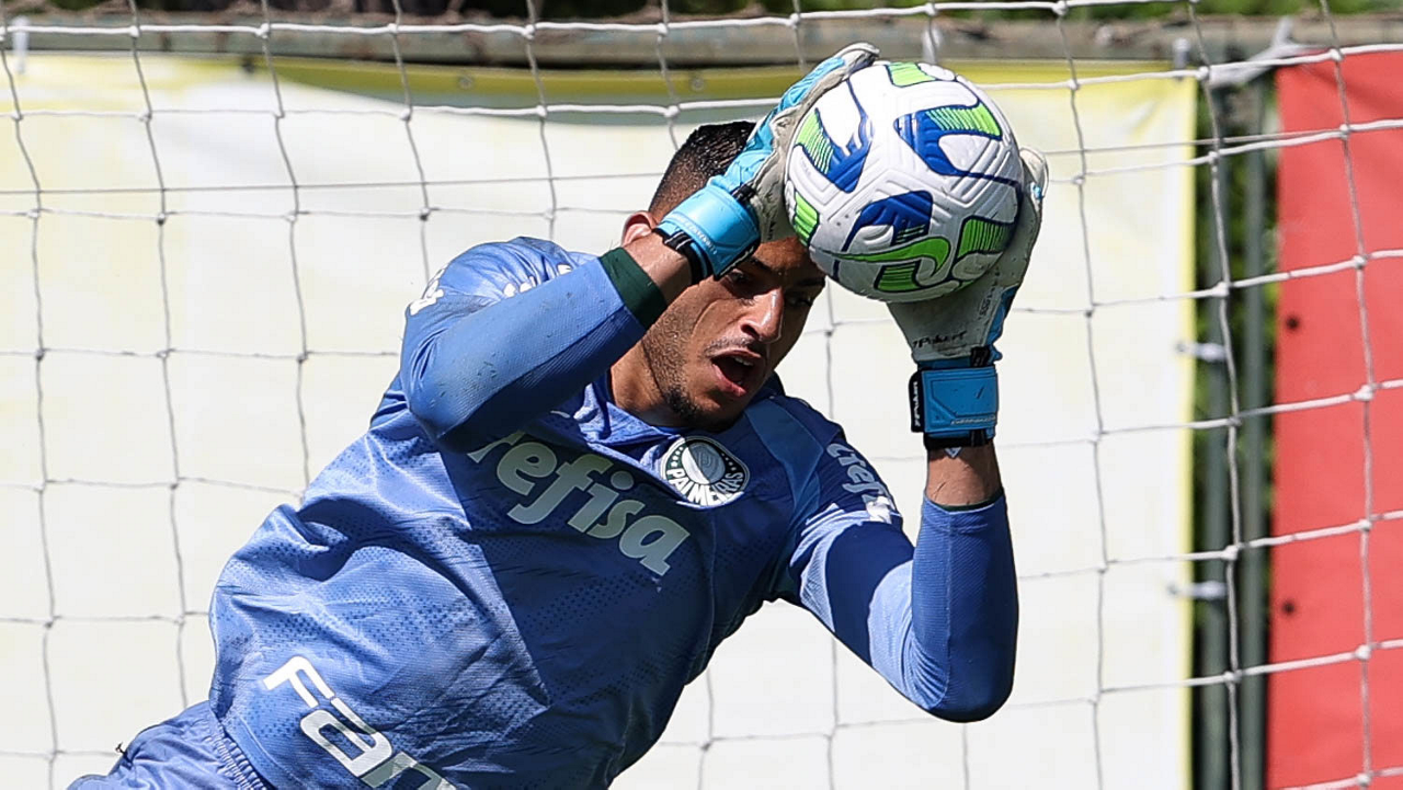 O goleiro Mateus, da SE Palmeiras, durante treinamento, na Academia de Futebol. (Foto: Cesar Greco/Palmeiras/by Canon)