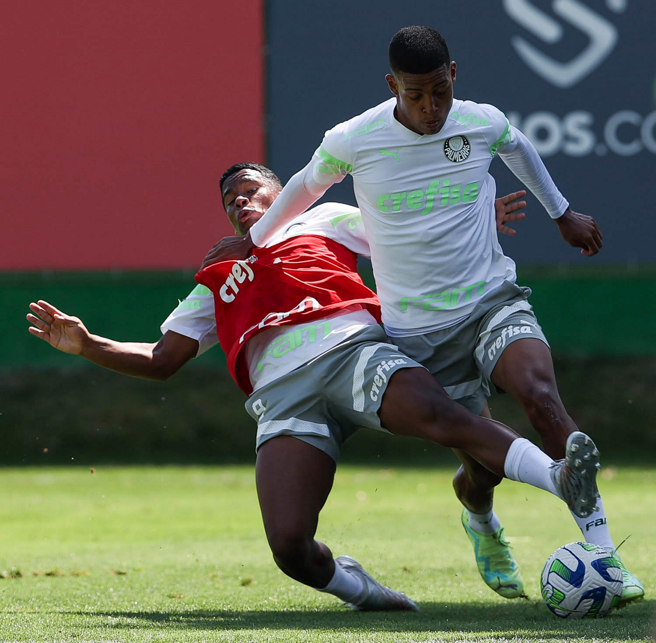 Os jogadores Endrick e Vanderlan (D), da SE Palmeiras, durante treinamento, na Academia de Futebol. (Foto: Cesar Greco/Palmeiras/by Canon)