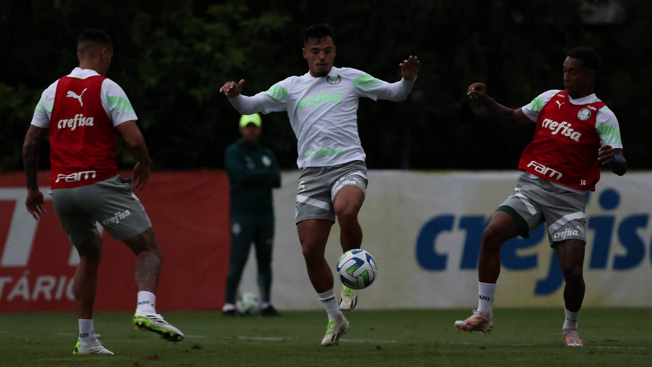 Os jogadores Naves, Gabriel Menino e Luis Guilherme (E/D), da SE Palmeiras, durante treinamento, na Academia de Futebol. (Foto: Cesar Greco/Palmeiras/by Canon)