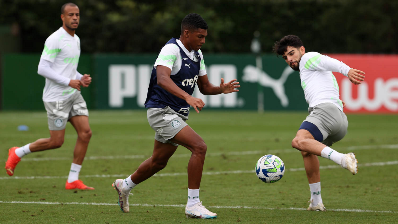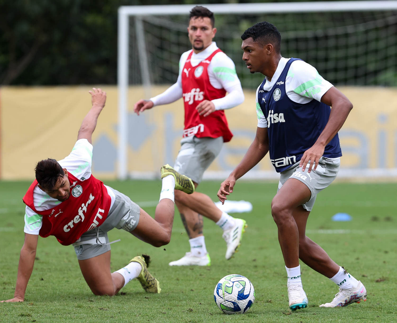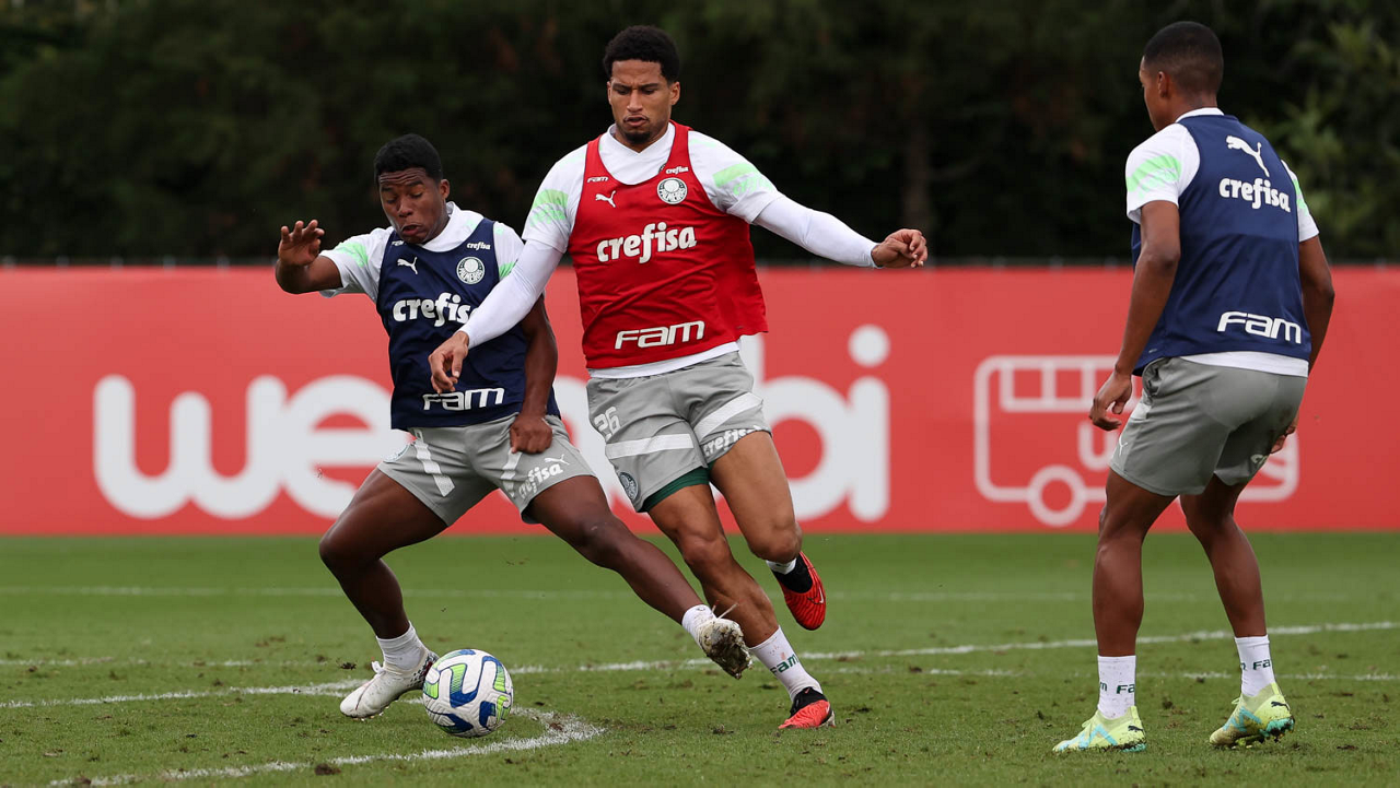 Os jogadores Endrick, Murilo e Vanderlan (E/D), da SE Palmeiras, durante treinamento, na Academia de Futebol. (Foto: Cesar Greco/Palmeiras/by Canon)