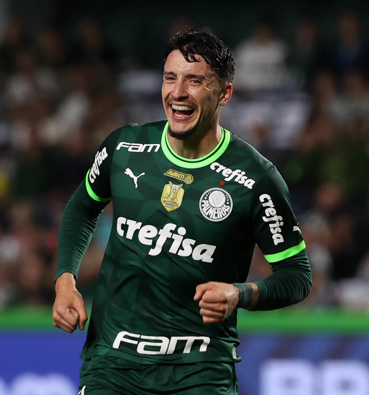 O jogador Joaquín Piquerez, da SE Palmeiras, comemora seu gol contra a equipe do Coritiba FC, durante partida válida pela vigésima oitava rodada, do Campeonato Brasileiro, Série A, no ´stádio Couto Pereira. (Foto: Cesar Greco/Palmeiras/by Canon)