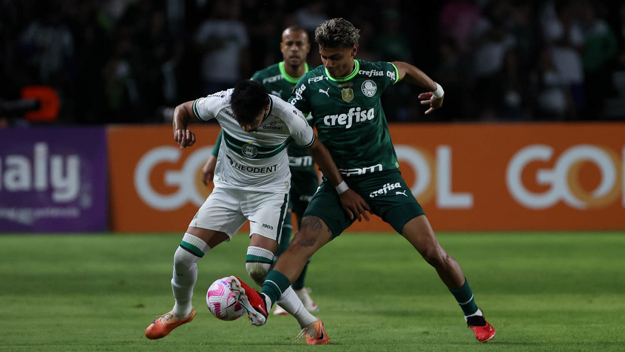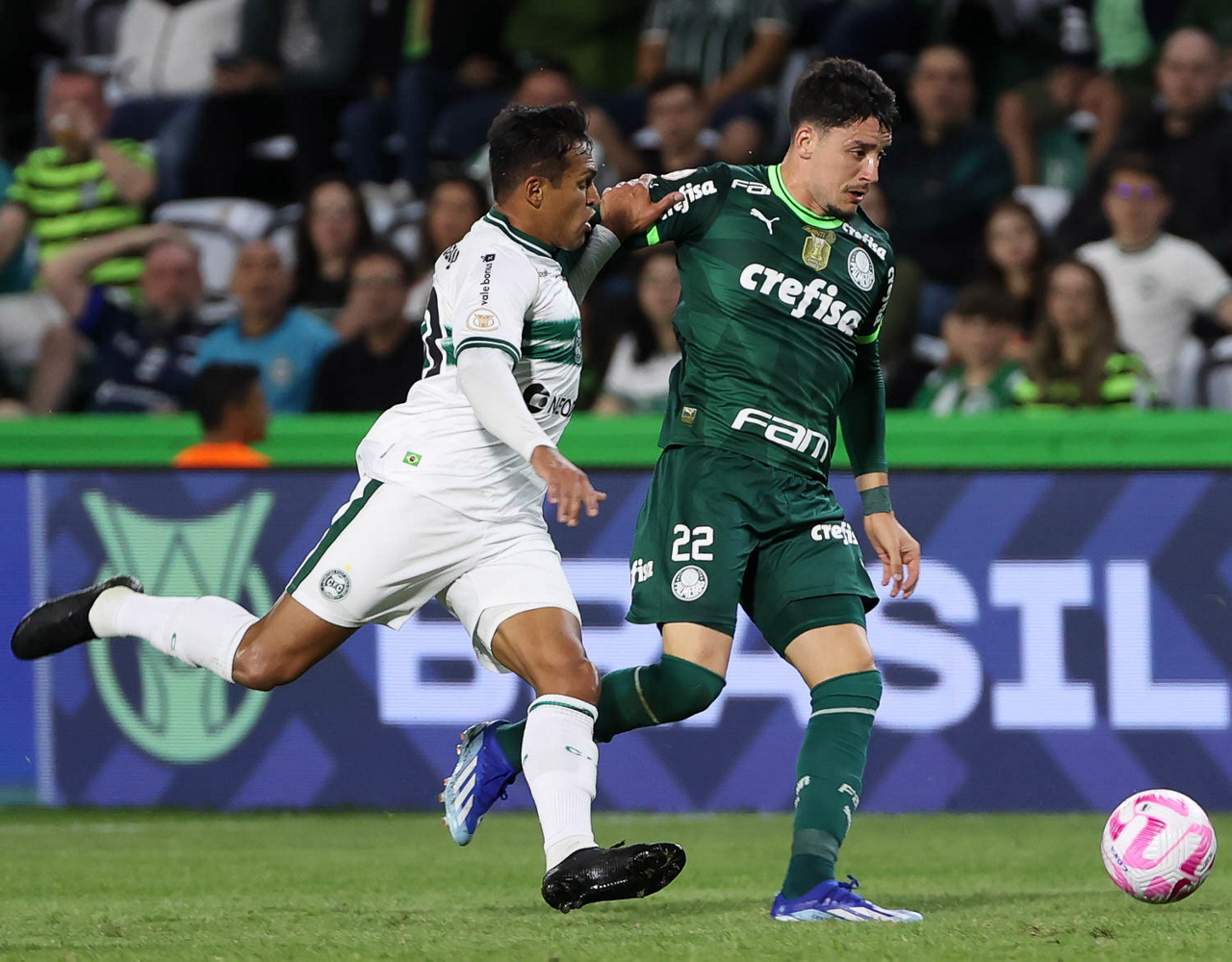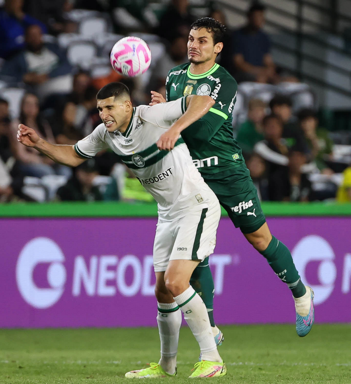 O jogador Richard Ríos, da SE Palmeiras, disputa bola com o jogador do Coritiba FC, durante partida válida pela vigésima oitava rodada, do Campeonato Brasileiro, Série A, no ´stádio Couto Pereira. (Foto: Cesar Greco/Palmeiras/by Canon)