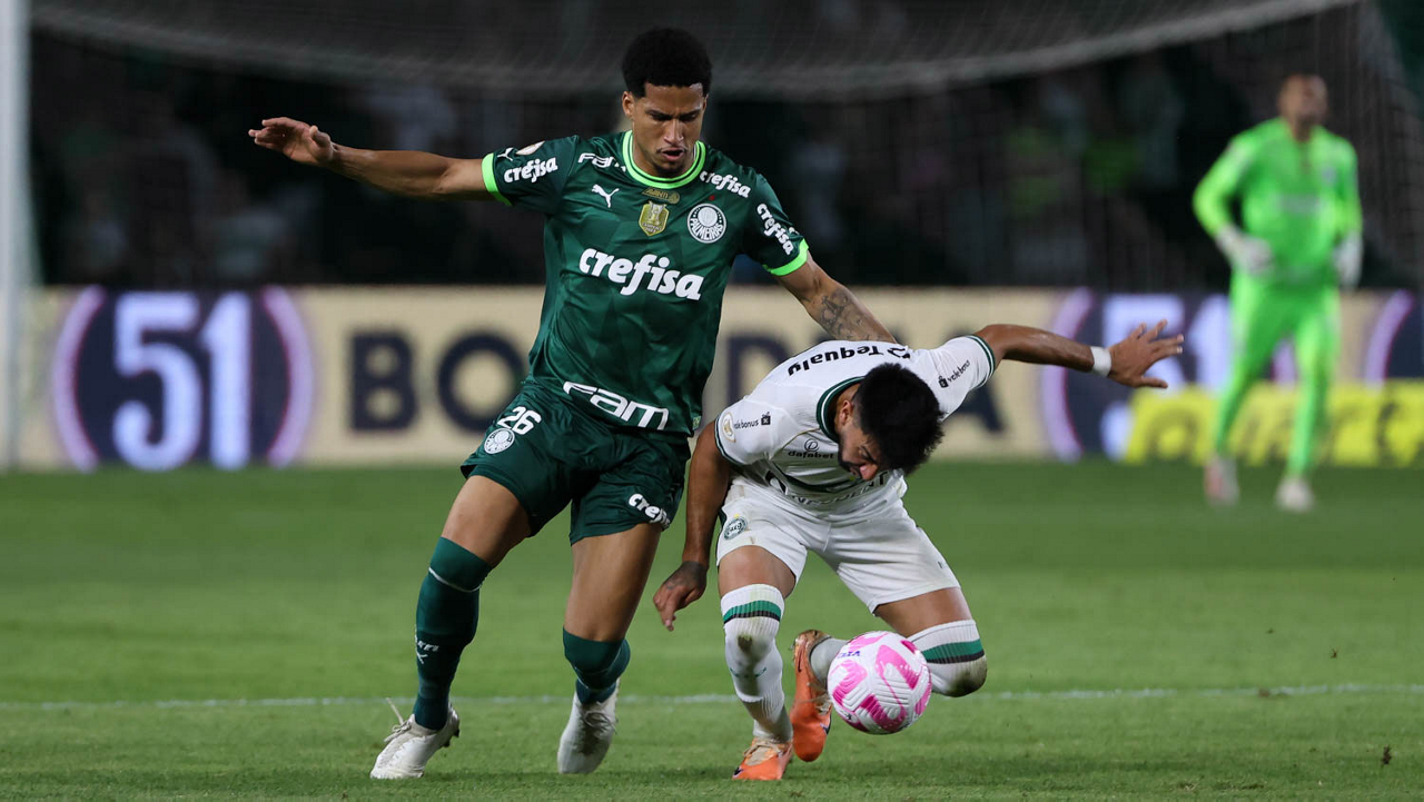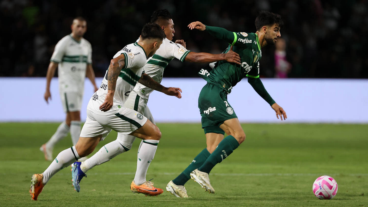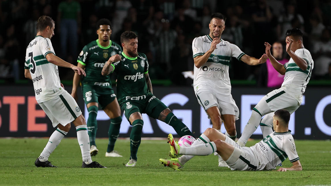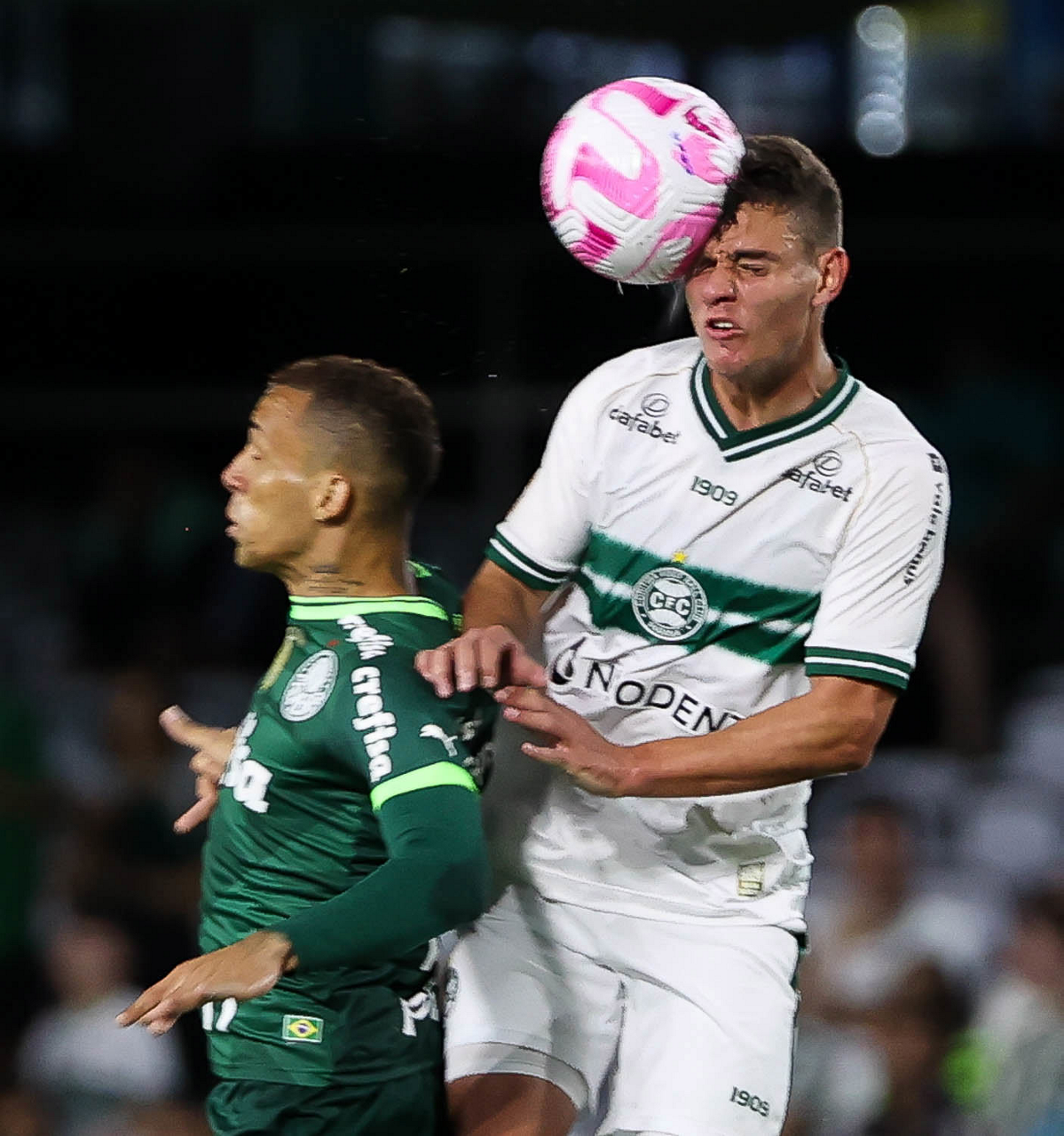O jogador Richard Ríos, da SE Palmeiras, disputa bola com o jogador do Coritiba FC, durante partida válida pela vigésima oitava rodada, do Campeonato Brasileiro, Série A, no ´stádio Couto Pereira. (Foto: Cesar Greco/Palmeiras/by Canon)