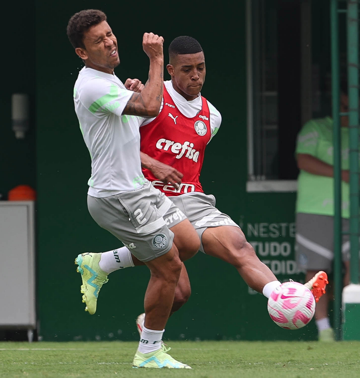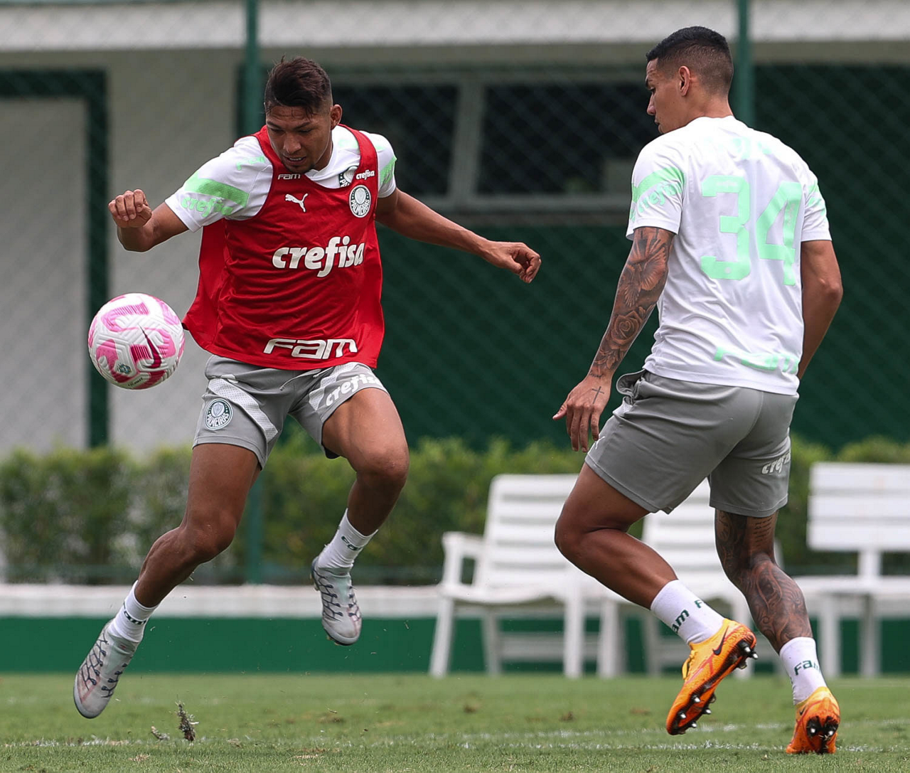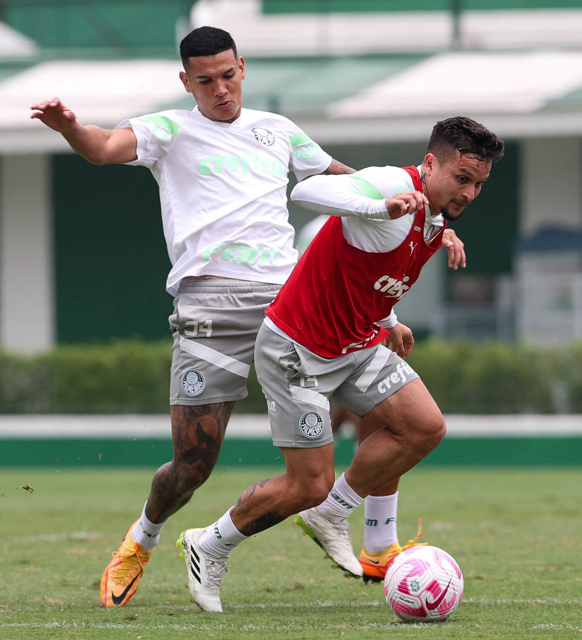 Os jogadores Fabinho e Artur (D), da SE Palmeiras, durante treinamento, na Academia de Futebol. (Foto: Cesar Greco/Palmeiras/by Canon)