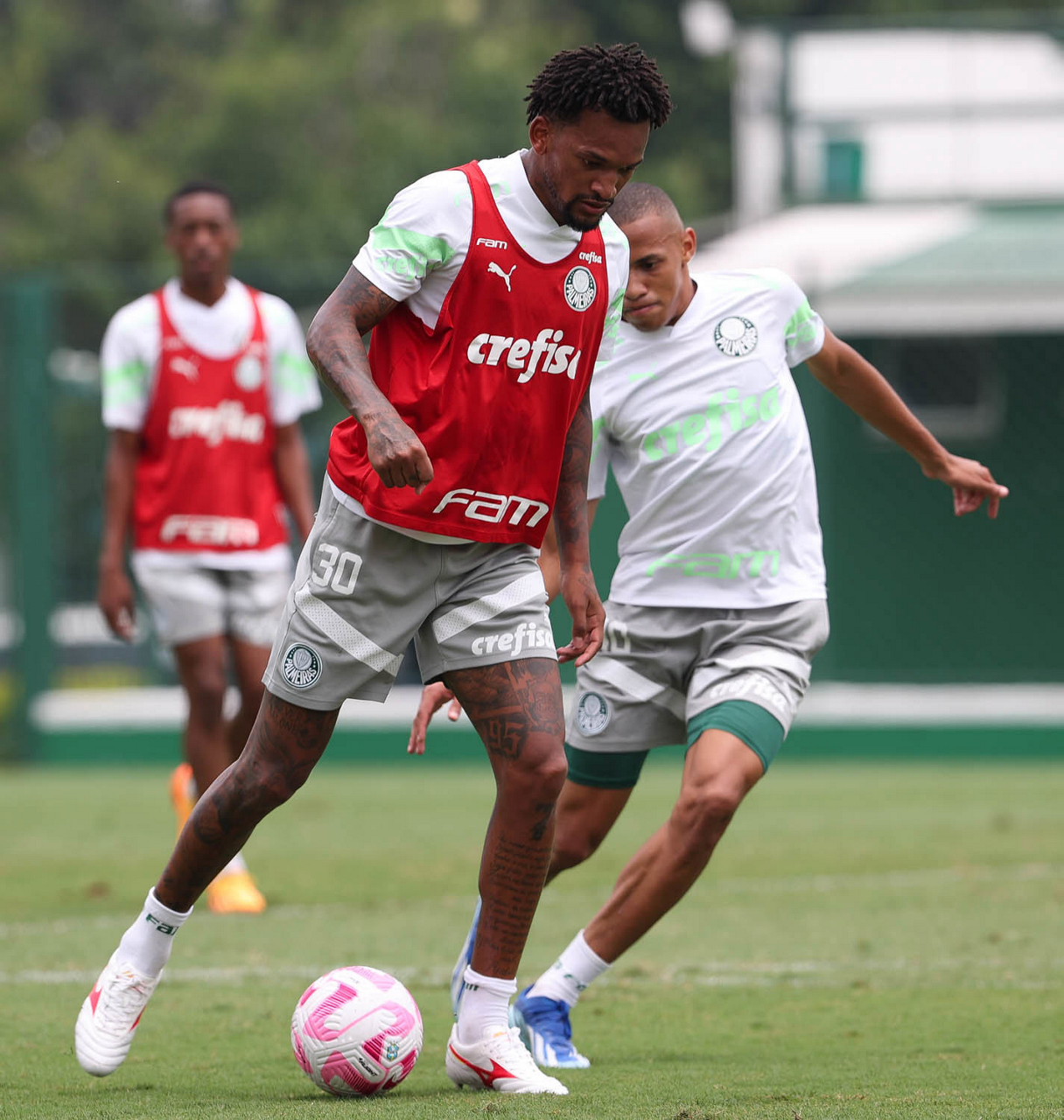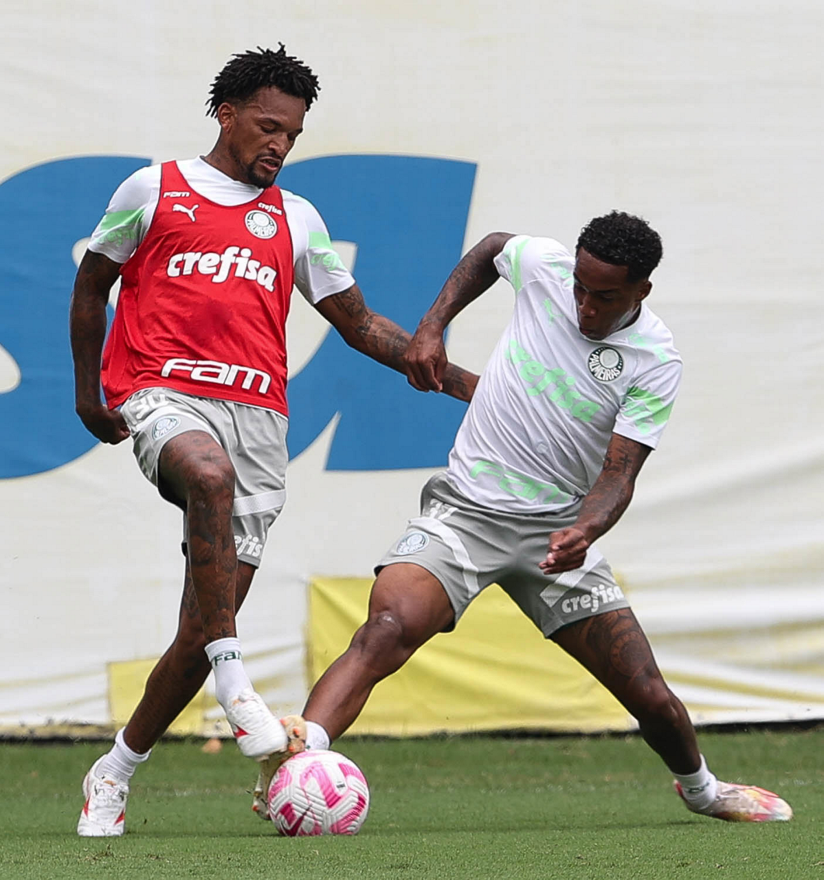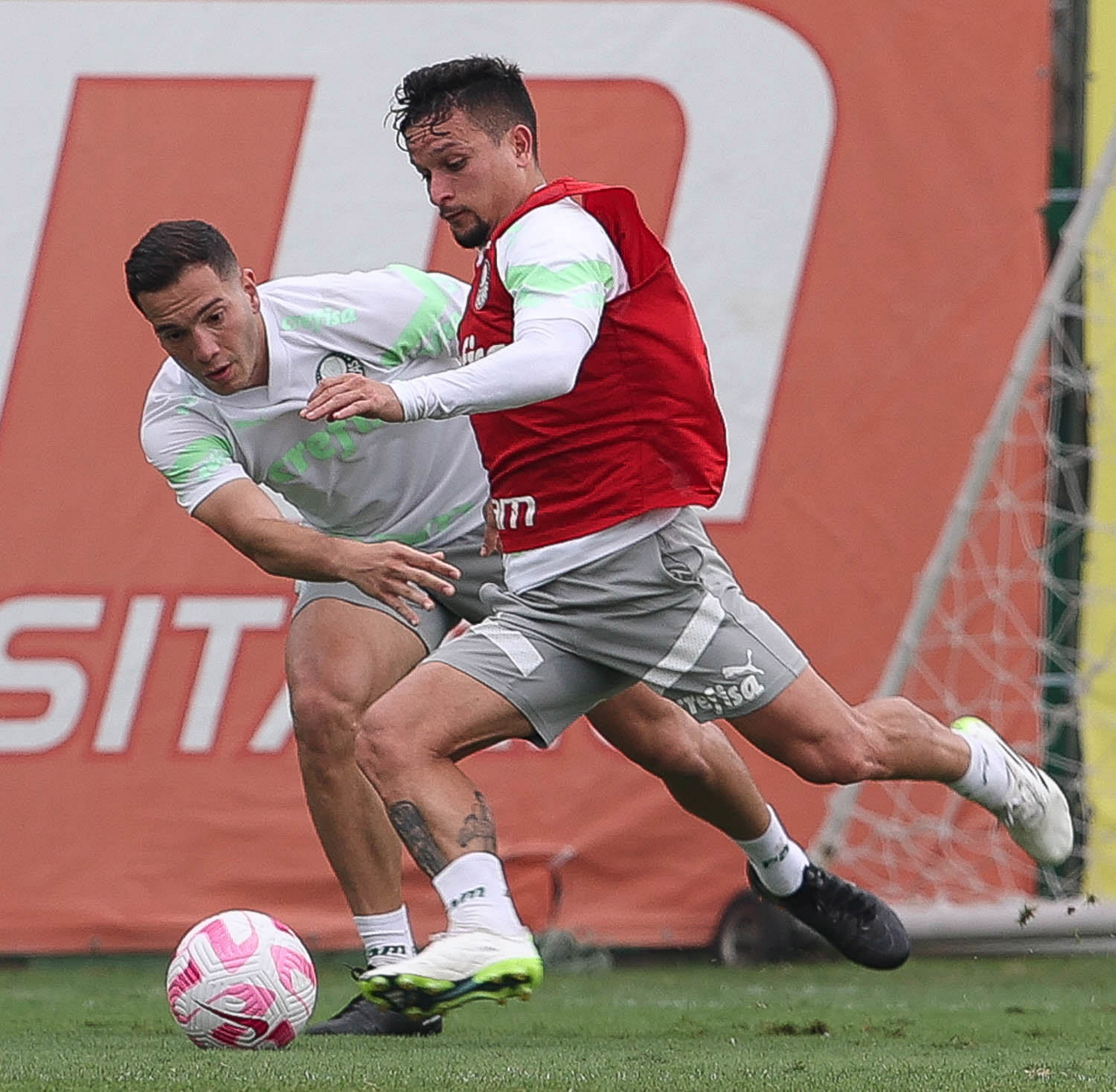 Os jogadores Fabinho e Artur (D), da SE Palmeiras, durante treinamento, na Academia de Futebol. (Foto: Cesar Greco/Palmeiras/by Canon)