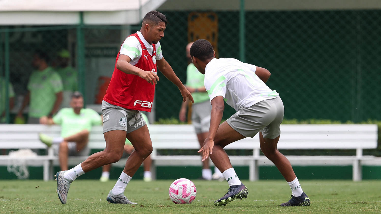 Os jogadores Rony e Alex (D), da SE Palmeiras, durante treinamento, na Academia de Futebol. (Foto: Cesar Greco/Palmeiras/by Canon)