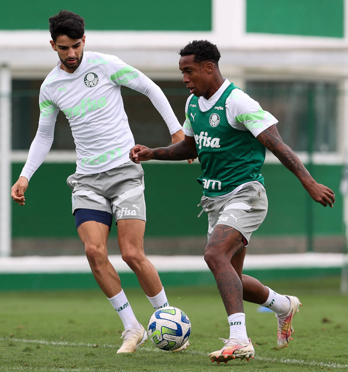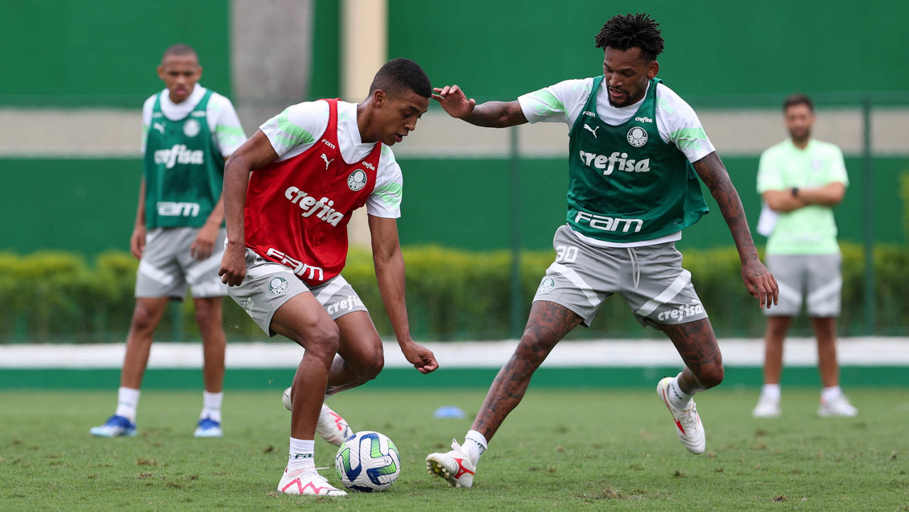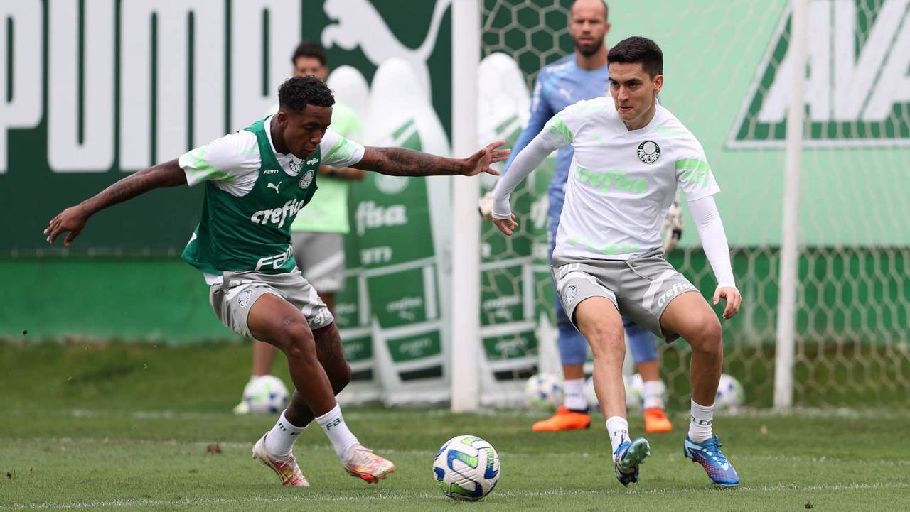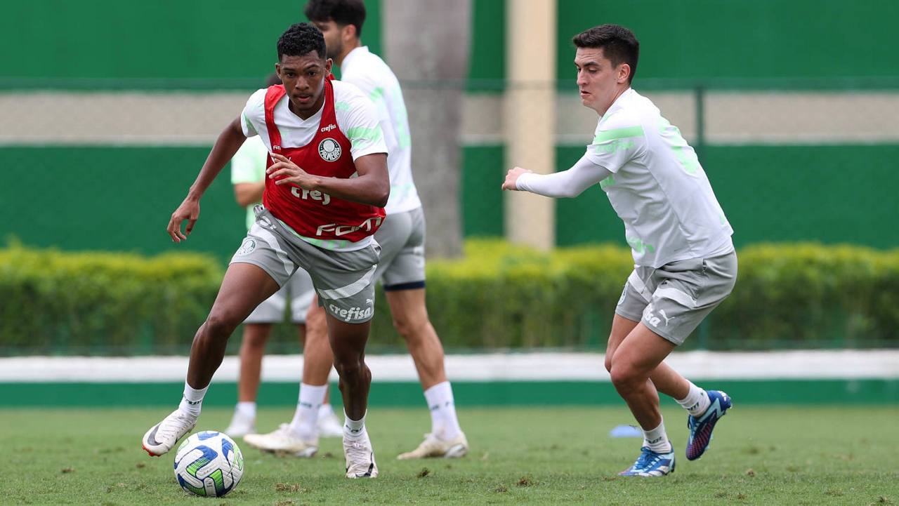 Os jogadores Luis Guilherme e Eduard Atuesta (D), da SE Palmeiras, durante treinamento, na Academia de Futebol. (Foto: Cesar Greco/Palmeiras/by Canon)