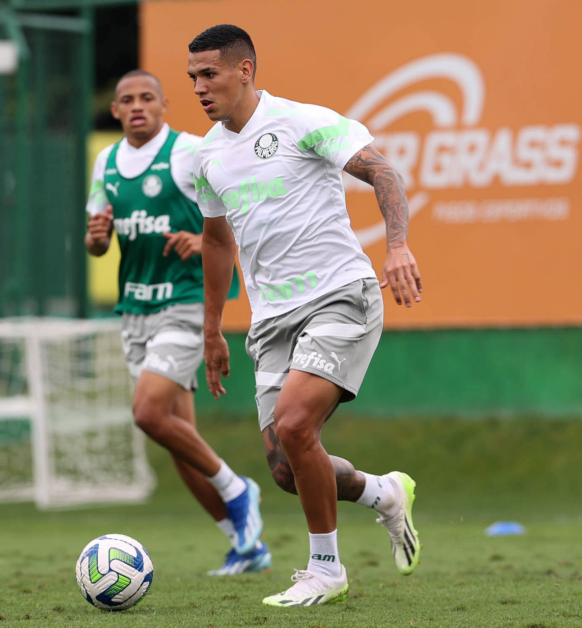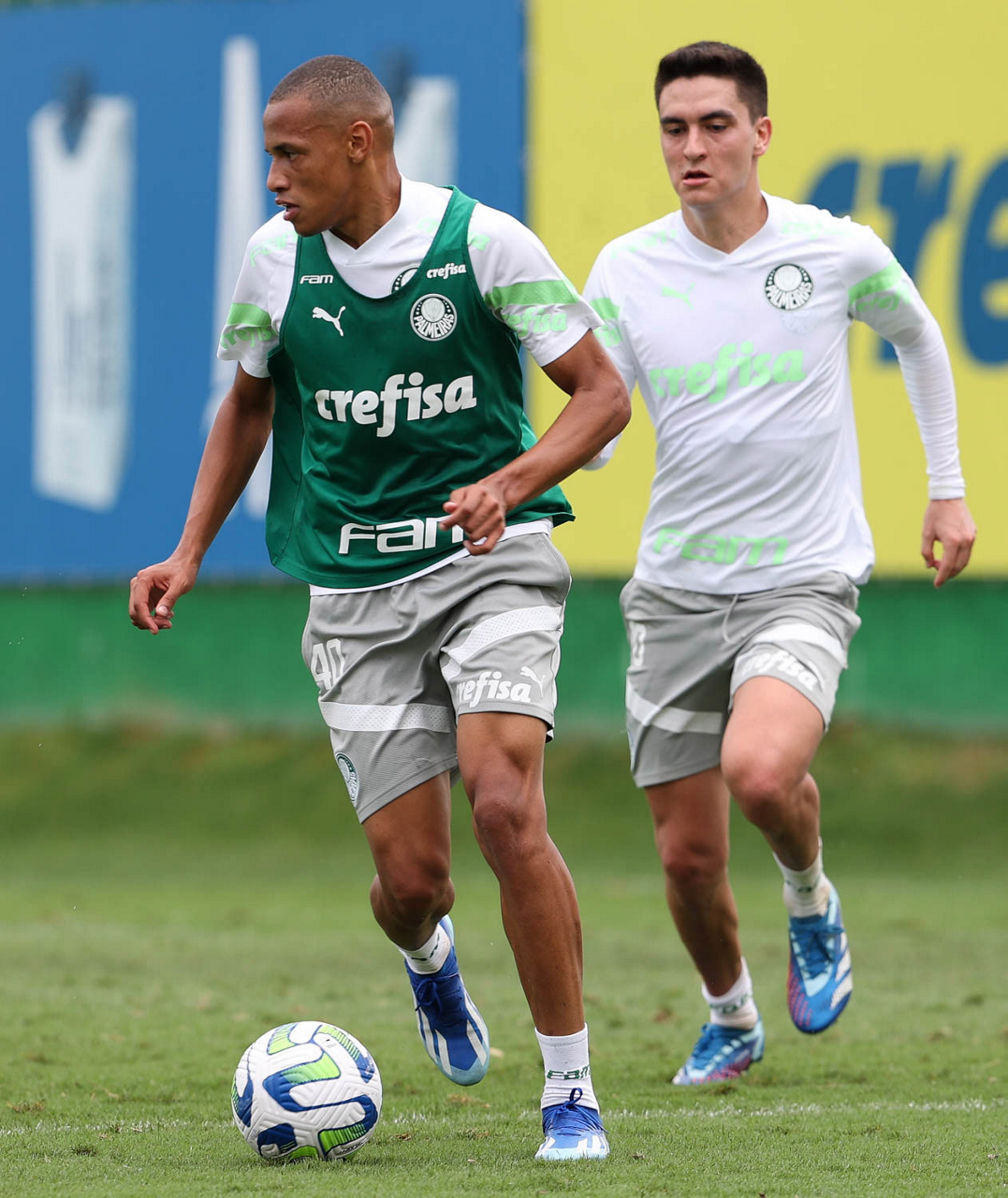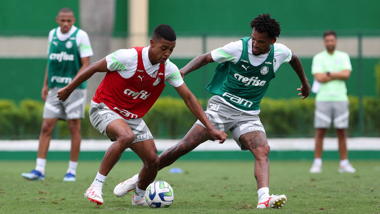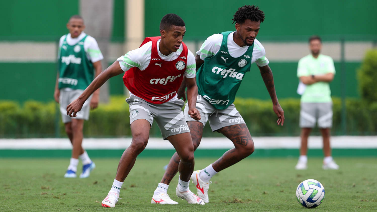 Os jogadores Luis Guilherme e Eduard Atuesta (D), da SE Palmeiras, durante treinamento, na Academia de Futebol. (Foto: Cesar Greco/Palmeiras/by Canon)