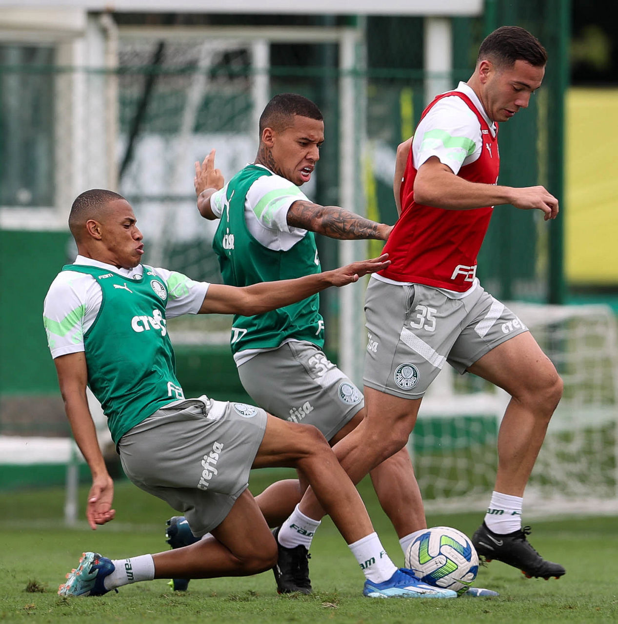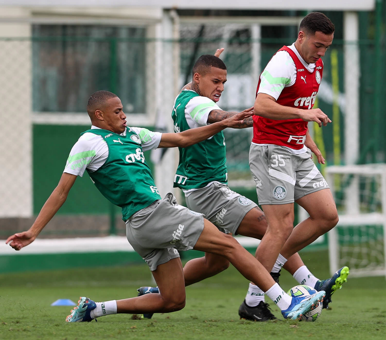 Os jogadores Jhonatan, Garcia e Fabinho (E/D), da SE Palmeiras, durante treinamento, na Academia de Futebol. (Foto: Cesar Greco/Palmeiras/by Canon)
