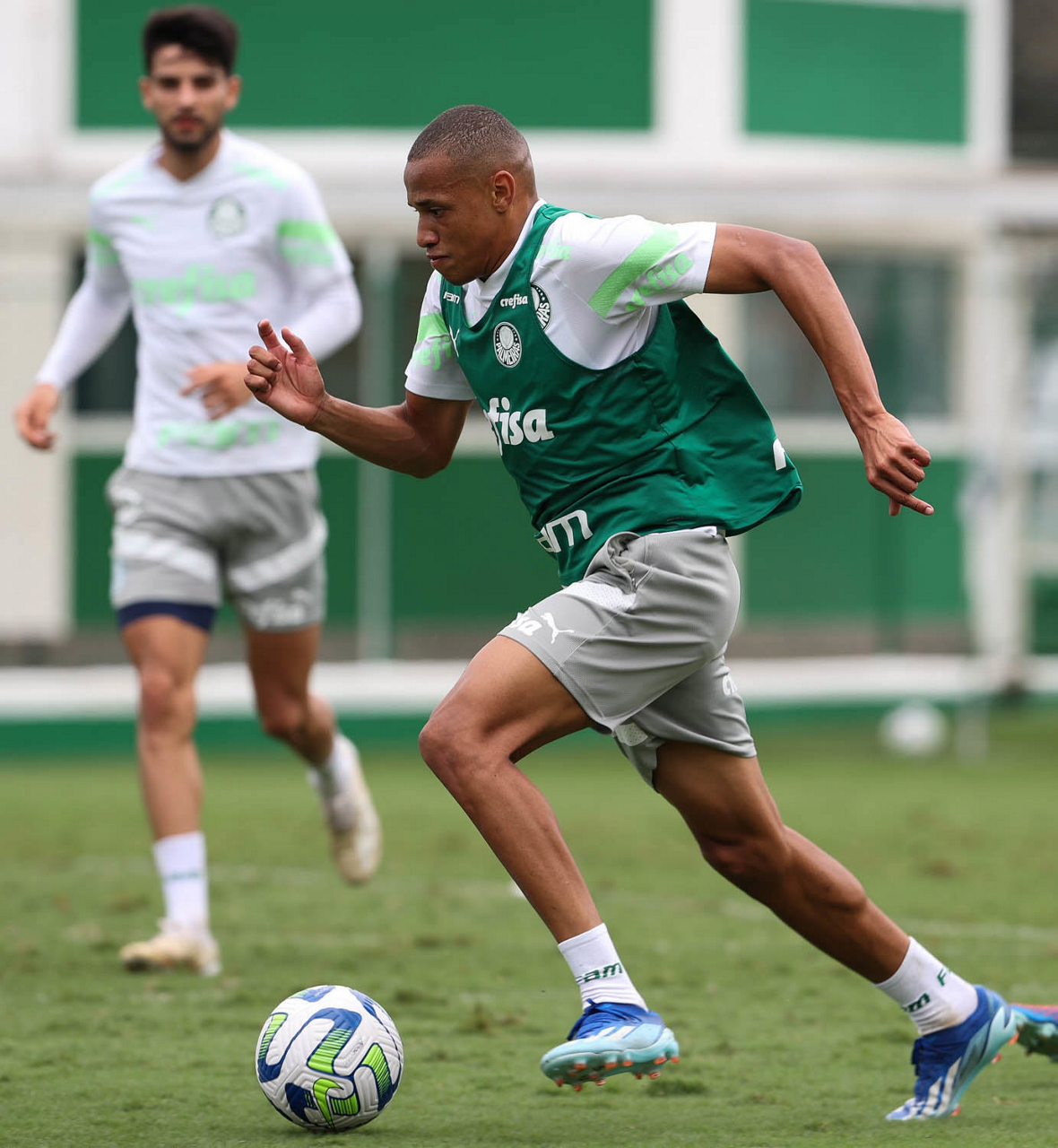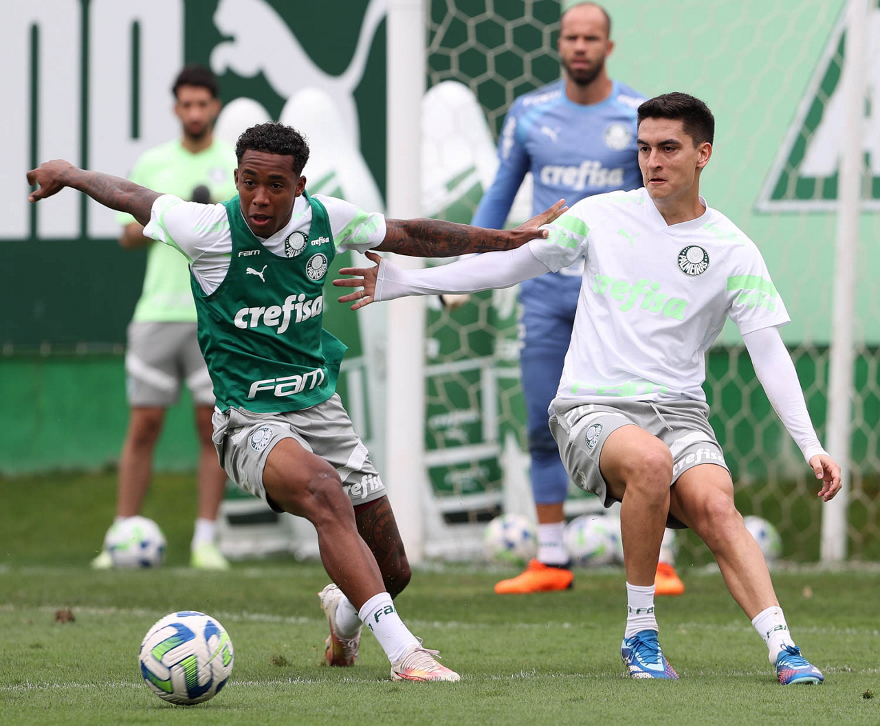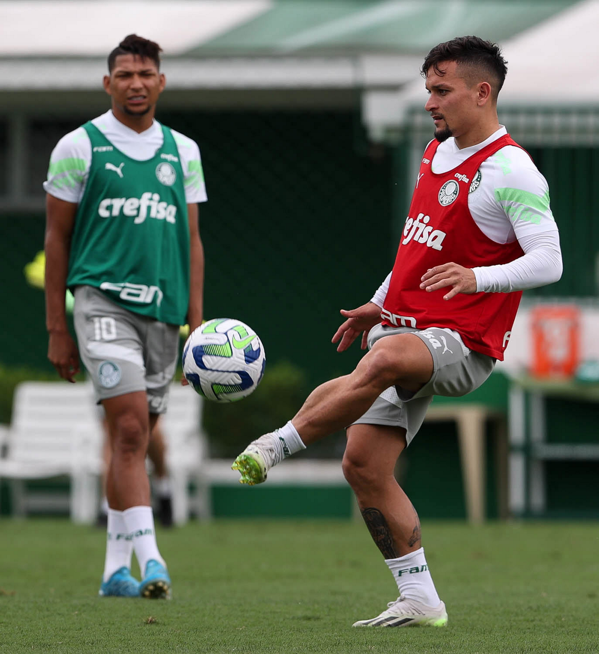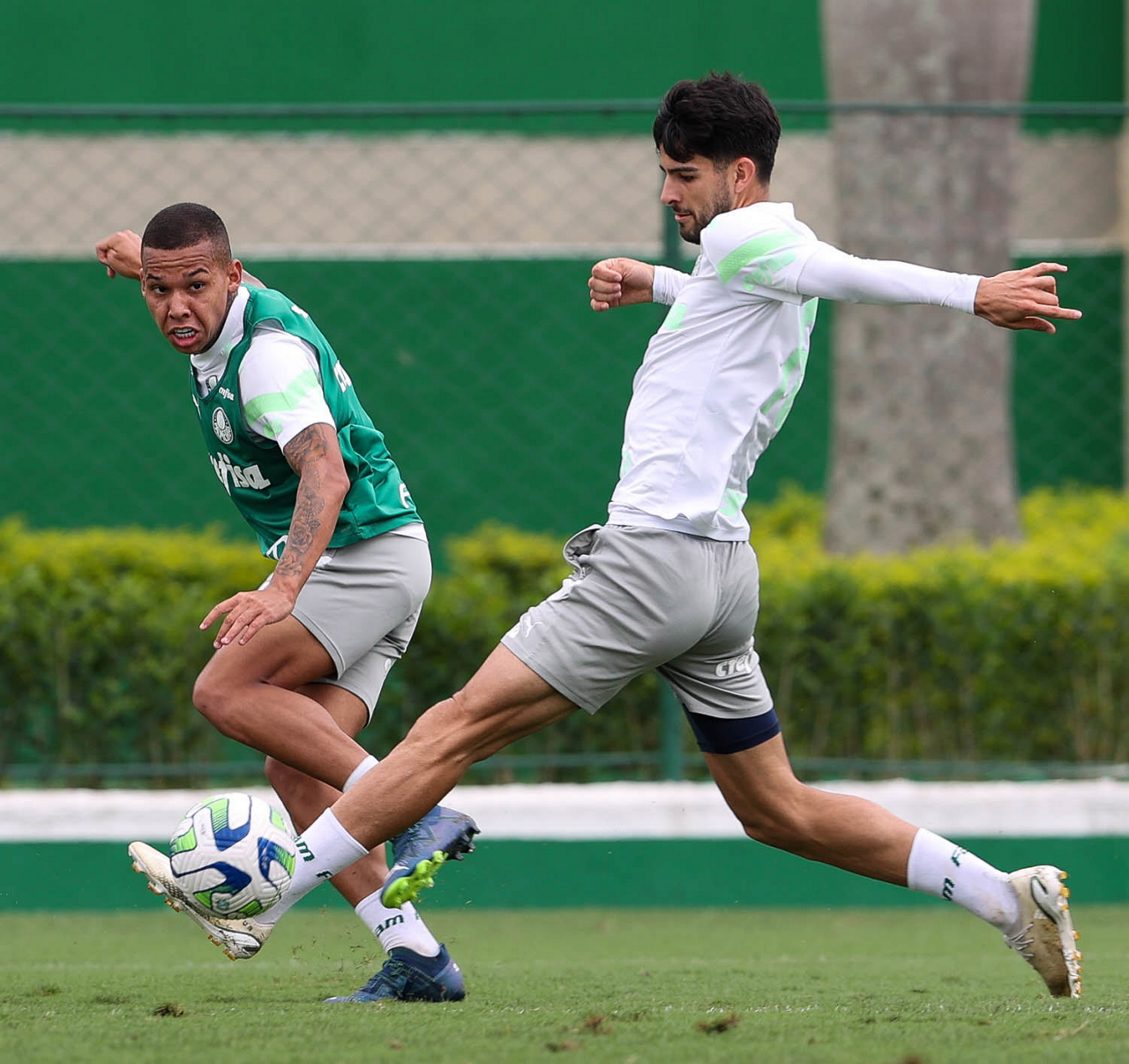 Os jogadores Kevin e Eduard Atuesta (D), da SE Palmeiras, durante treinamento, na Academia de Futebol. (Foto: Cesar Greco/Palmeiras/by Canon)