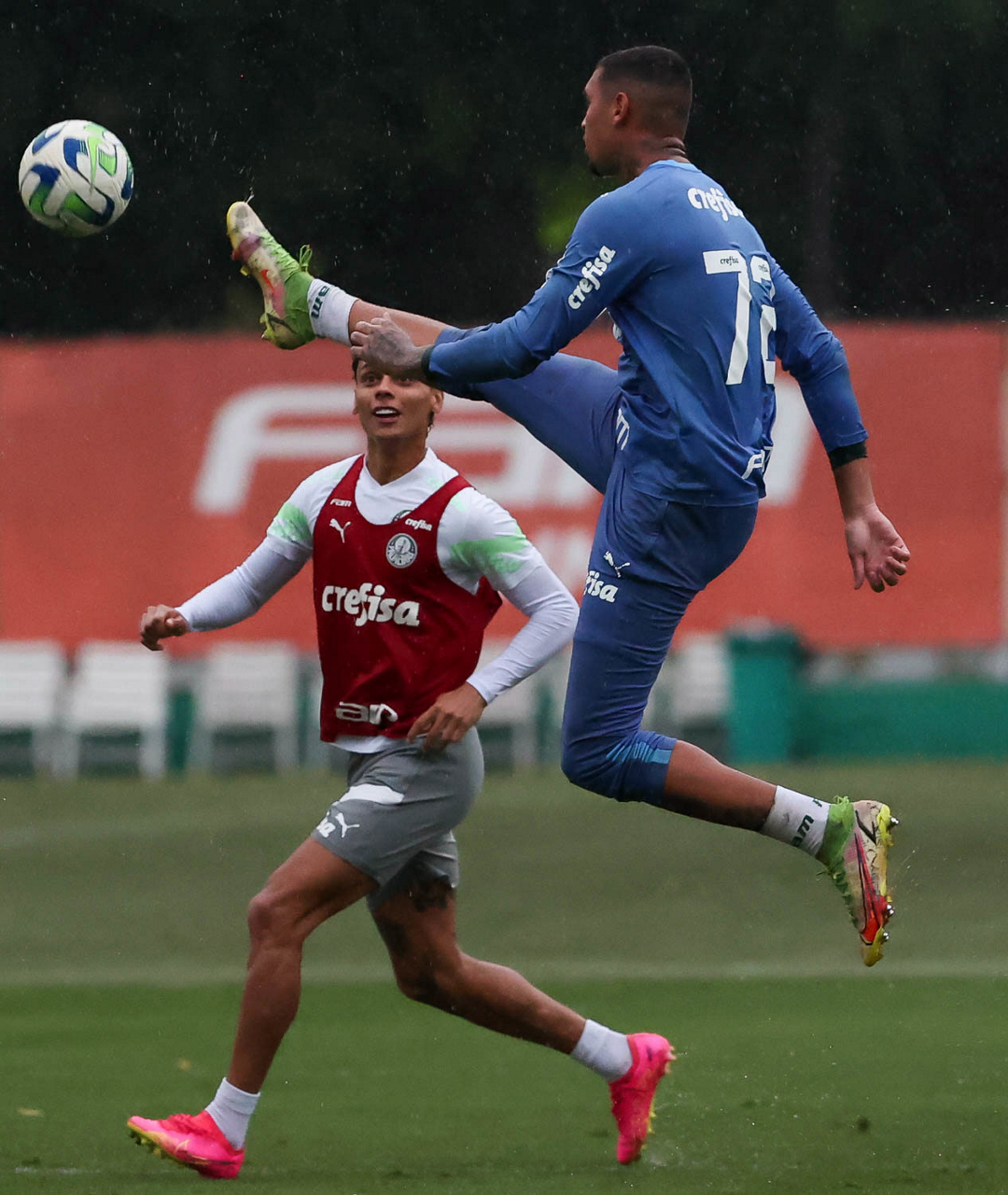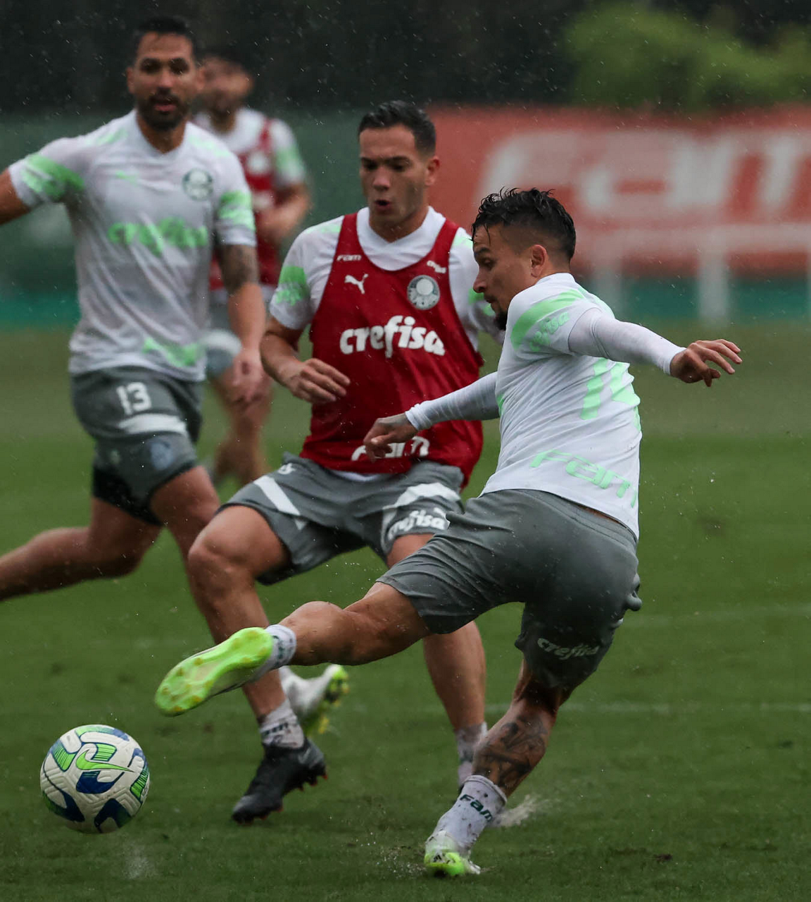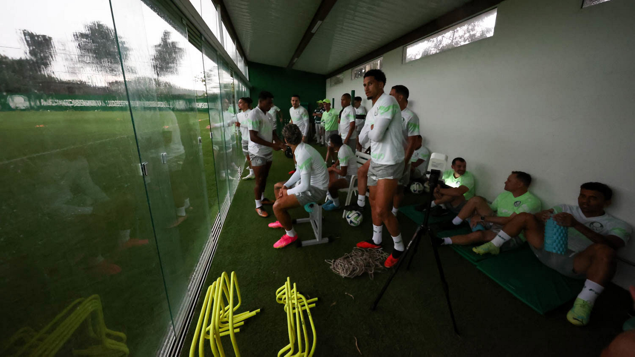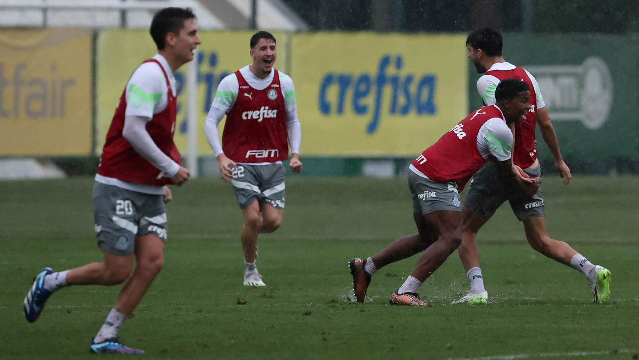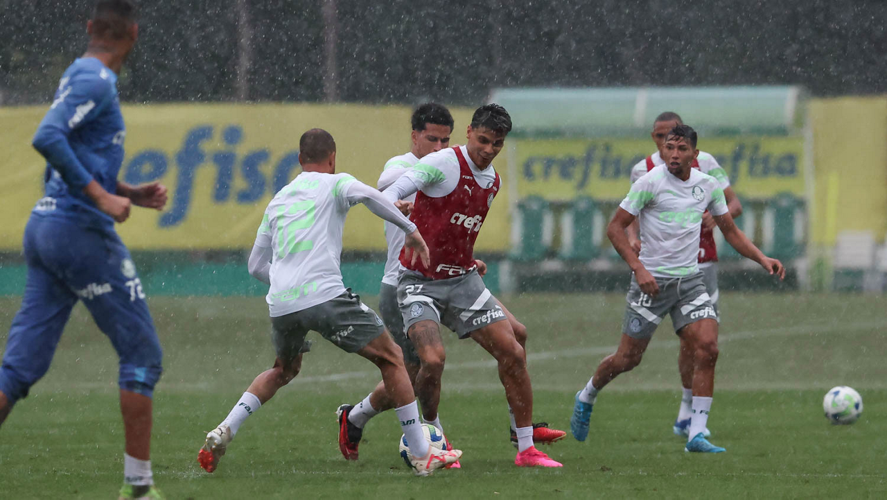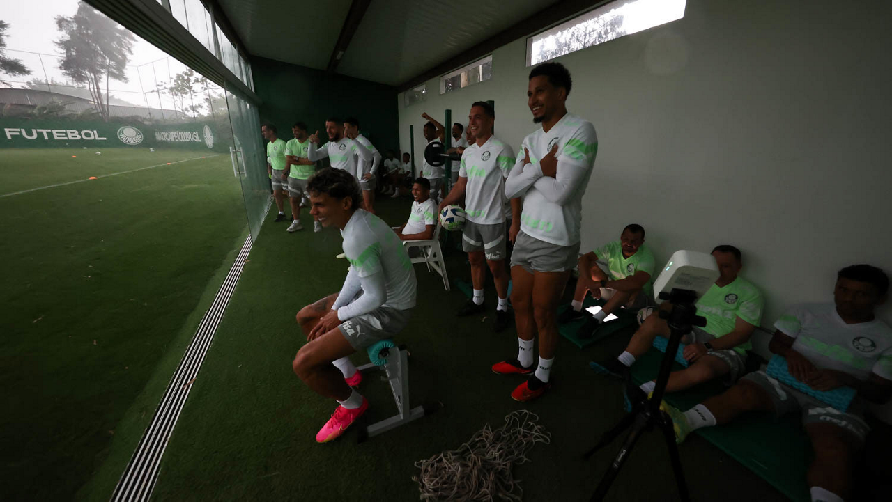 Os jogadores Eduard Atuesta, Luis Guilherme, Fabinho, Gustavo Gómez, Naves, Flaco López, Joaquín Piquerez, Garcia e Mateus (E/D em pé), Endrick, Richard Ríos, Jhonatan, Vanderlan, Weverton e Sá (E/D agachados) e o auxiliar técnico Andrey Lopes (C), da SE Palmeiras, durante treinamento, na Academia de Futebol. (Foto: Cesar Greco/Palmeiras/by Canon)