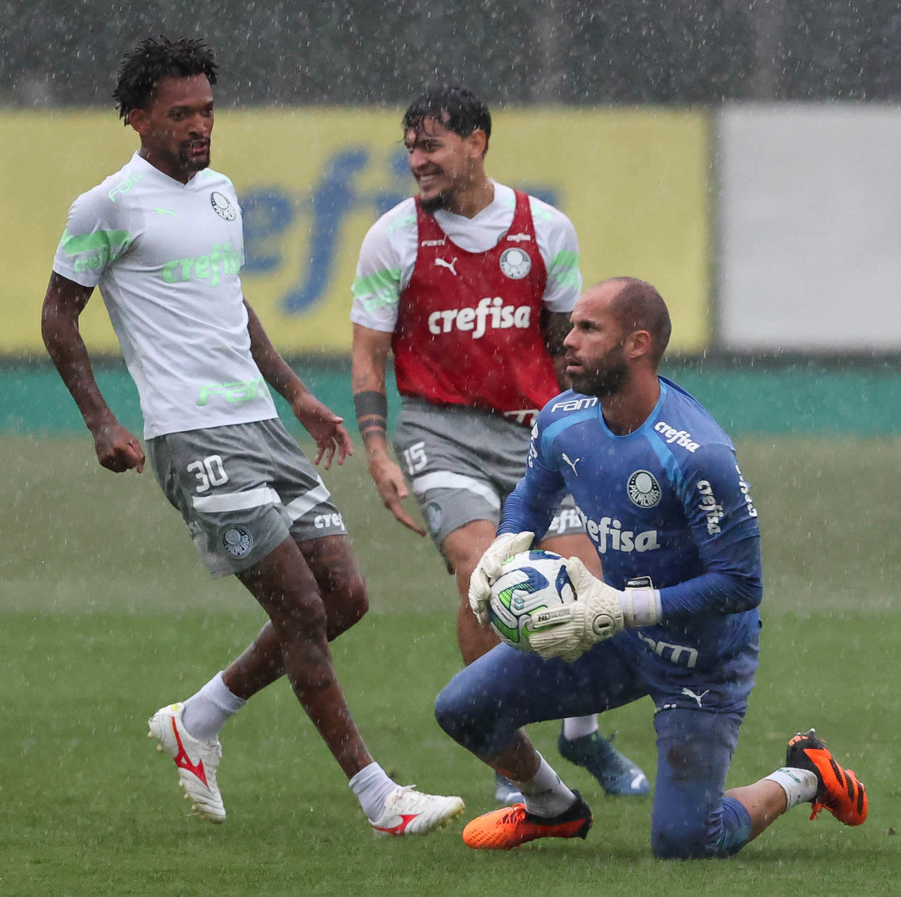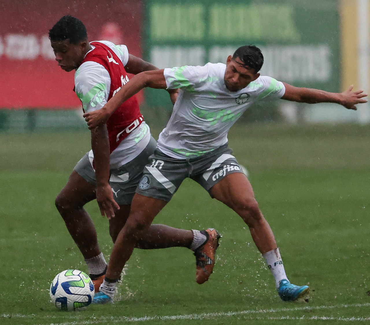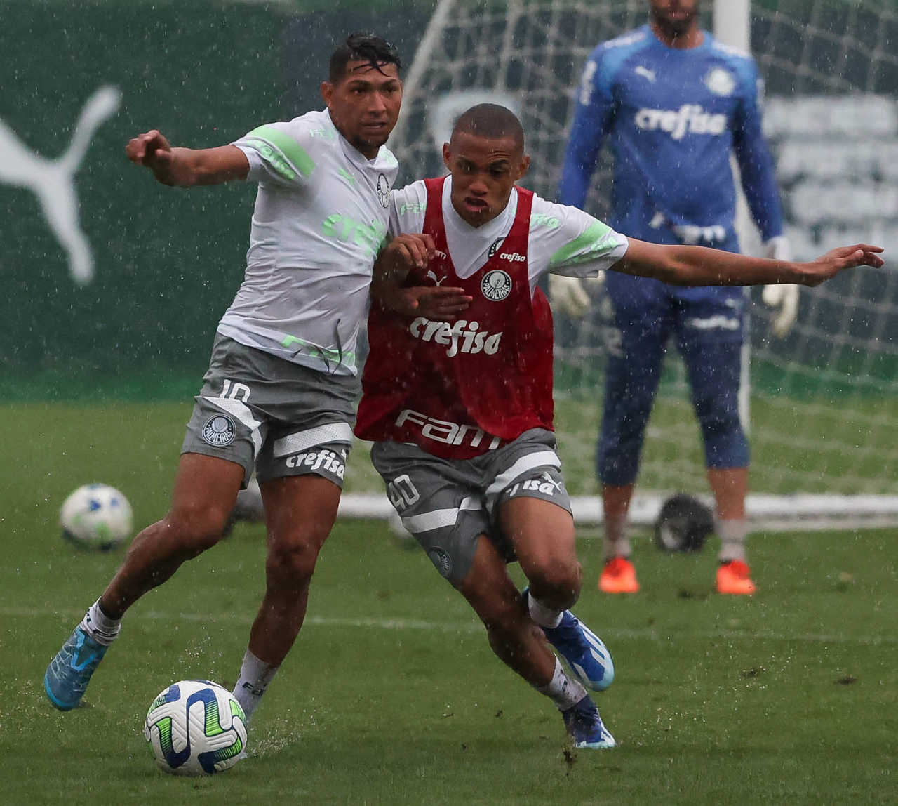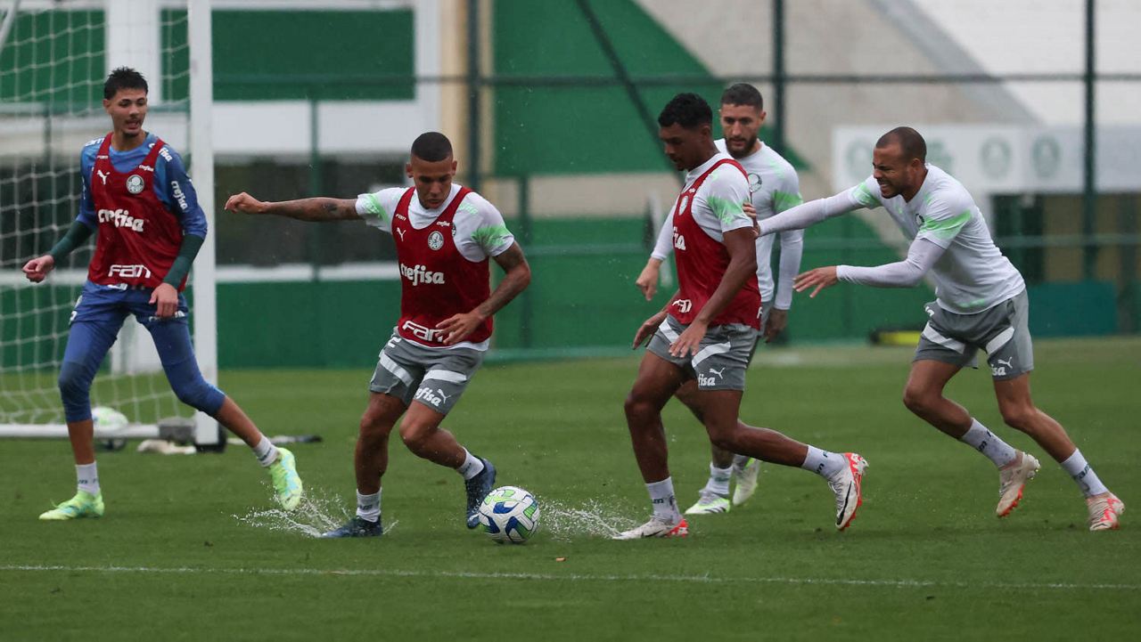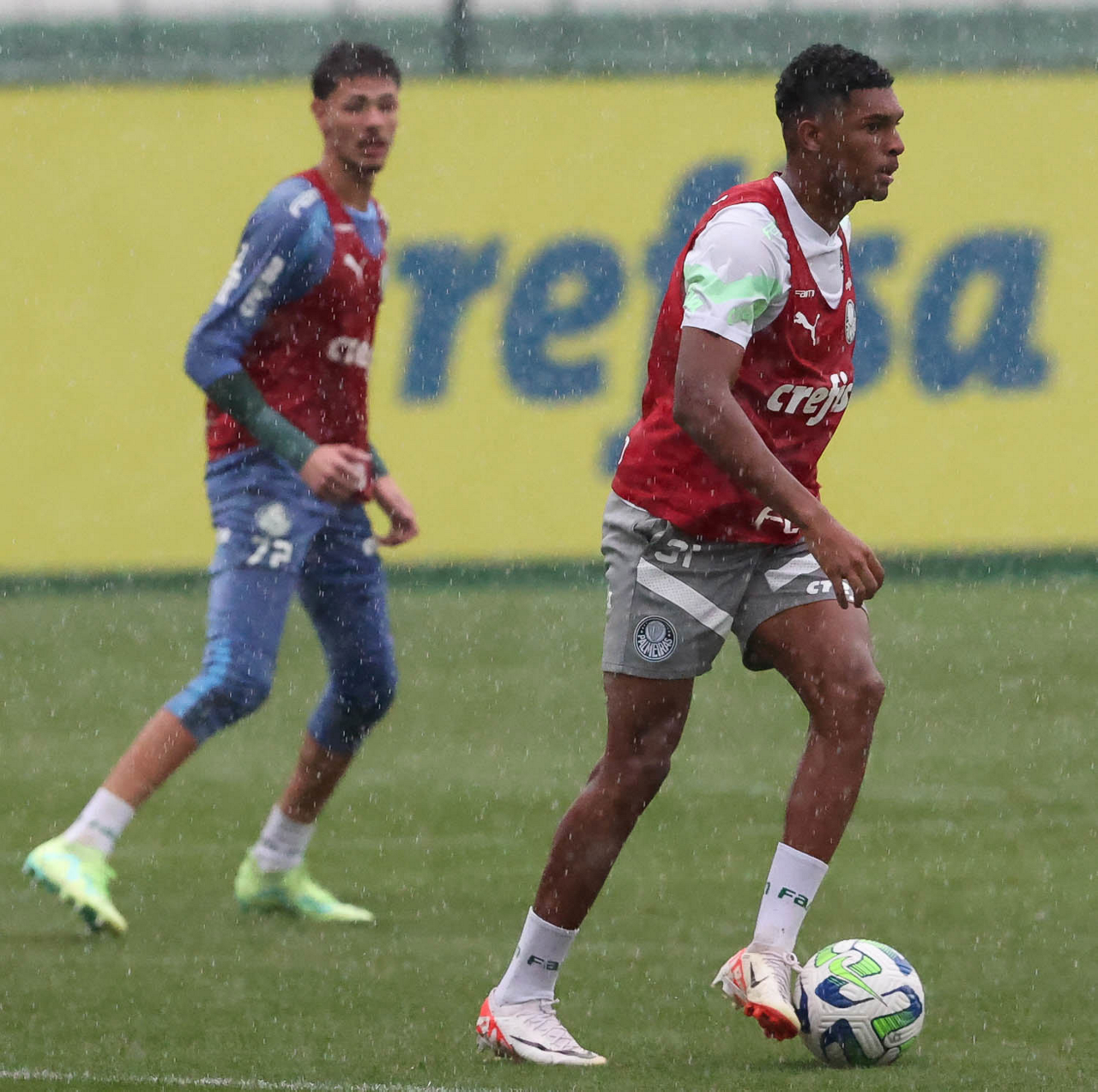 Os jogadores Eduard Atuesta, Luis Guilherme, Fabinho, Gustavo Gómez, Naves, Flaco López, Joaquín Piquerez, Garcia e Mateus (E/D em pé), Endrick, Richard Ríos, Jhonatan, Vanderlan, Weverton e Sá (E/D agachados) e o auxiliar técnico Andrey Lopes (C), da SE Palmeiras, durante treinamento, na Academia de Futebol. (Foto: Cesar Greco/Palmeiras/by Canon)