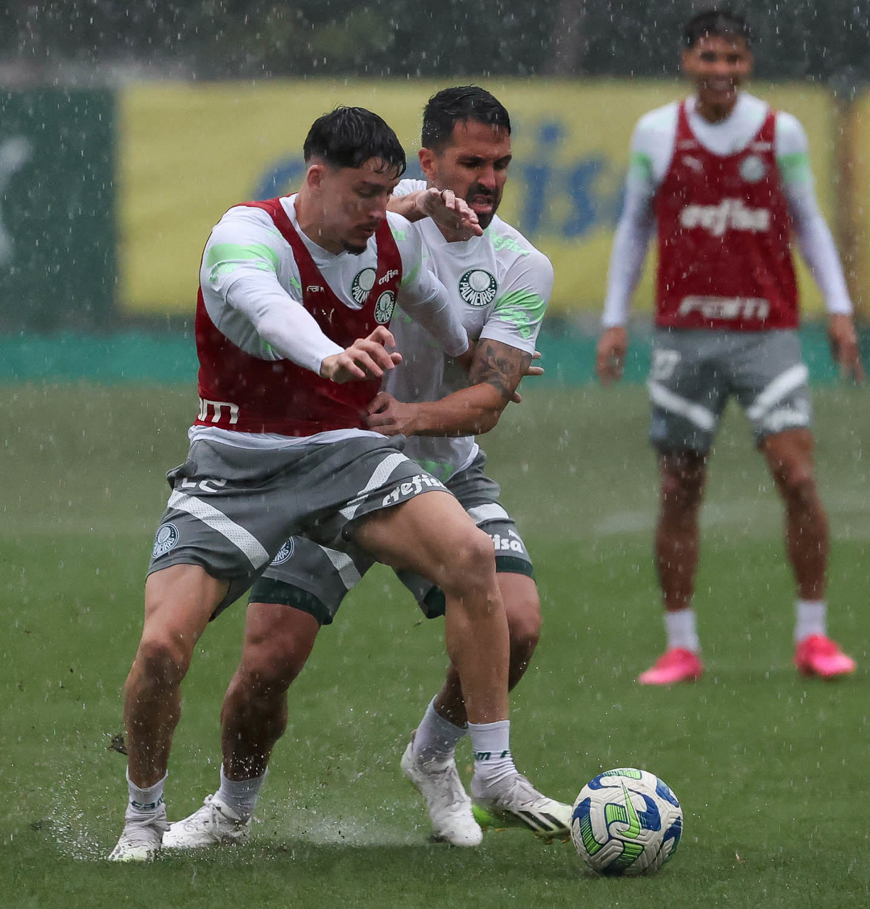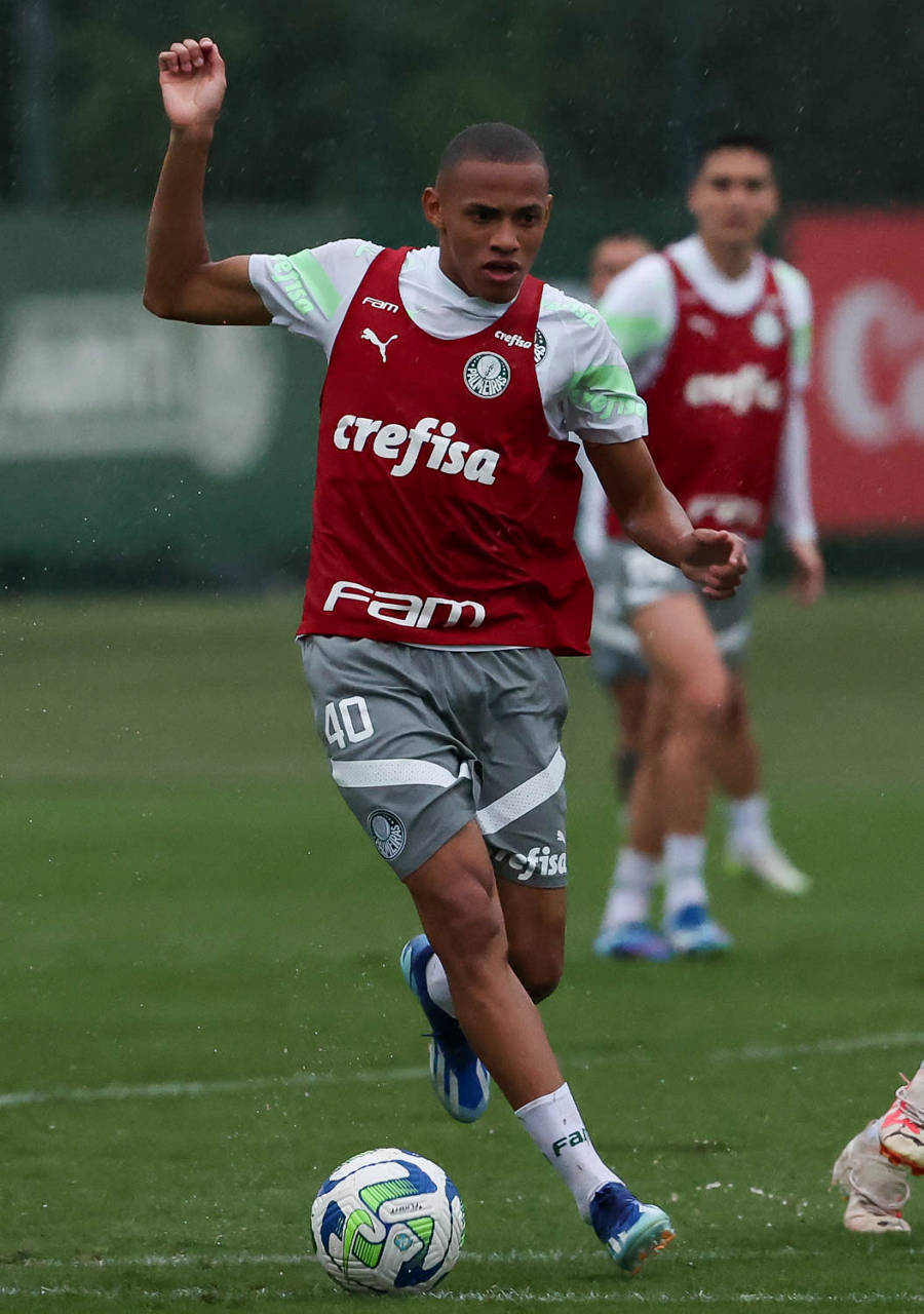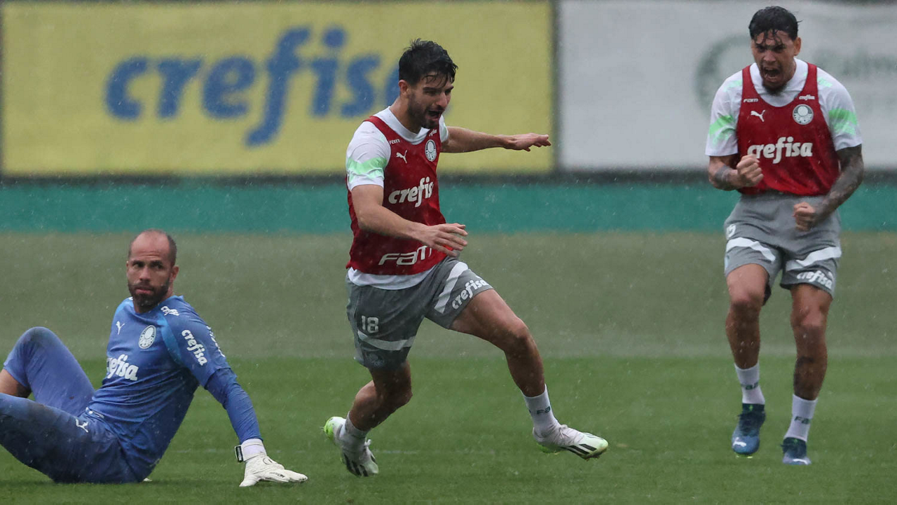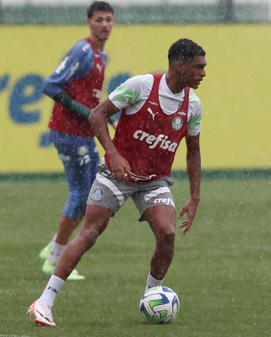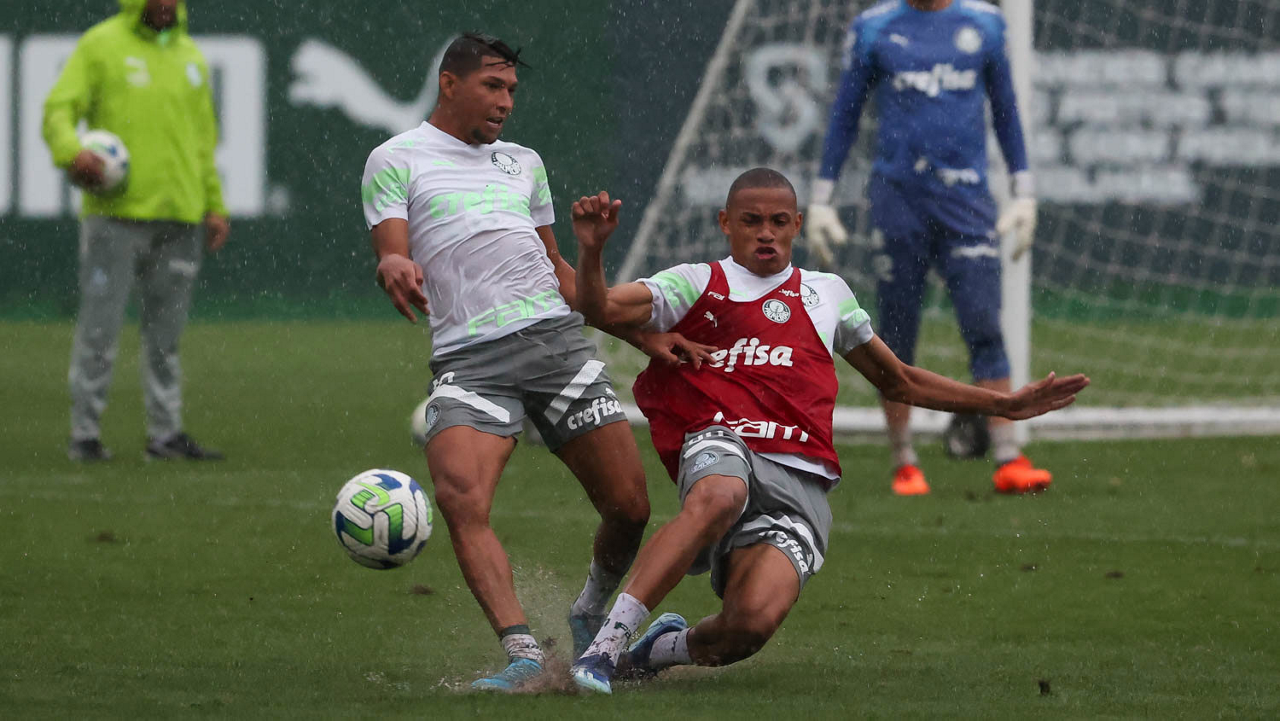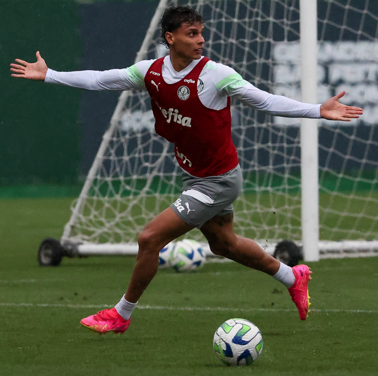 Os jogadores Eduard Atuesta, Luis Guilherme, Fabinho, Gustavo Gómez, Naves, Flaco López, Joaquín Piquerez, Garcia e Mateus (E/D em pé), Endrick, Richard Ríos, Jhonatan, Vanderlan, Weverton e Sá (E/D agachados) e o auxiliar técnico Andrey Lopes (C), da SE Palmeiras, durante treinamento, na Academia de Futebol. (Foto: Cesar Greco/Palmeiras/by Canon)