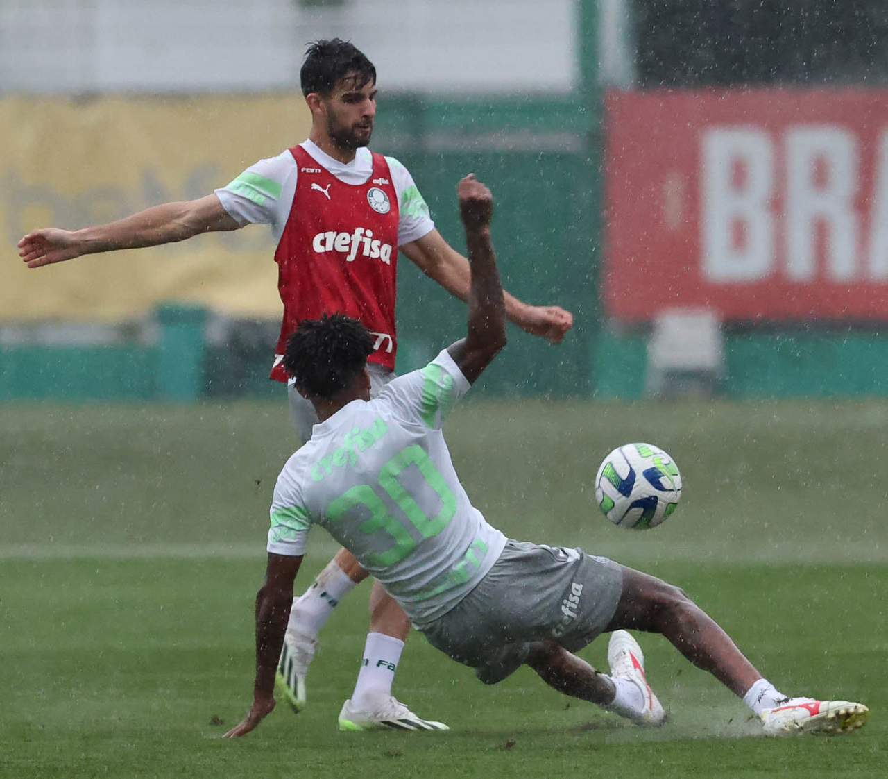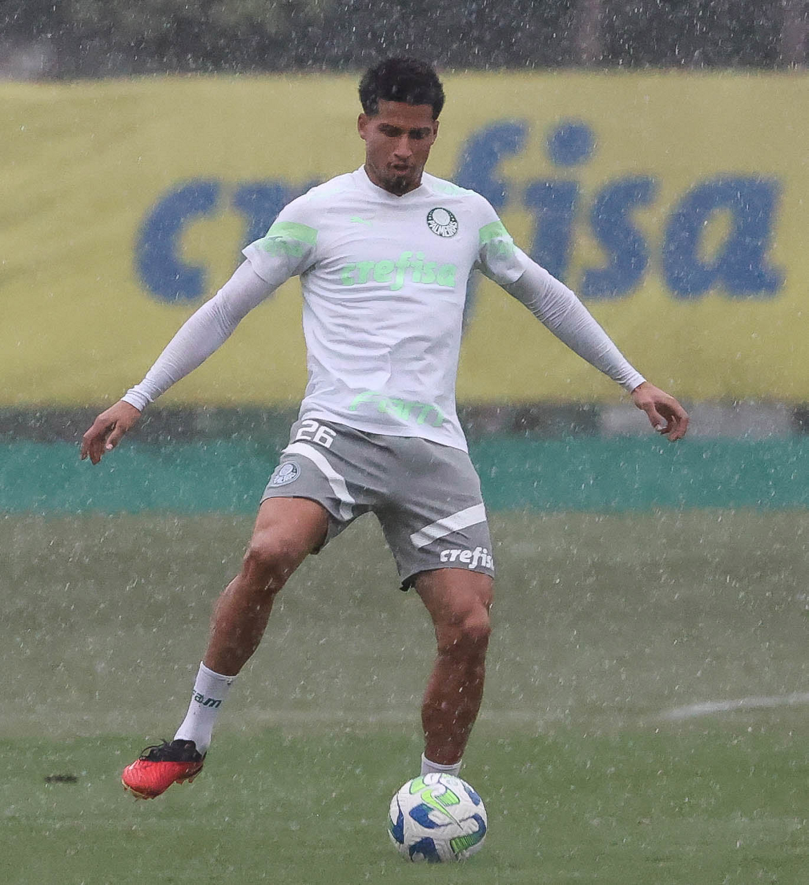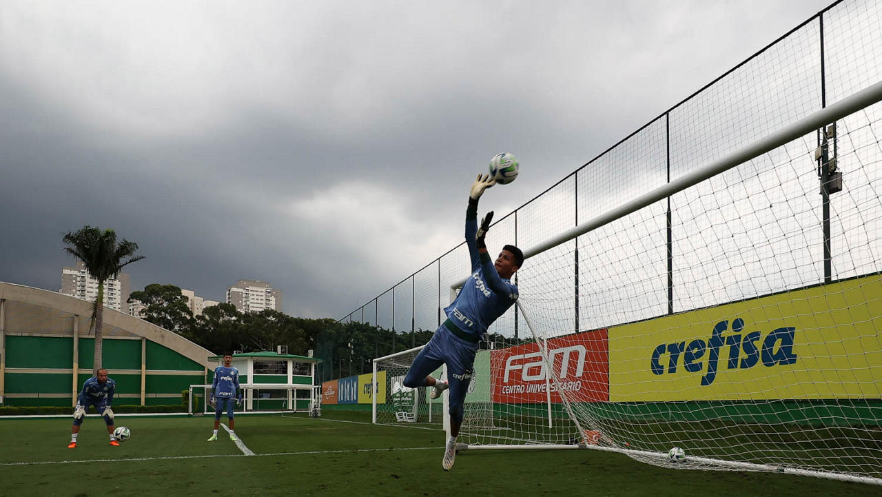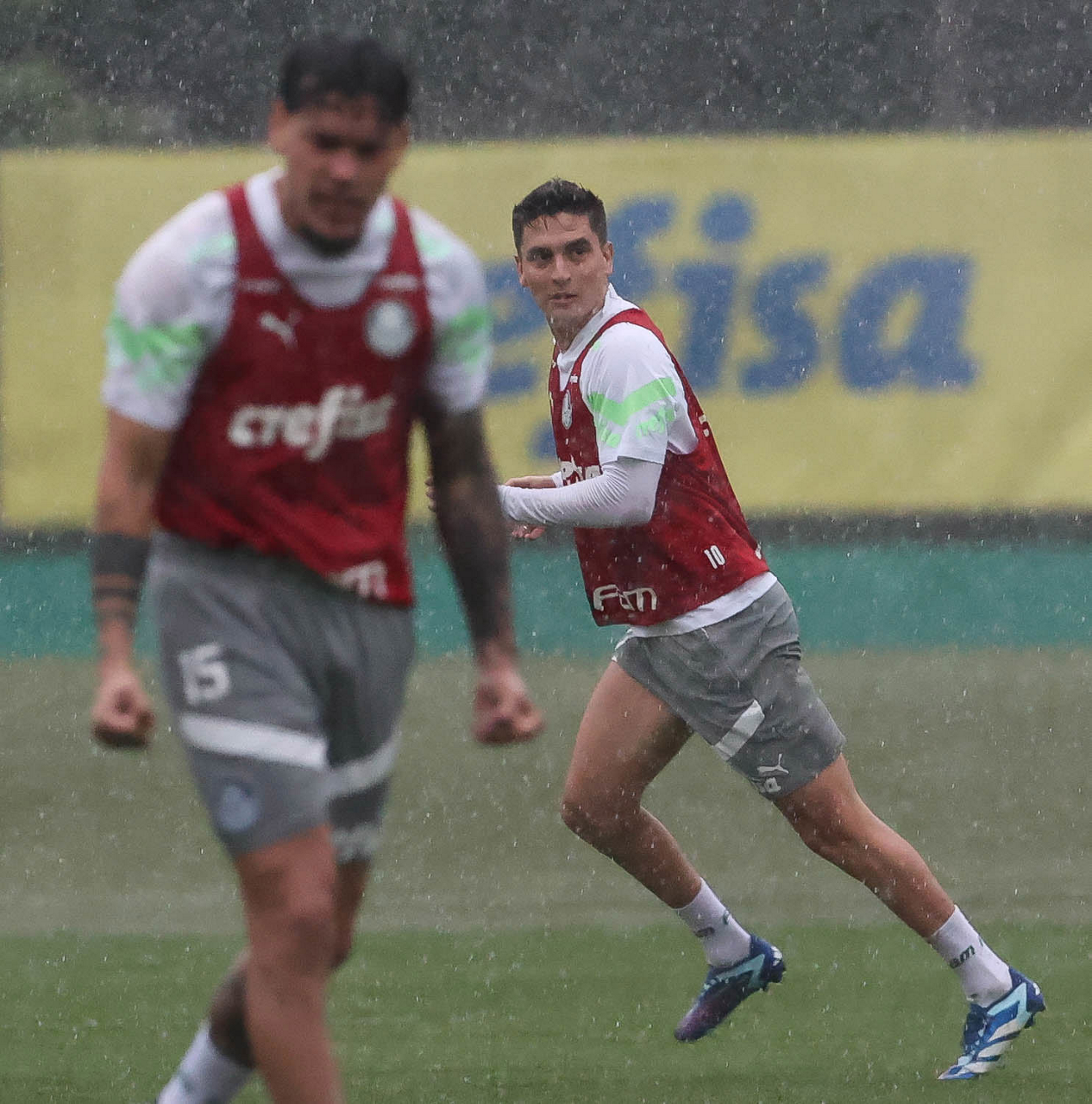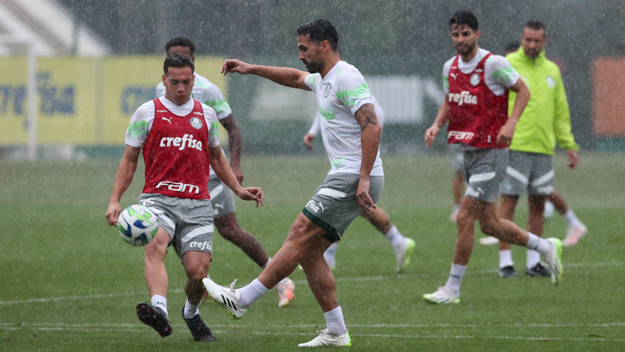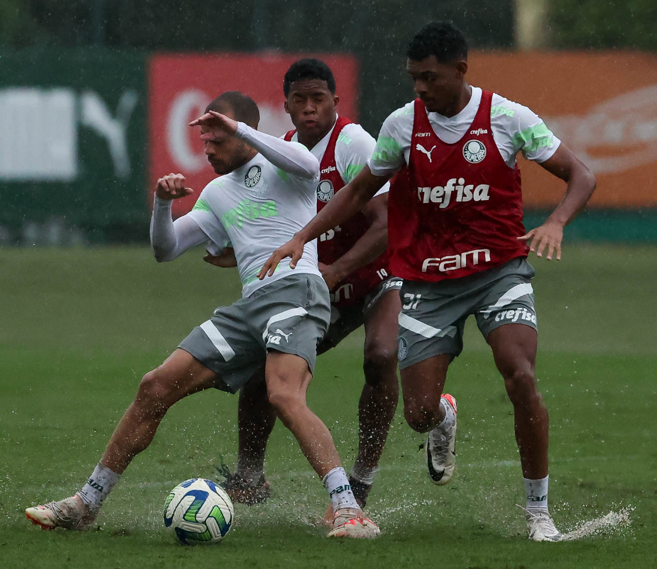 Os jogadores Eduard Atuesta, Luis Guilherme, Fabinho, Gustavo Gómez, Naves, Flaco López, Joaquín Piquerez, Garcia e Mateus (E/D em pé), Endrick, Richard Ríos, Jhonatan, Vanderlan, Weverton e Sá (E/D agachados) e o auxiliar técnico Andrey Lopes (C), da SE Palmeiras, durante treinamento, na Academia de Futebol. (Foto: Cesar Greco/Palmeiras/by Canon)