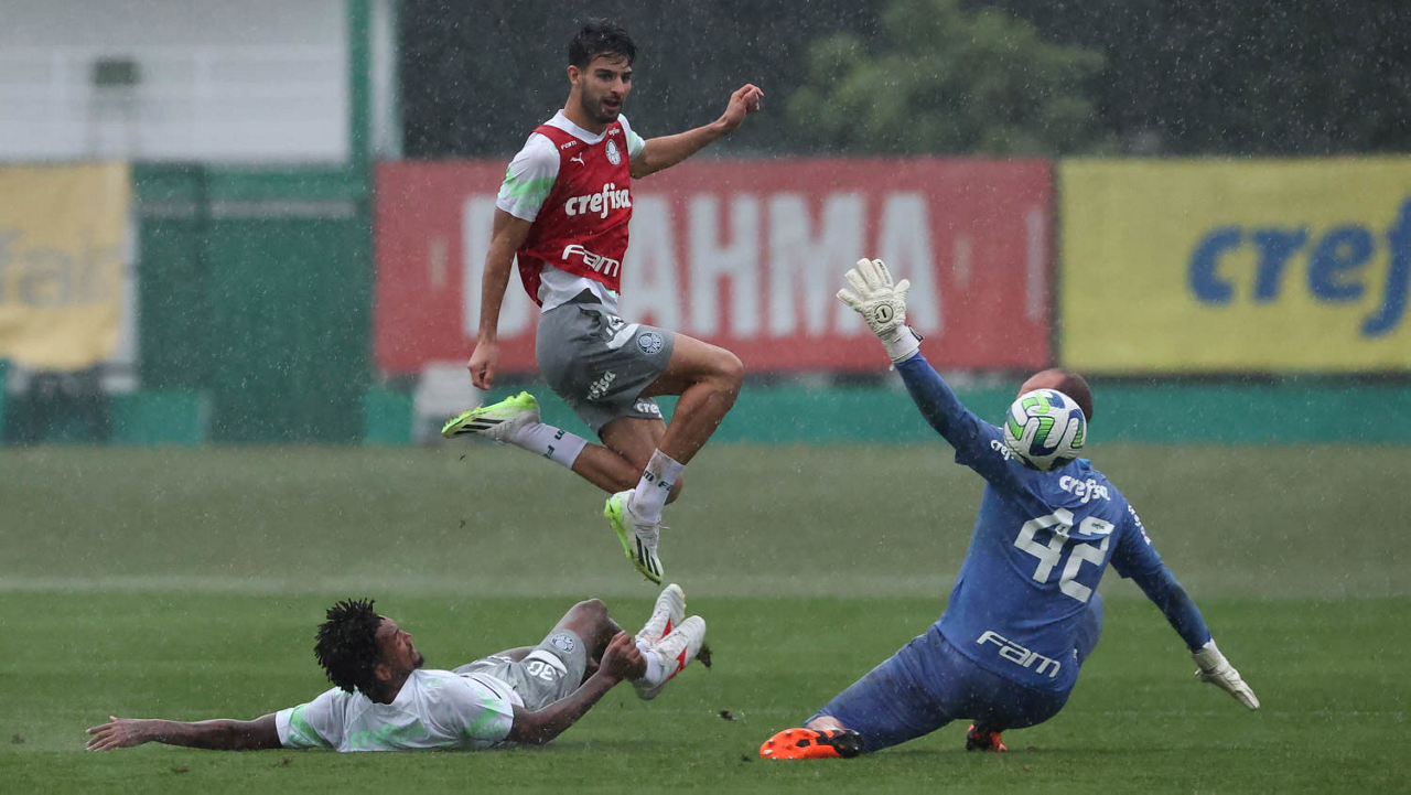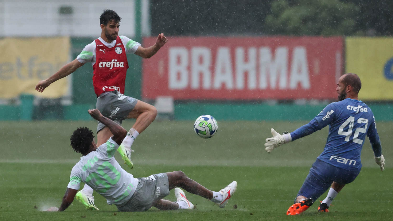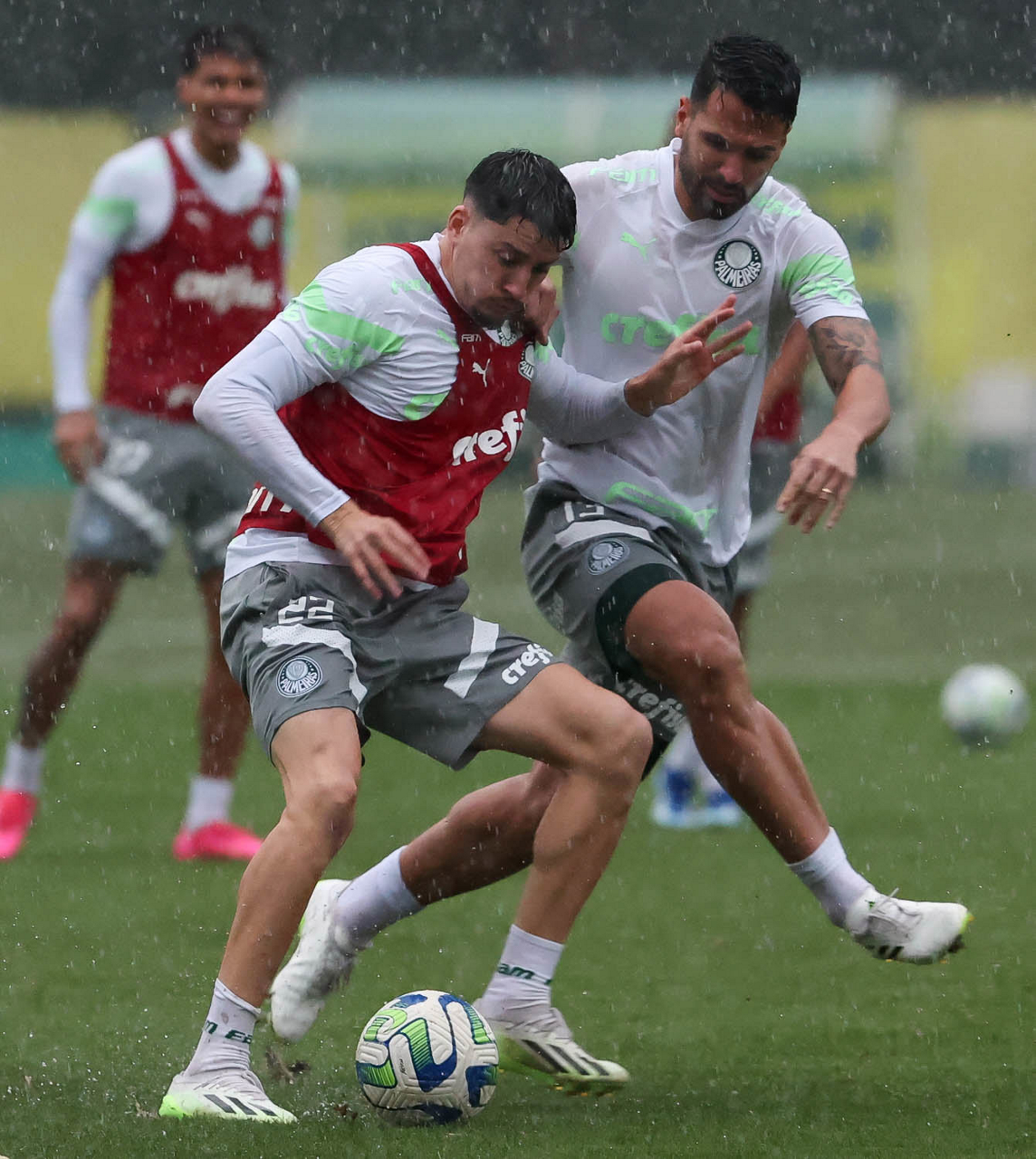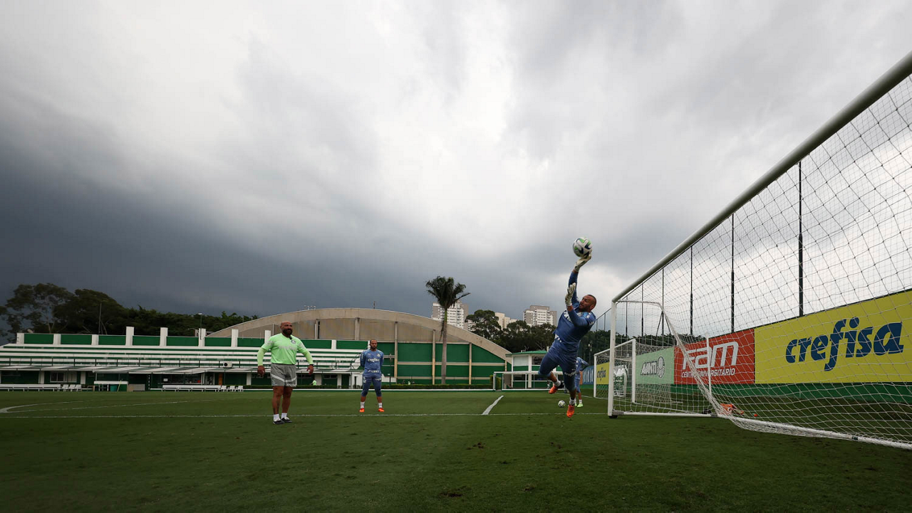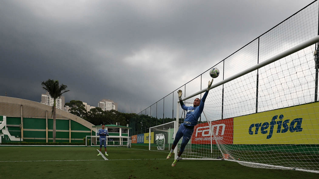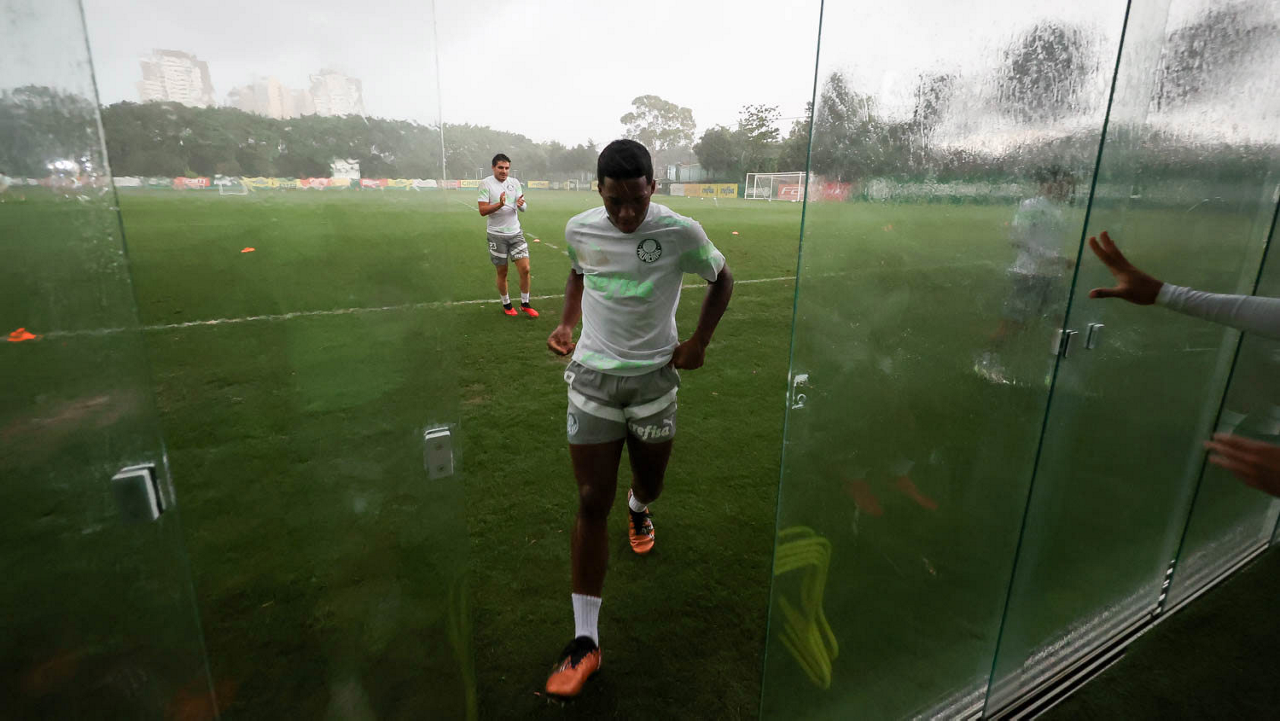 Os jogadores Eduard Atuesta, Luis Guilherme, Fabinho, Gustavo Gómez, Naves, Flaco López, Joaquín Piquerez, Garcia e Mateus (E/D em pé), Endrick, Richard Ríos, Jhonatan, Vanderlan, Weverton e Sá (E/D agachados) e o auxiliar técnico Andrey Lopes (C), da SE Palmeiras, durante treinamento, na Academia de Futebol. (Foto: Cesar Greco/Palmeiras/by Canon)