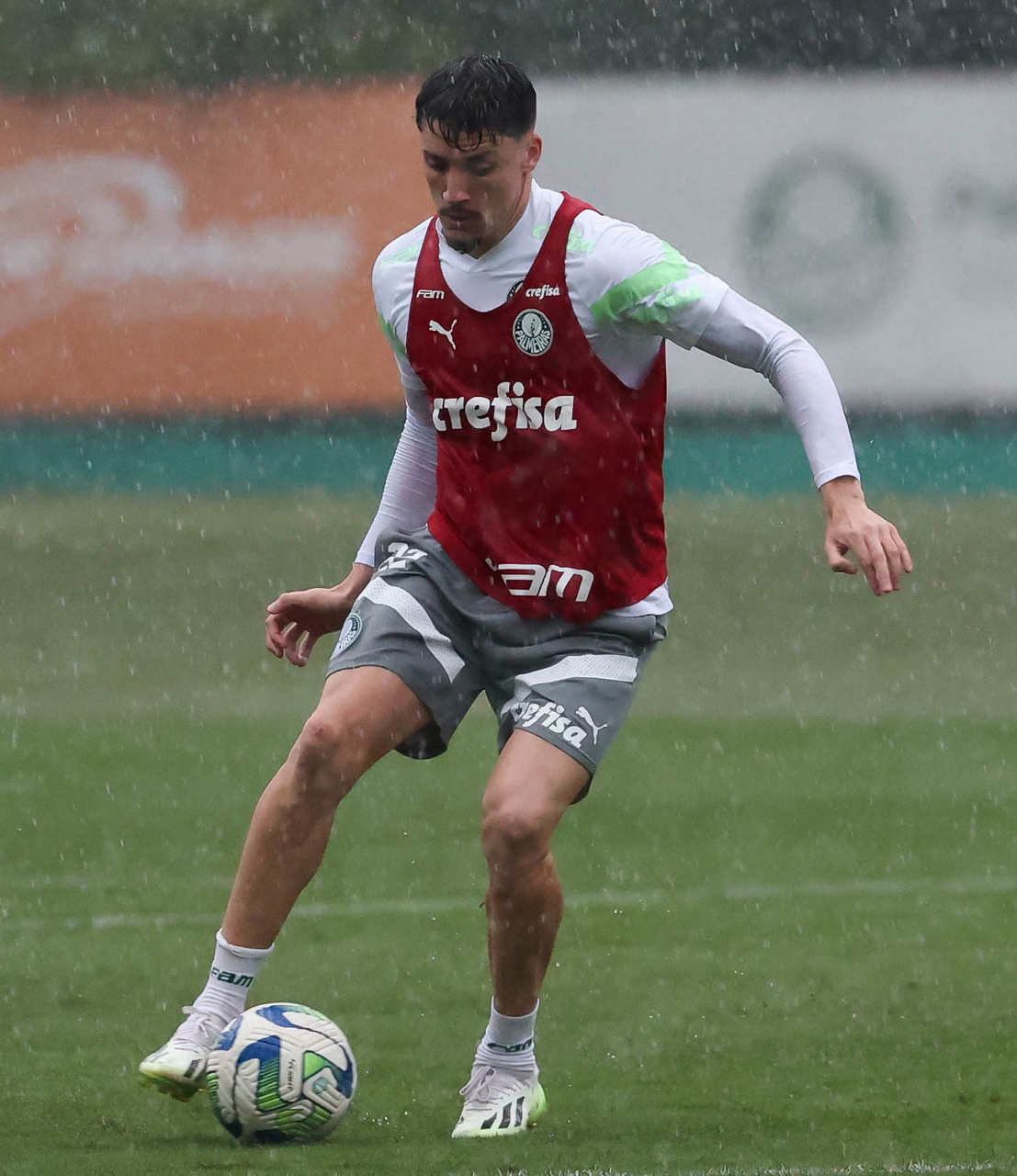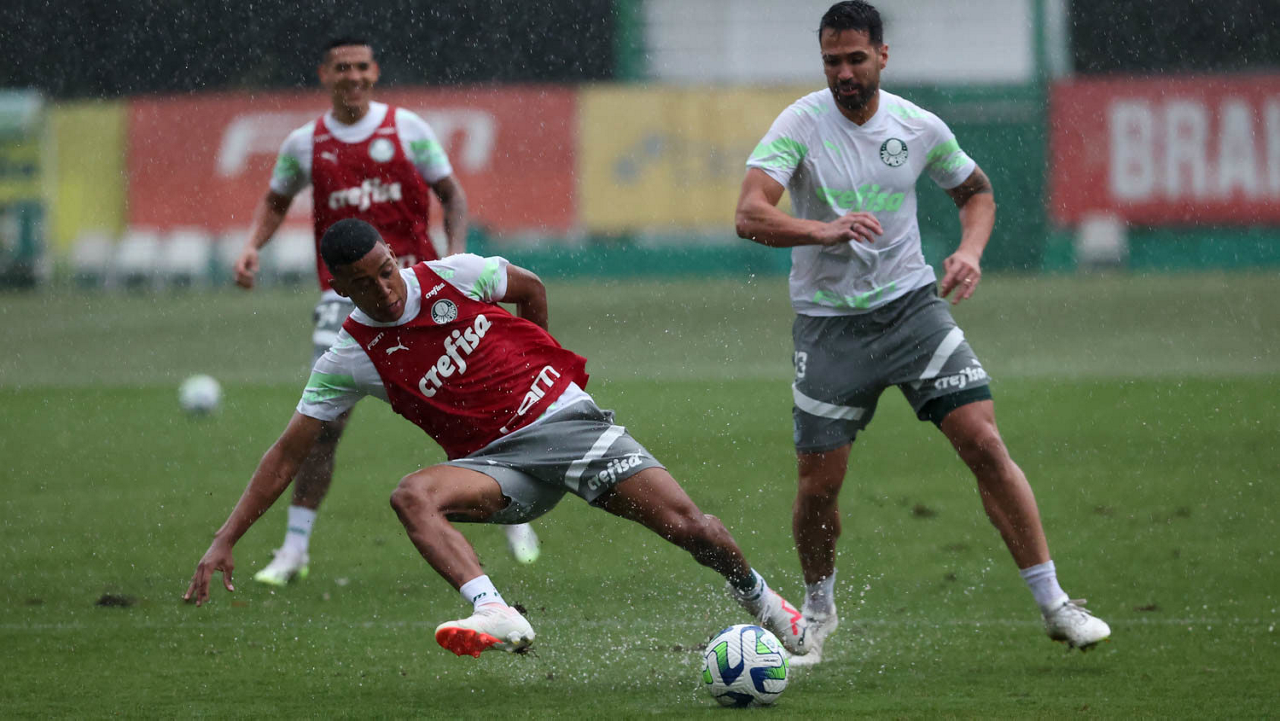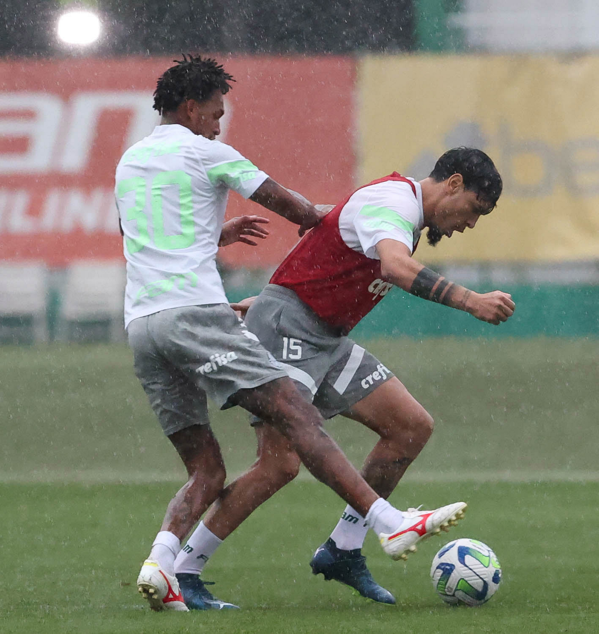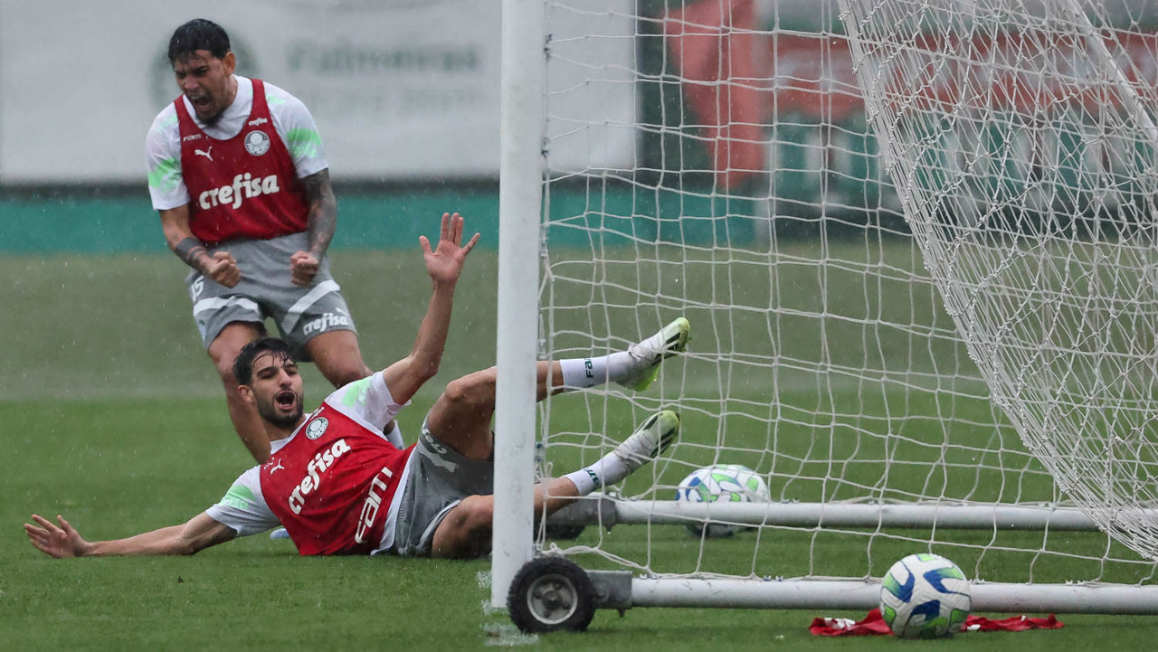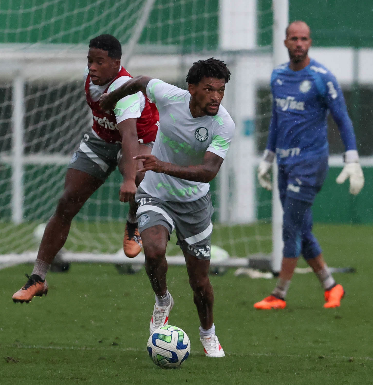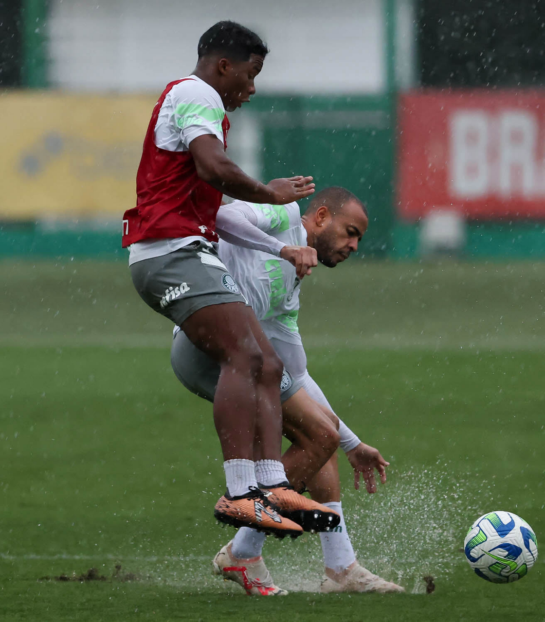 Os jogadores Eduard Atuesta, Luis Guilherme, Fabinho, Gustavo Gómez, Naves, Flaco López, Joaquín Piquerez, Garcia e Mateus (E/D em pé), Endrick, Richard Ríos, Jhonatan, Vanderlan, Weverton e Sá (E/D agachados) e o auxiliar técnico Andrey Lopes (C), da SE Palmeiras, durante treinamento, na Academia de Futebol. (Foto: Cesar Greco/Palmeiras/by Canon)