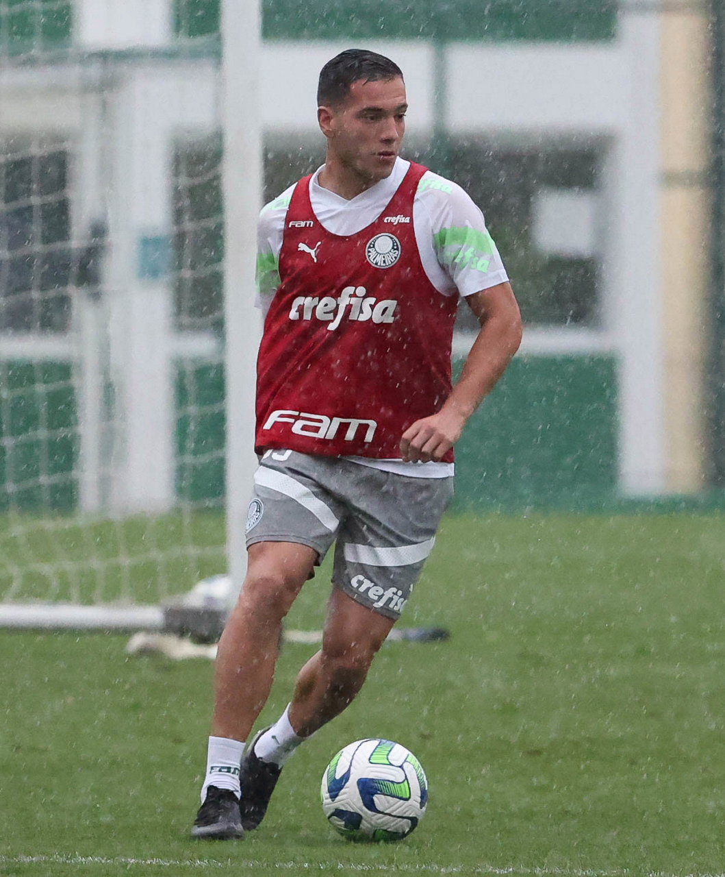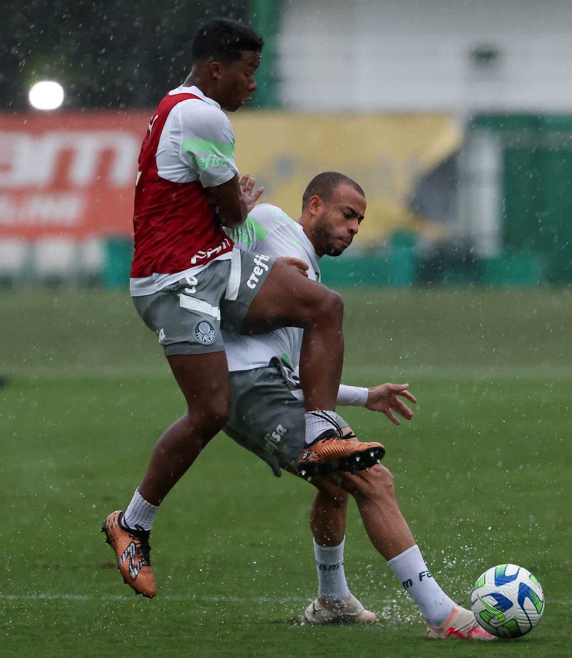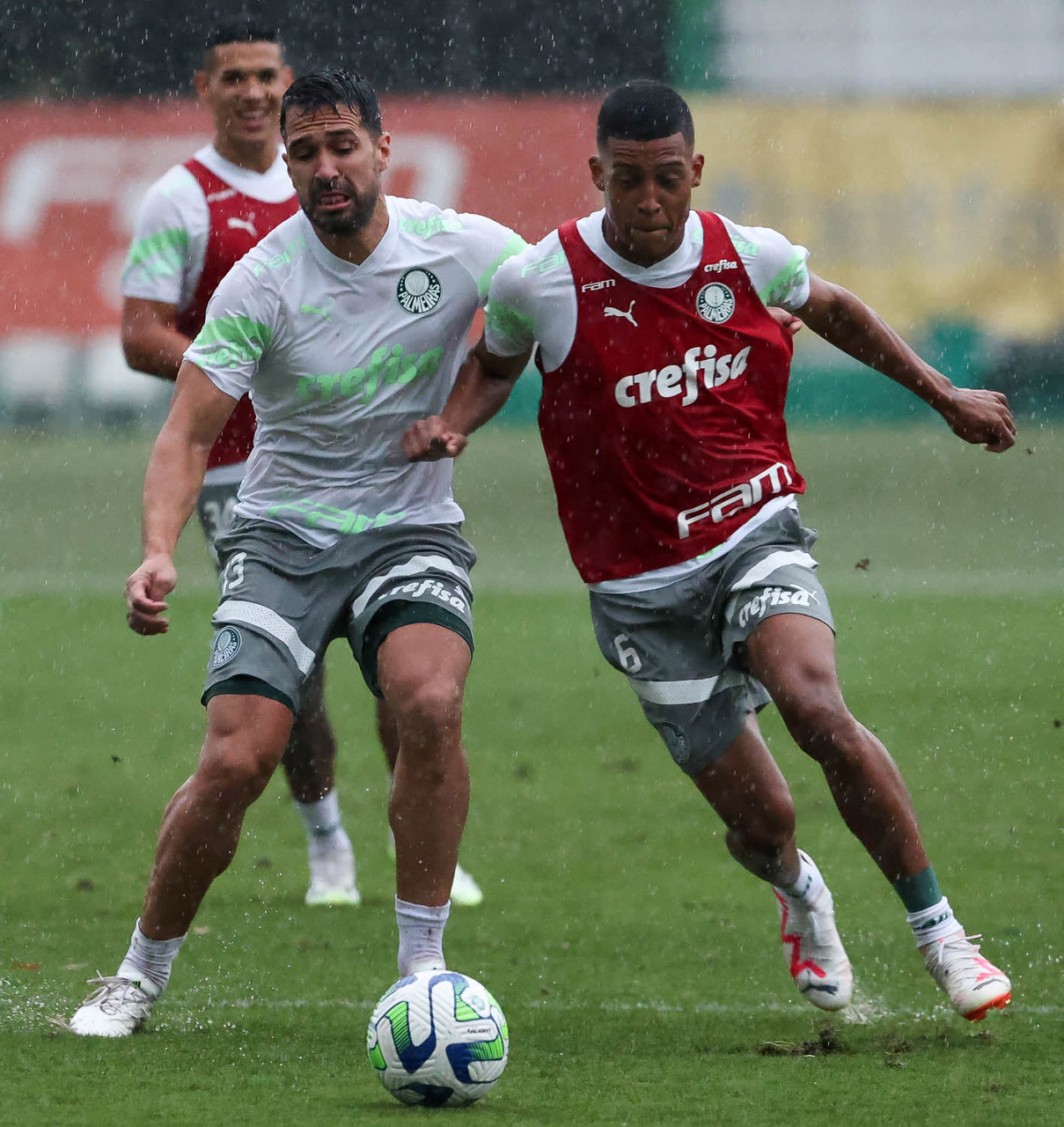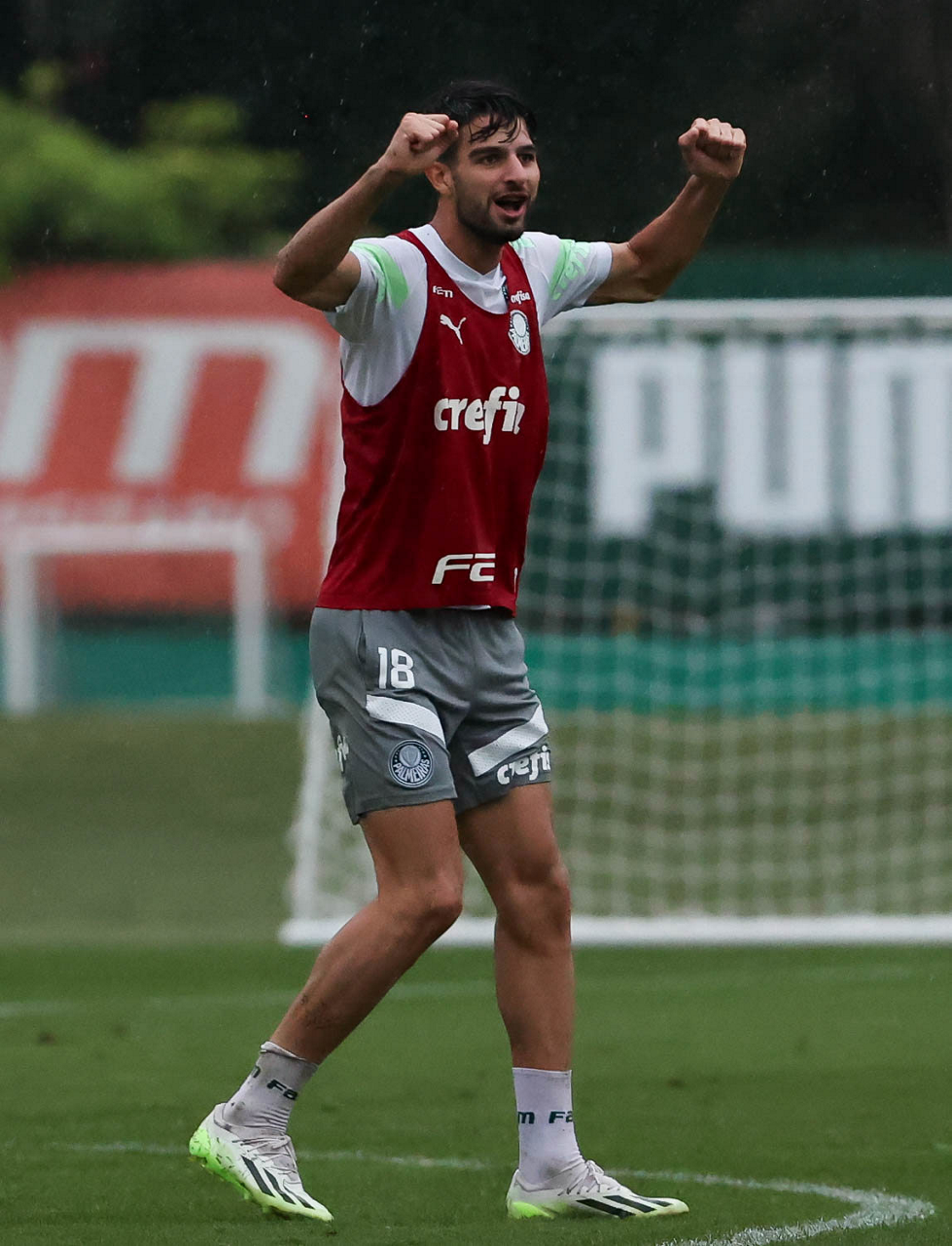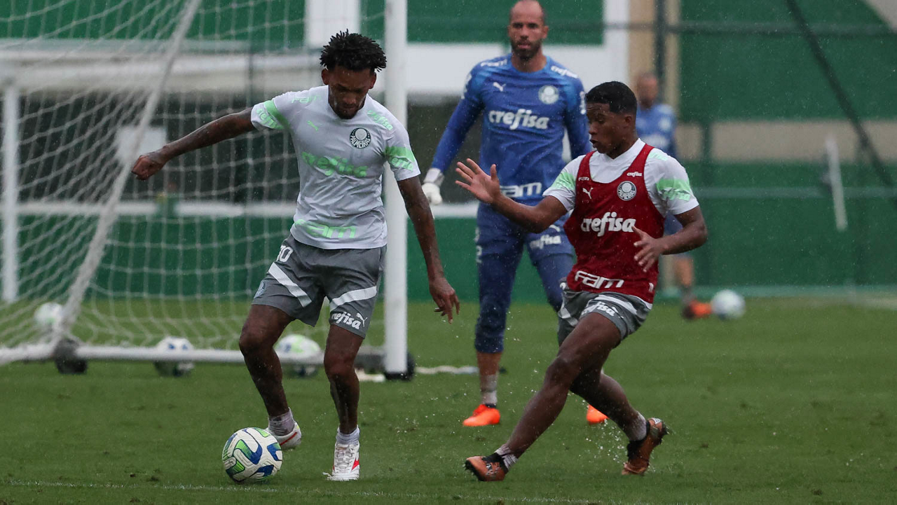 Os jogadores Eduard Atuesta, Luis Guilherme, Fabinho, Gustavo Gómez, Naves, Flaco López, Joaquín Piquerez, Garcia e Mateus (E/D em pé), Endrick, Richard Ríos, Jhonatan, Vanderlan, Weverton e Sá (E/D agachados) e o auxiliar técnico Andrey Lopes (C), da SE Palmeiras, durante treinamento, na Academia de Futebol. (Foto: Cesar Greco/Palmeiras/by Canon)