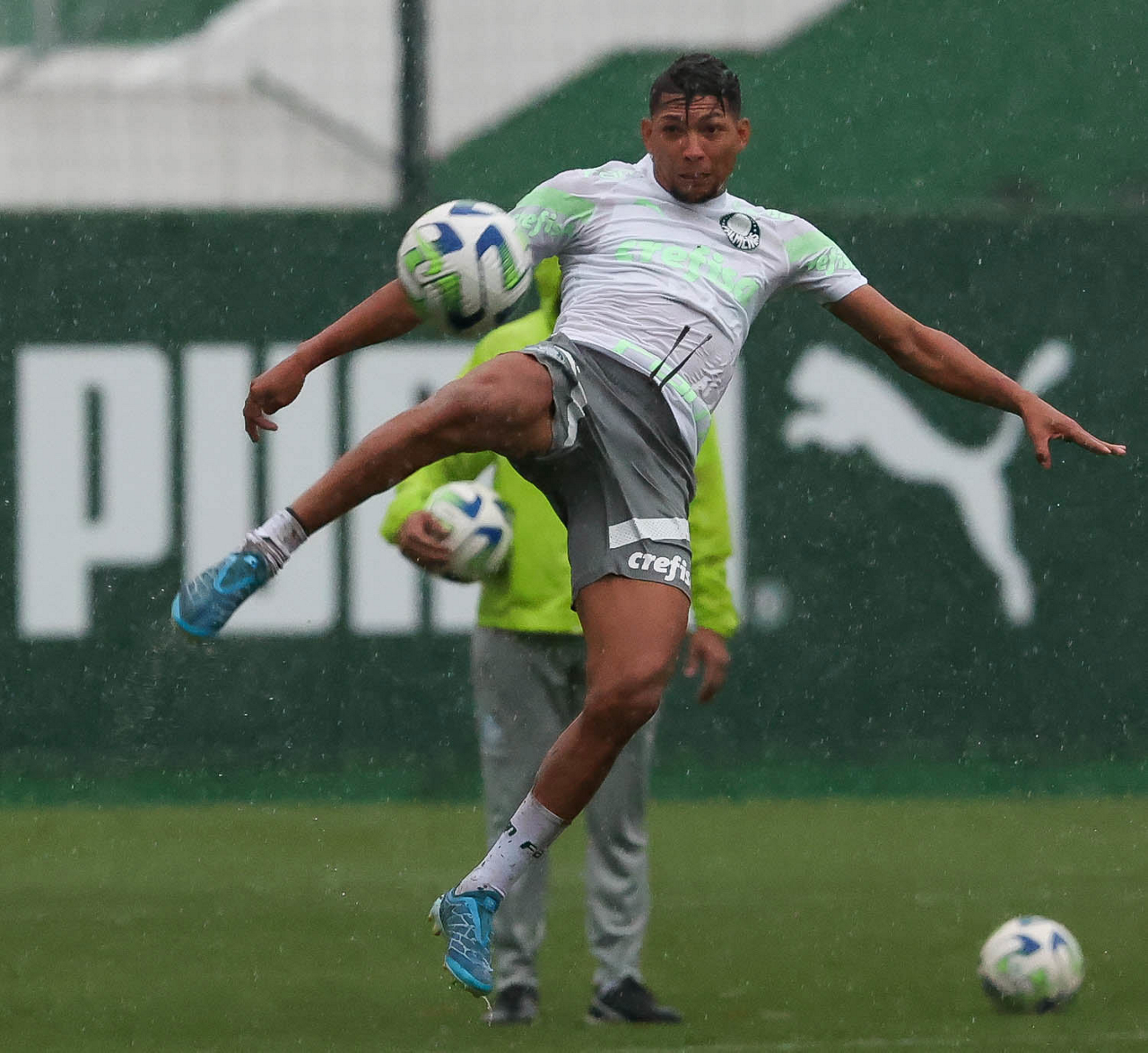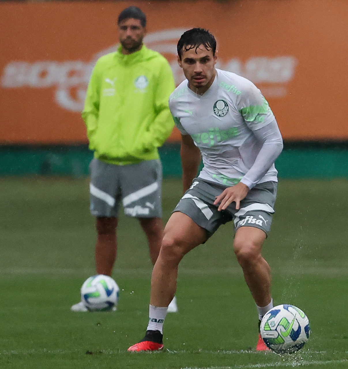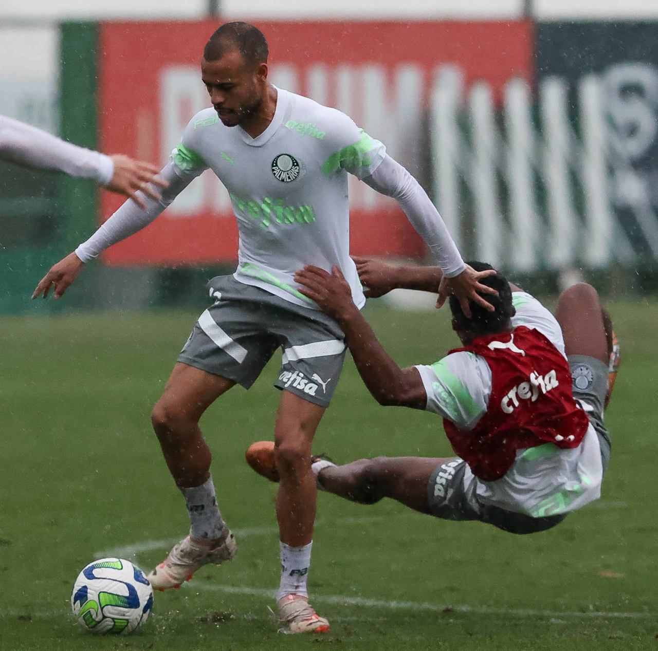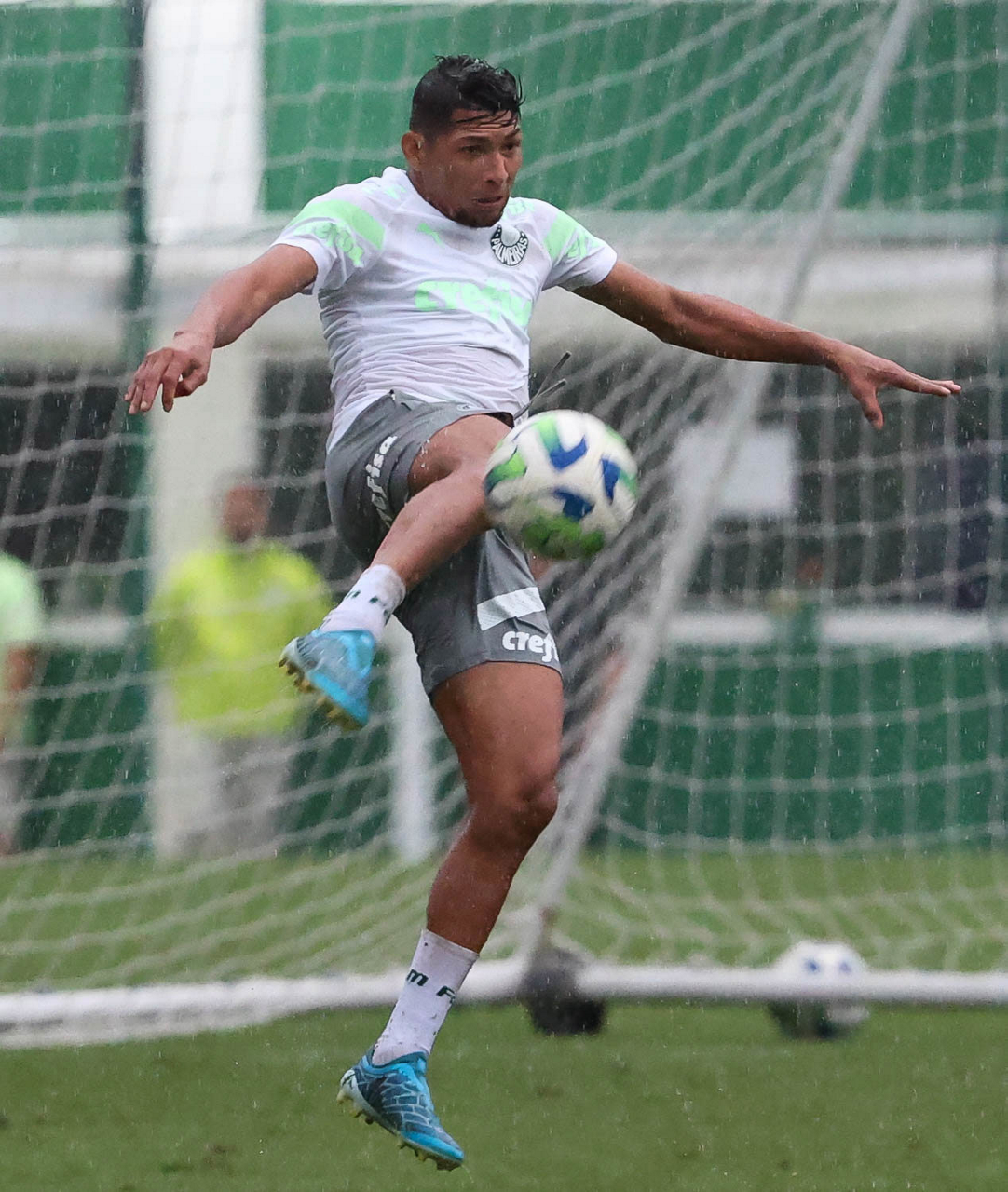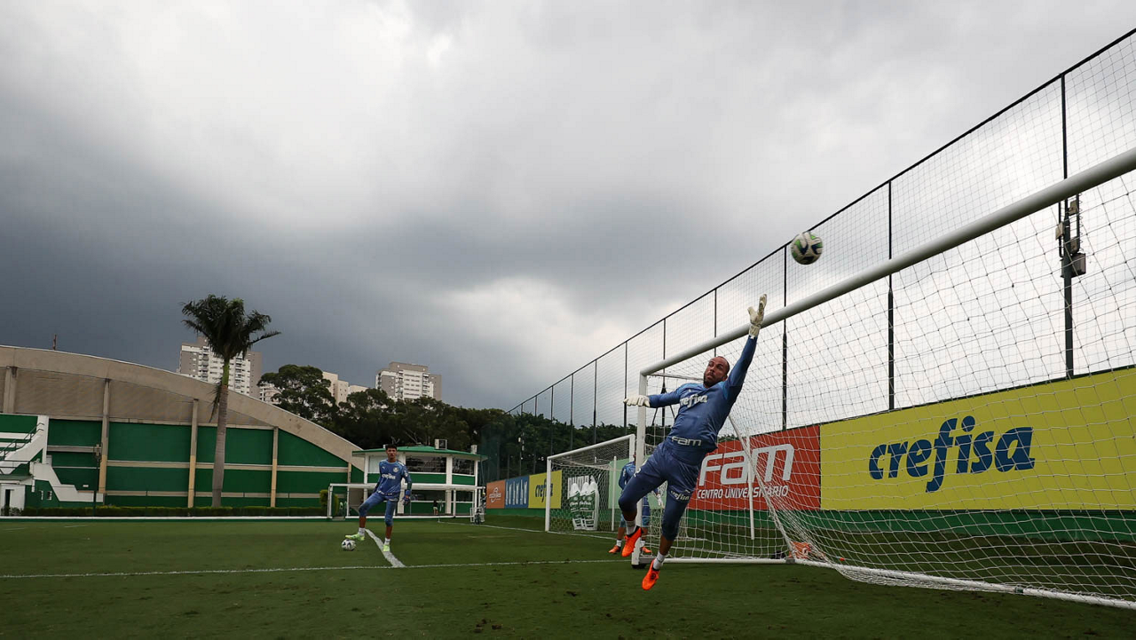 Os jogadores Eduard Atuesta, Luis Guilherme, Fabinho, Gustavo Gómez, Naves, Flaco López, Joaquín Piquerez, Garcia e Mateus (E/D em pé), Endrick, Richard Ríos, Jhonatan, Vanderlan, Weverton e Sá (E/D agachados) e o auxiliar técnico Andrey Lopes (C), da SE Palmeiras, durante treinamento, na Academia de Futebol. (Foto: Cesar Greco/Palmeiras/by Canon)