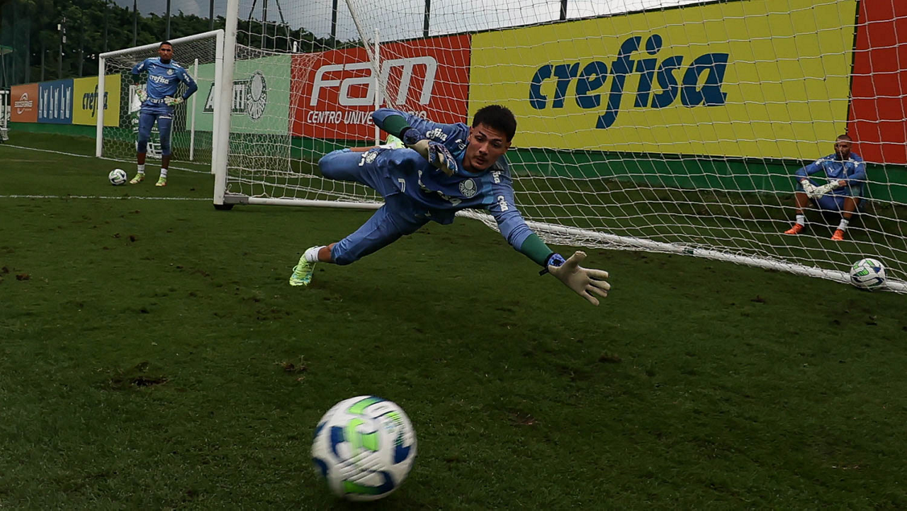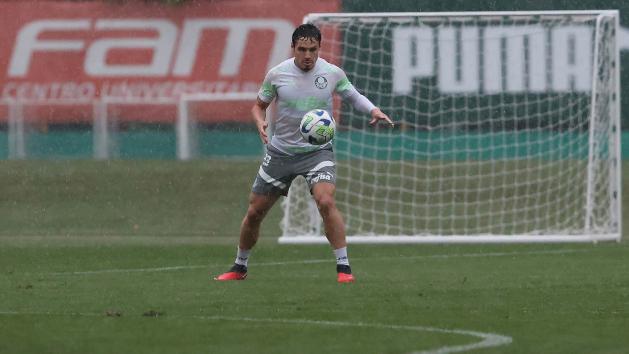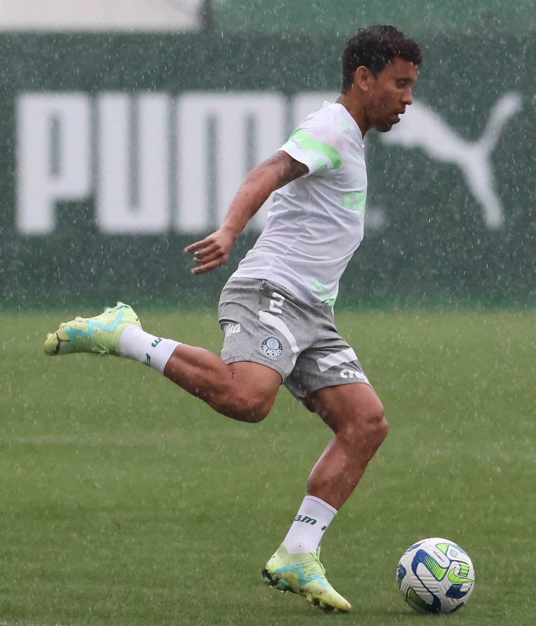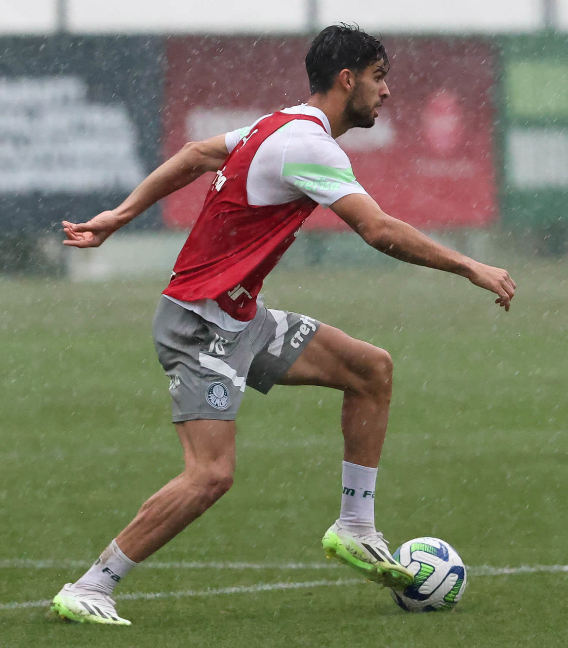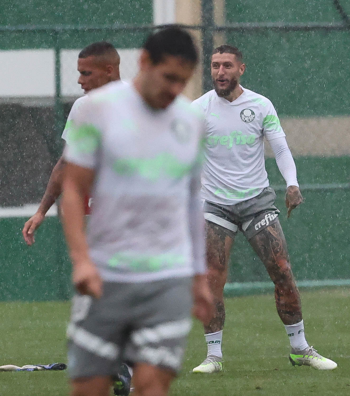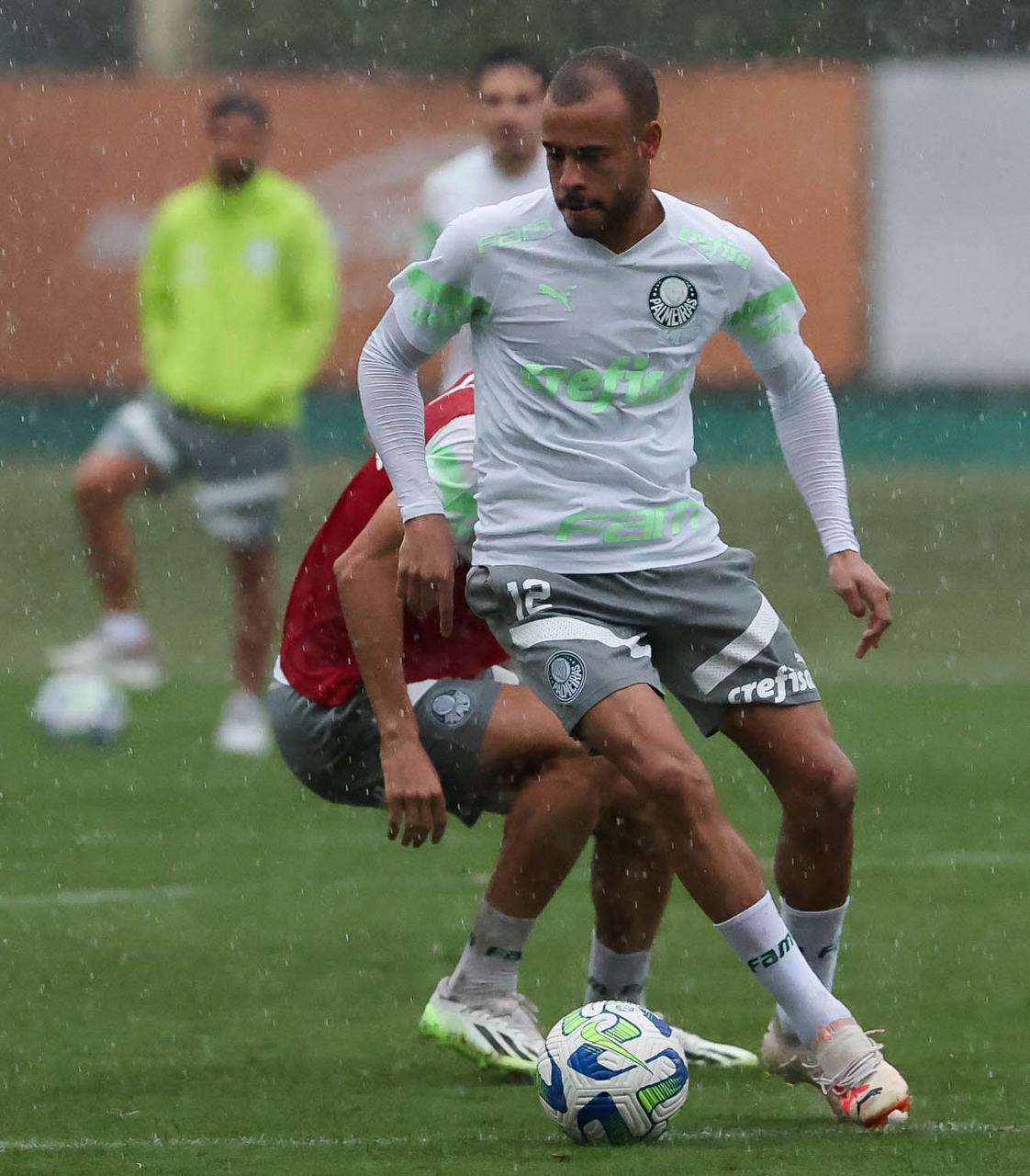 Os jogadores Eduard Atuesta, Luis Guilherme, Fabinho, Gustavo Gómez, Naves, Flaco López, Joaquín Piquerez, Garcia e Mateus (E/D em pé), Endrick, Richard Ríos, Jhonatan, Vanderlan, Weverton e Sá (E/D agachados) e o auxiliar técnico Andrey Lopes (C), da SE Palmeiras, durante treinamento, na Academia de Futebol. (Foto: Cesar Greco/Palmeiras/by Canon)