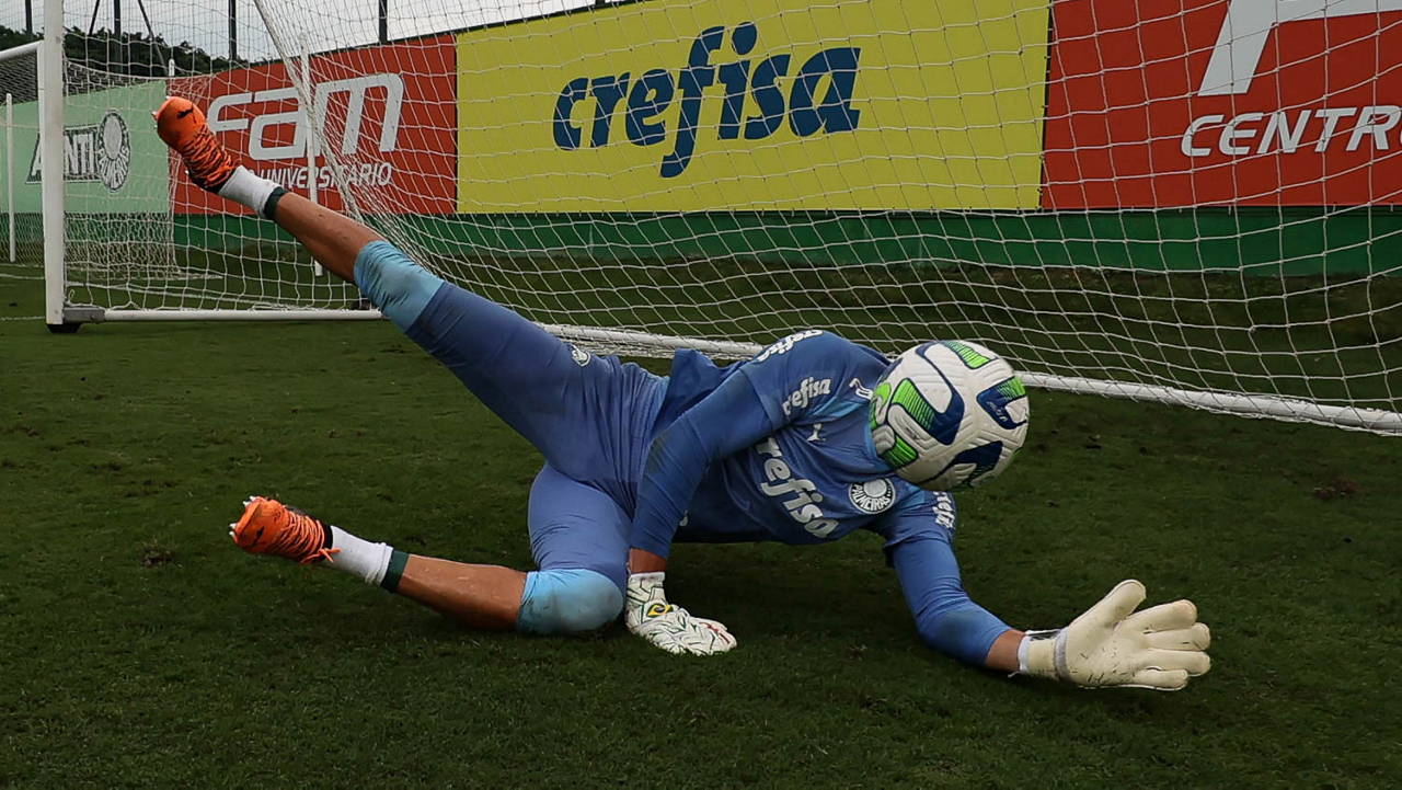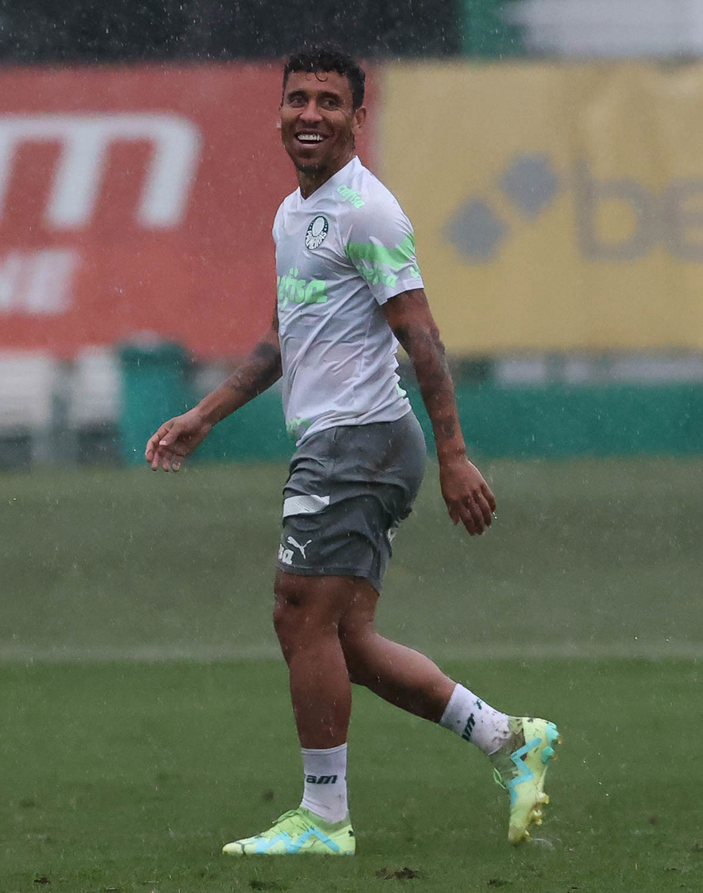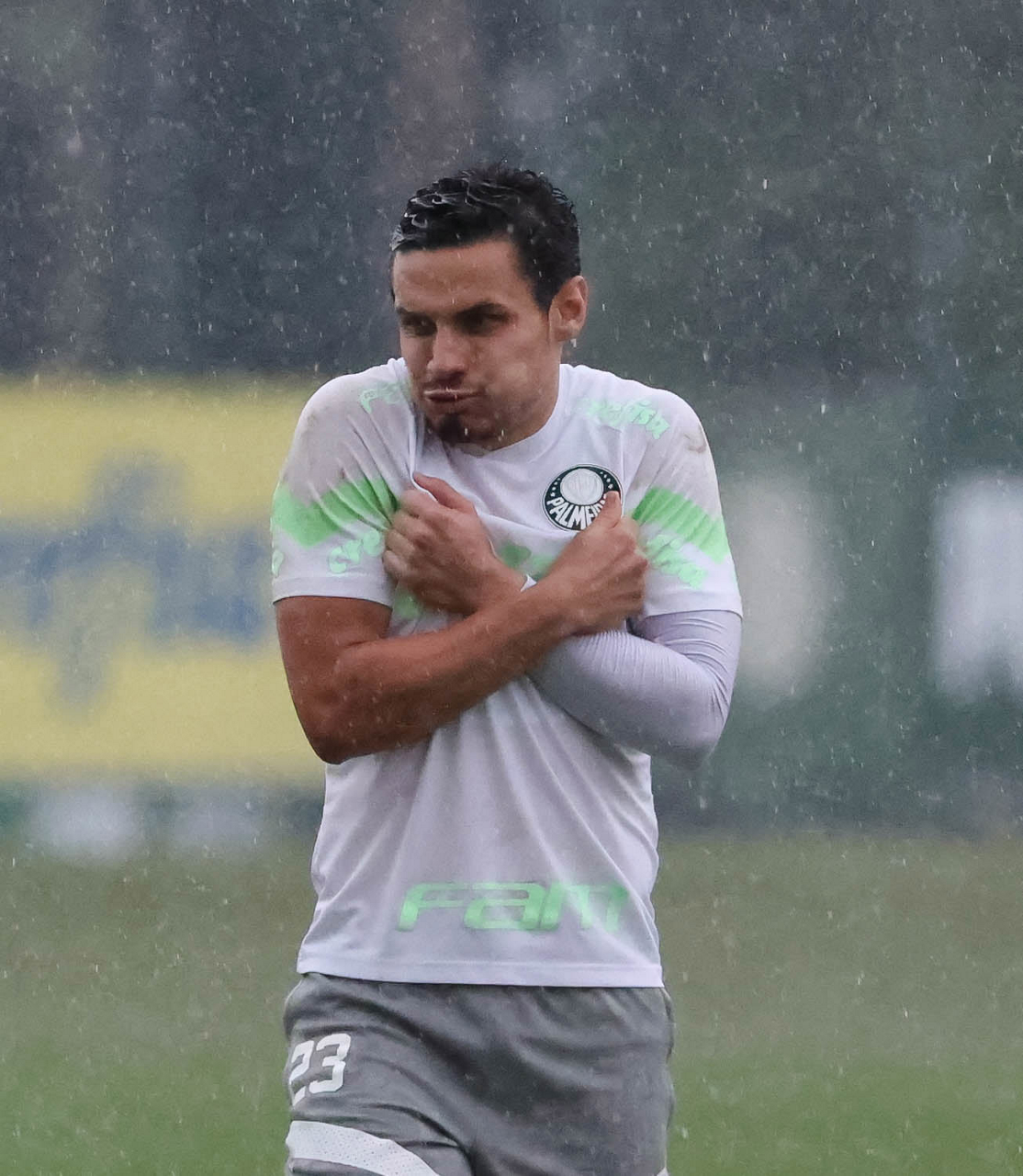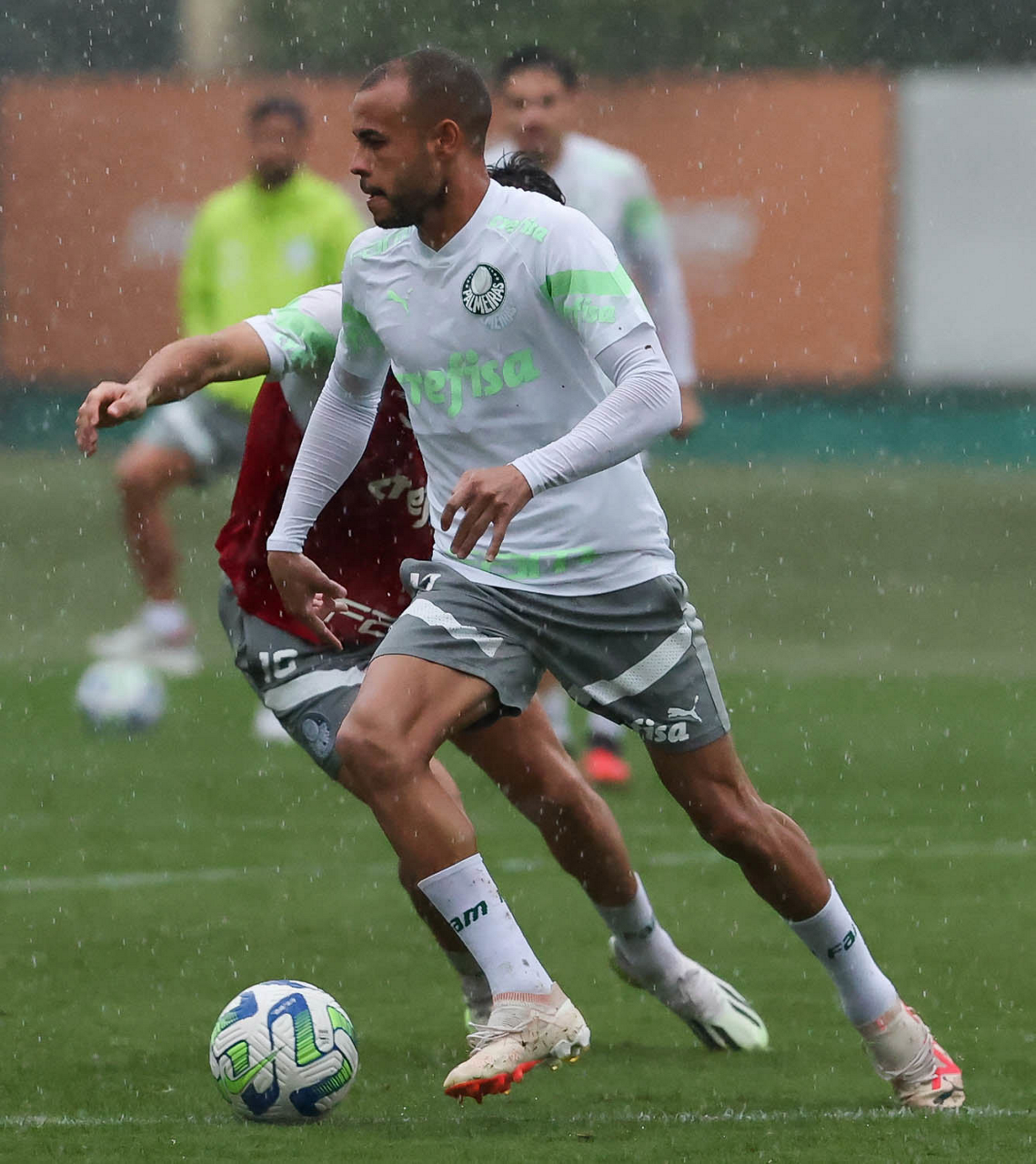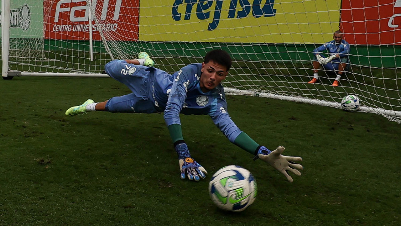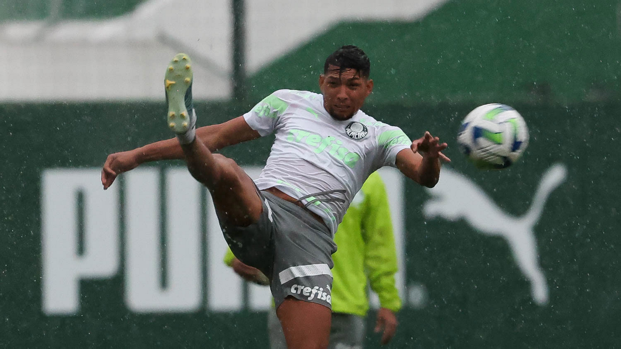 Os jogadores Eduard Atuesta, Luis Guilherme, Fabinho, Gustavo Gómez, Naves, Flaco López, Joaquín Piquerez, Garcia e Mateus (E/D em pé), Endrick, Richard Ríos, Jhonatan, Vanderlan, Weverton e Sá (E/D agachados) e o auxiliar técnico Andrey Lopes (C), da SE Palmeiras, durante treinamento, na Academia de Futebol. (Foto: Cesar Greco/Palmeiras/by Canon)