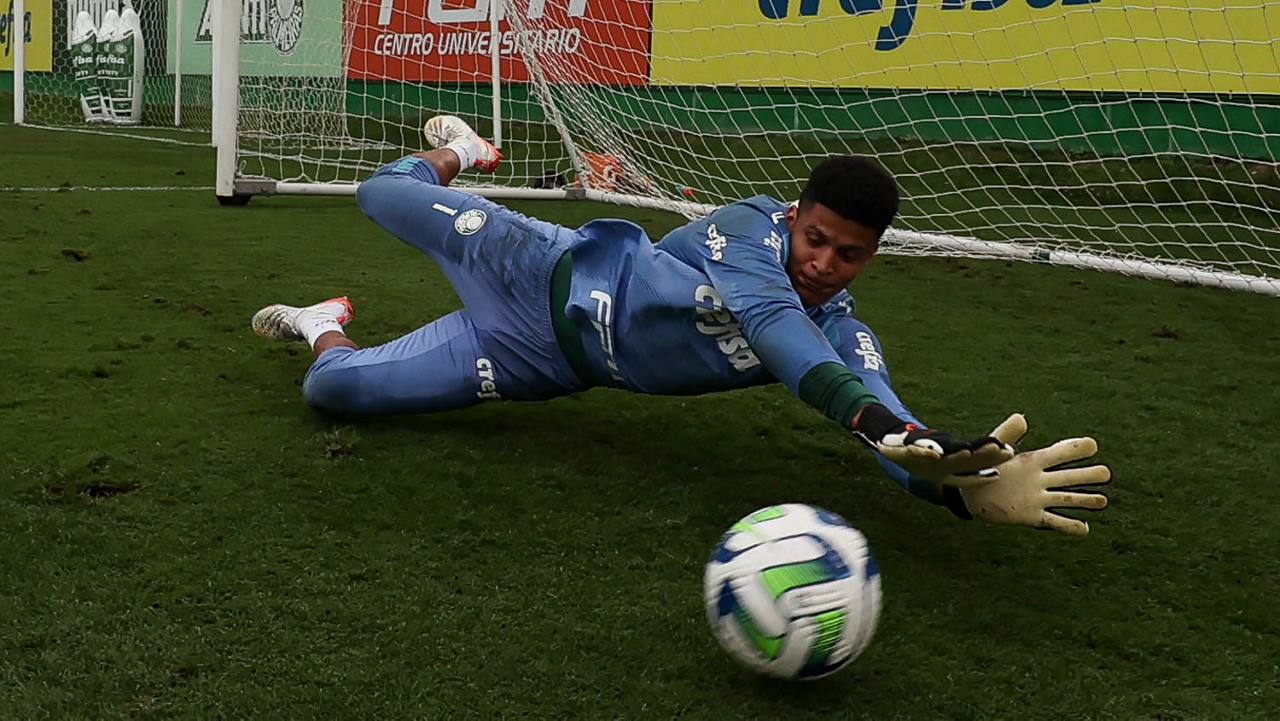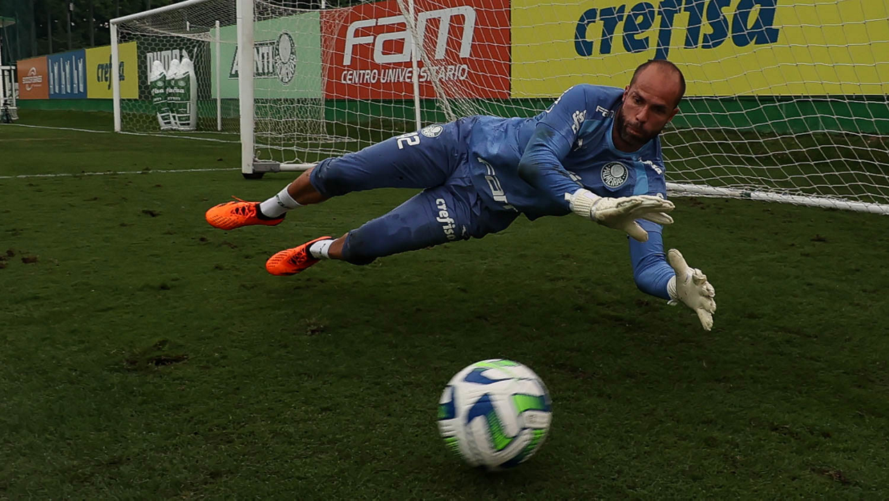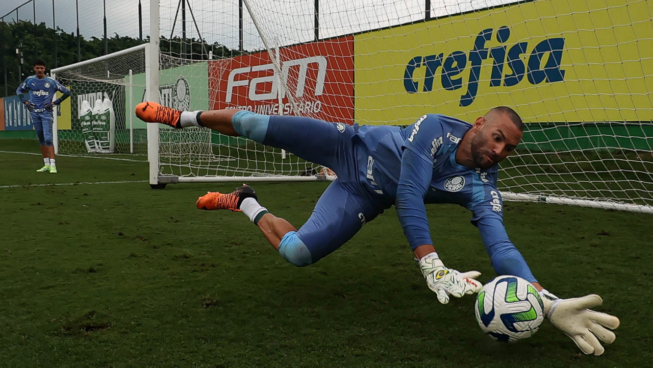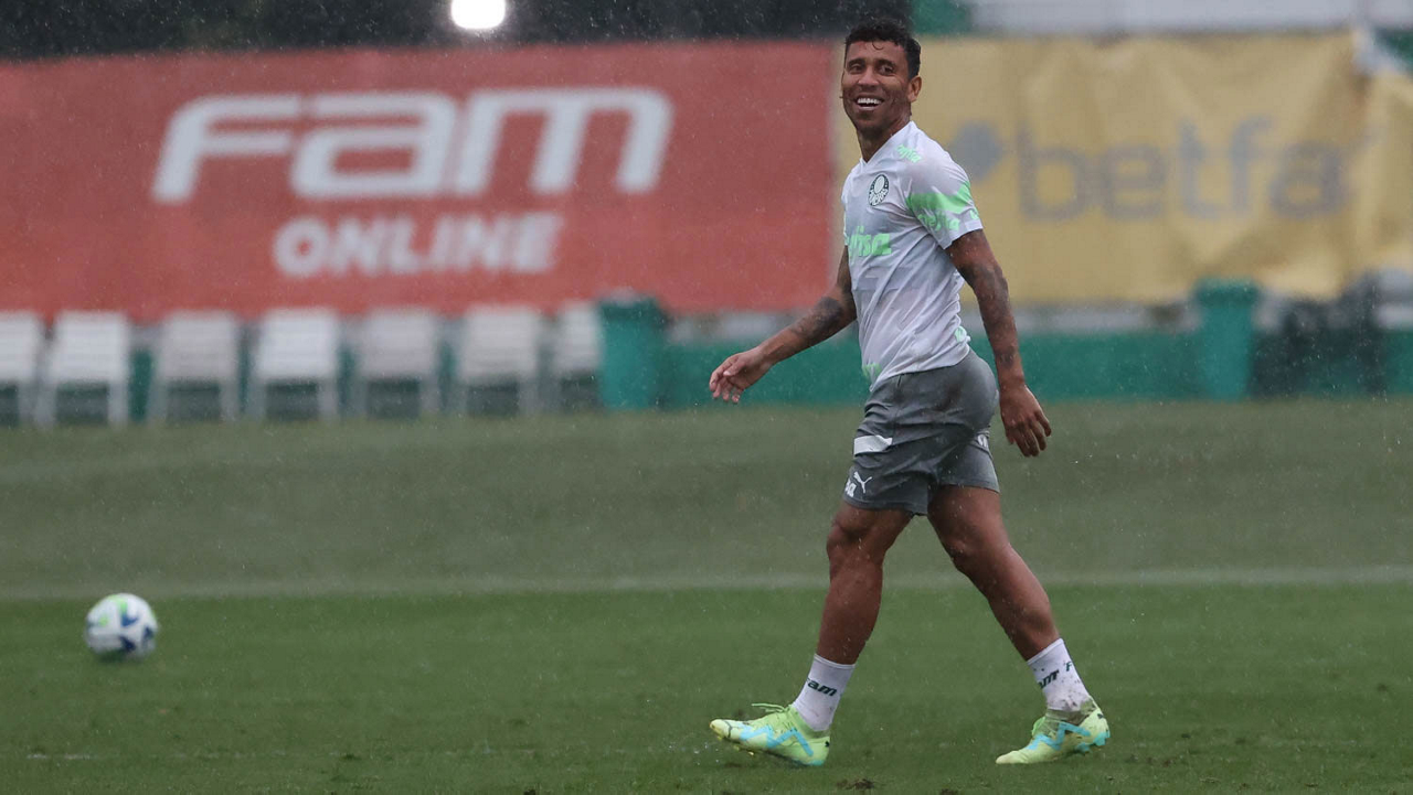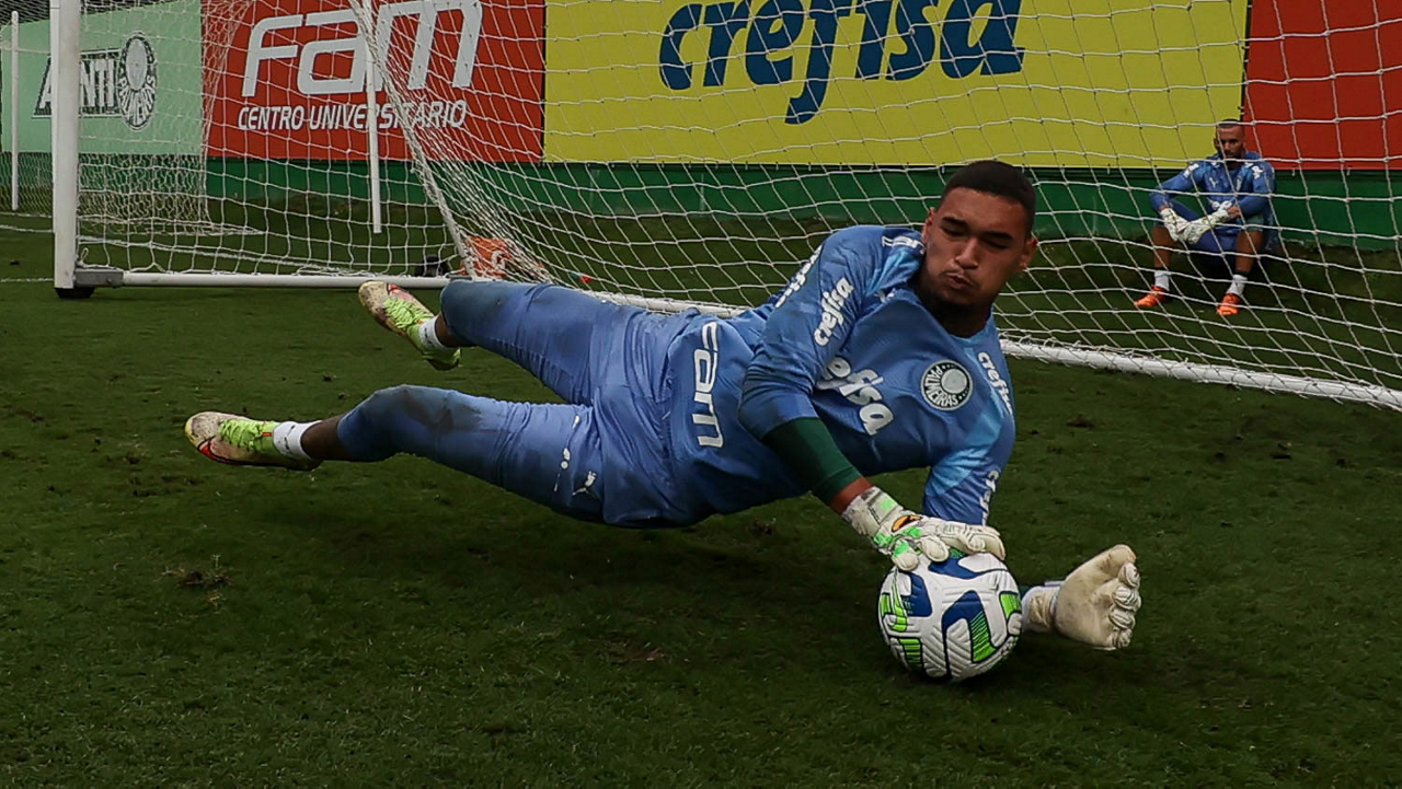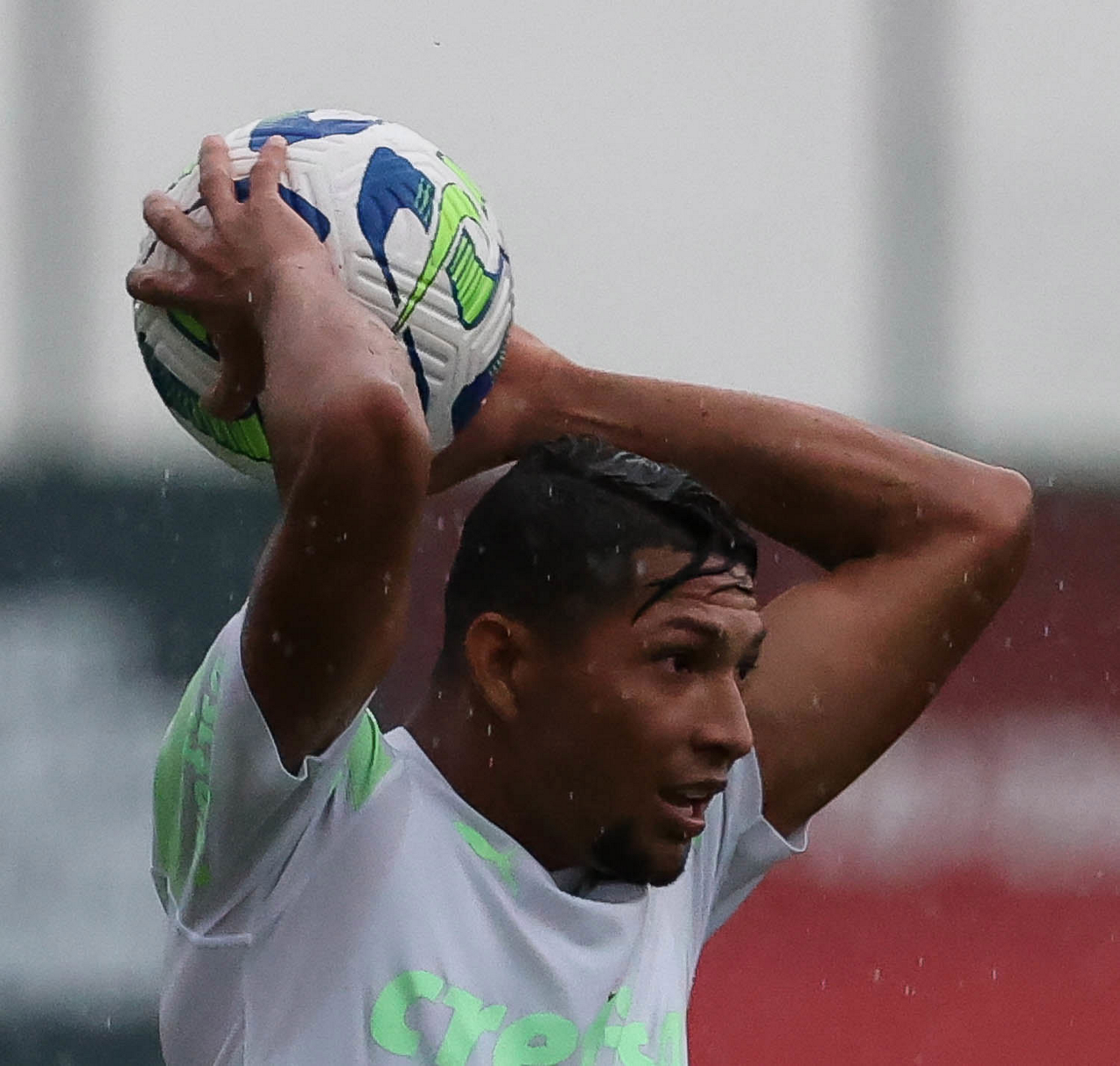 Os jogadores Eduard Atuesta, Luis Guilherme, Fabinho, Gustavo Gómez, Naves, Flaco López, Joaquín Piquerez, Garcia e Mateus (E/D em pé), Endrick, Richard Ríos, Jhonatan, Vanderlan, Weverton e Sá (E/D agachados) e o auxiliar técnico Andrey Lopes (C), da SE Palmeiras, durante treinamento, na Academia de Futebol. (Foto: Cesar Greco/Palmeiras/by Canon)