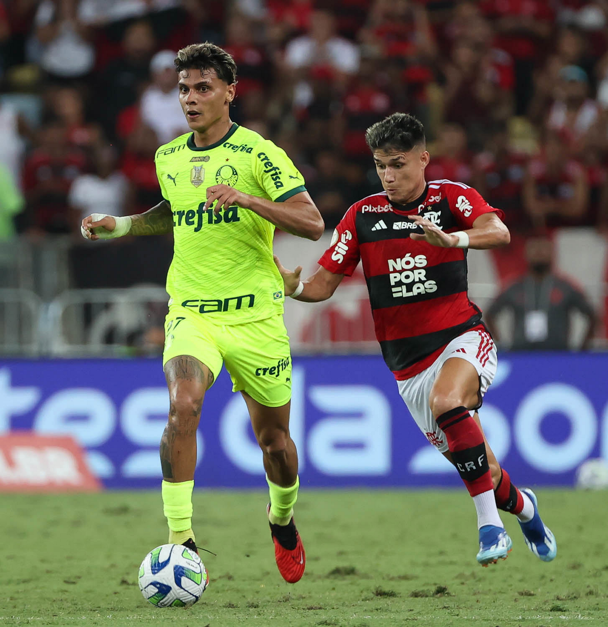O jogador Richard Ríos, da SE Palmeiras, disputa bola com o jogador do CR Flamengo, durante partida válida pela trigésima terceira rodada, do Campeonato Brasileiro, Série A, no Estádio Maracanã. (Foto: Cesar Greco/Palmeiras/by Canon)