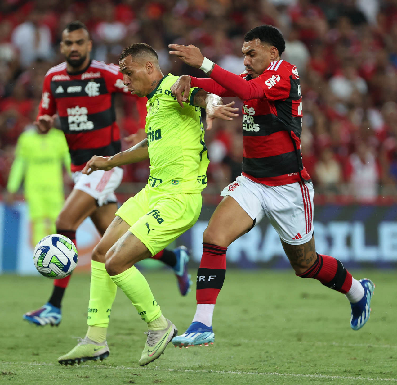 O jogador Endrick, da SE Palmeiras, disputa bola com o jogador do CR Flamengo, durante partida válida pela trigésima terceira rodada, do Campeonato Brasileiro, Série A, no Estádio Maracanã. (Foto: Cesar Greco/Palmeiras/by Canon)
