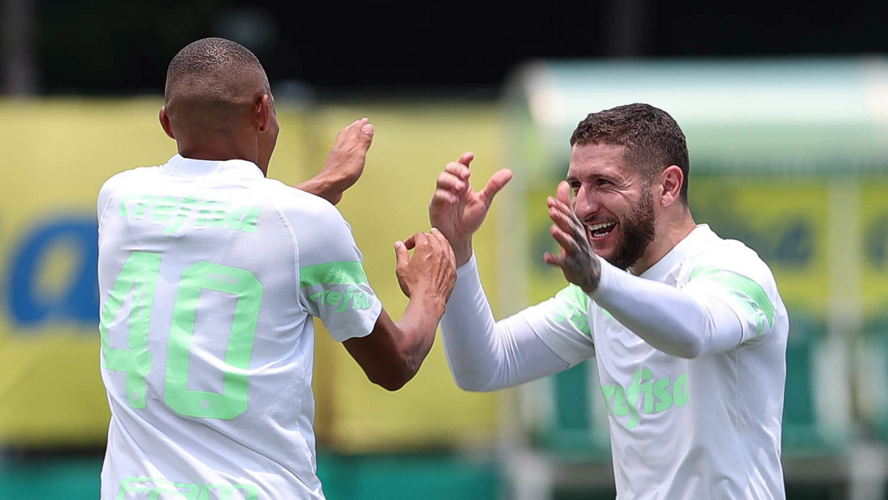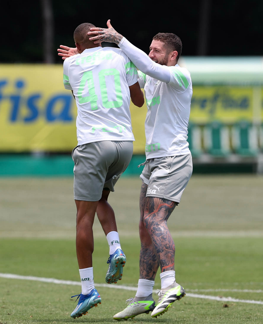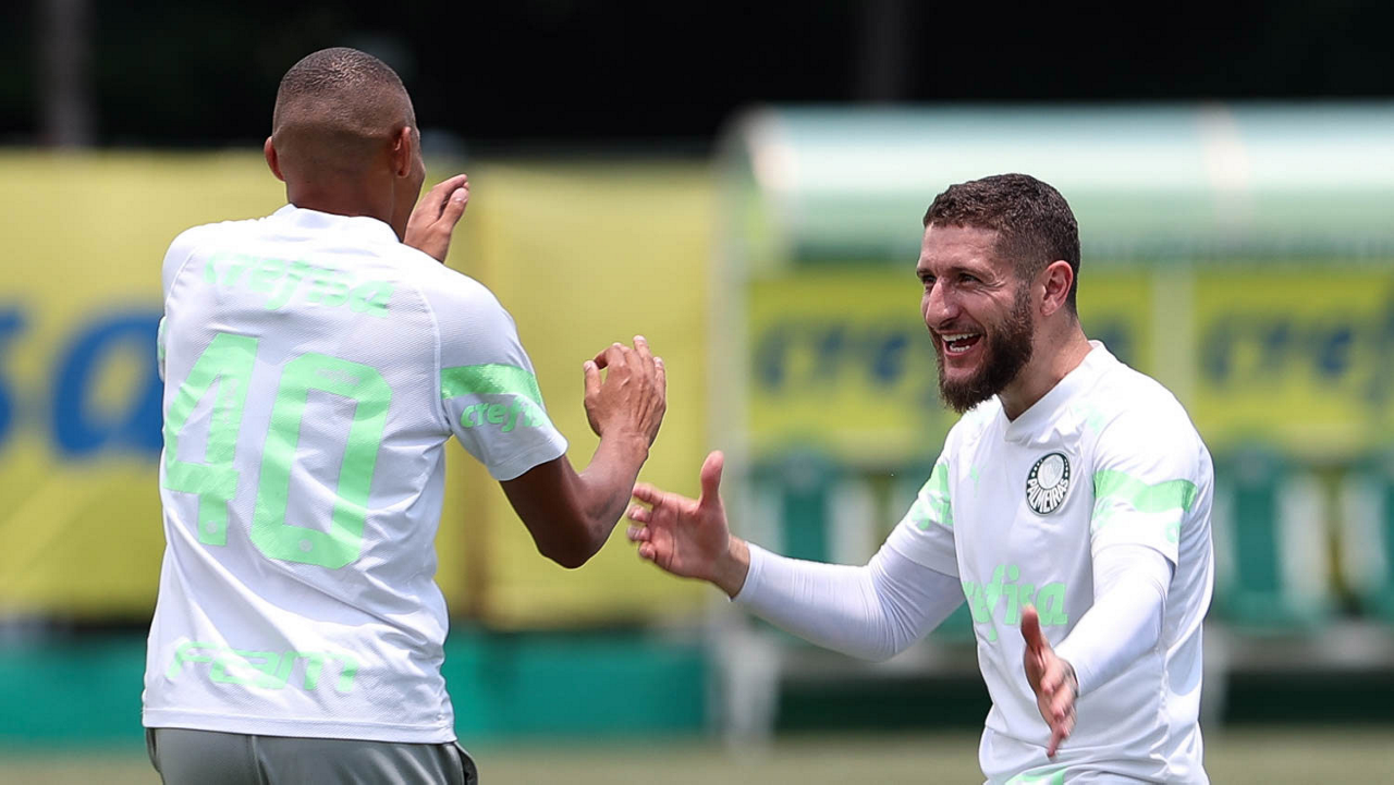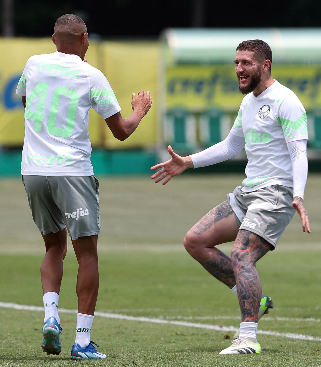 Os jogadores Jhonatan e Zé Rafael (D), da SE Palmeiras, durante treinamento, na Academia de Futebol. (Foto: Cesar Greco/Palmeiras/by Canon)